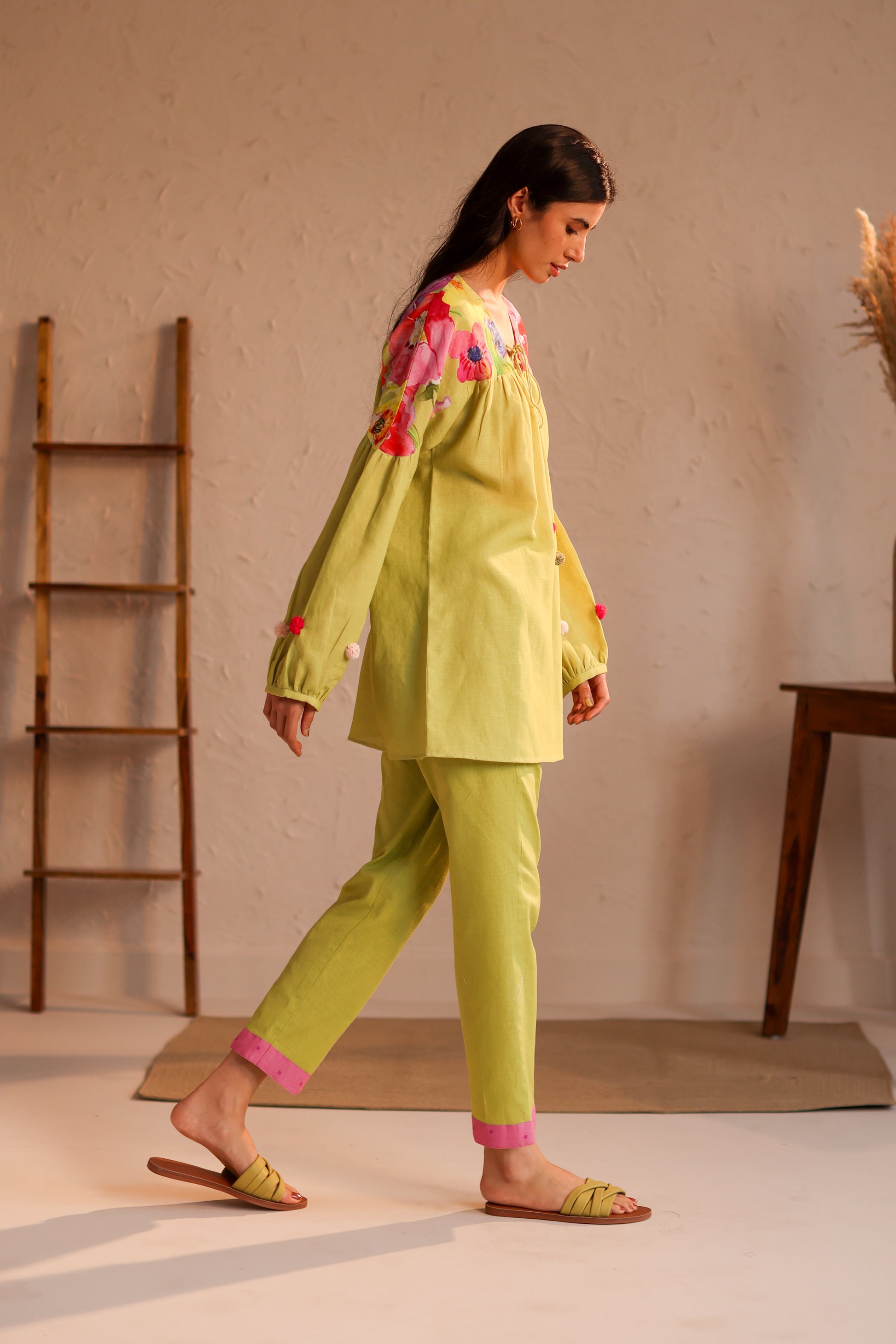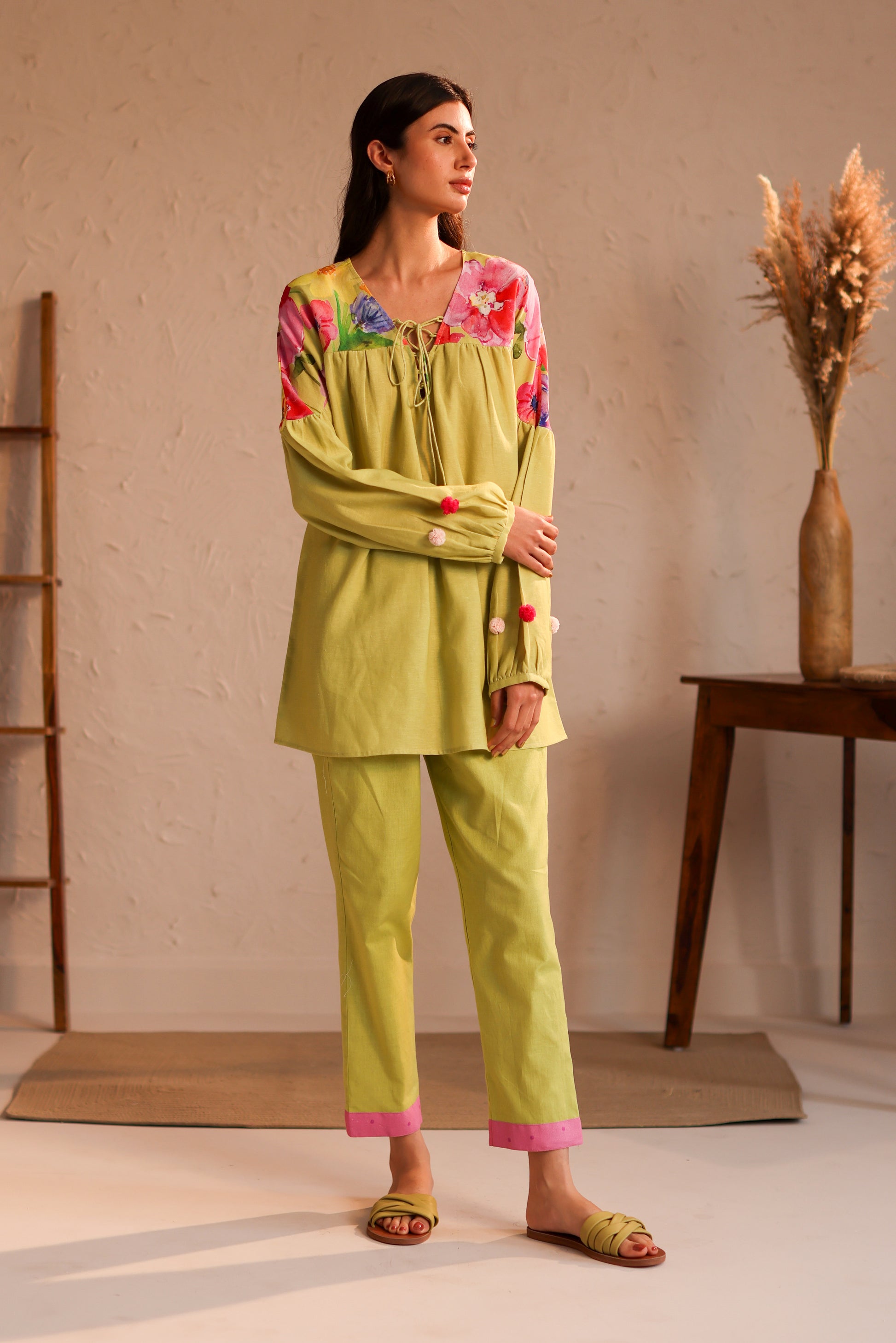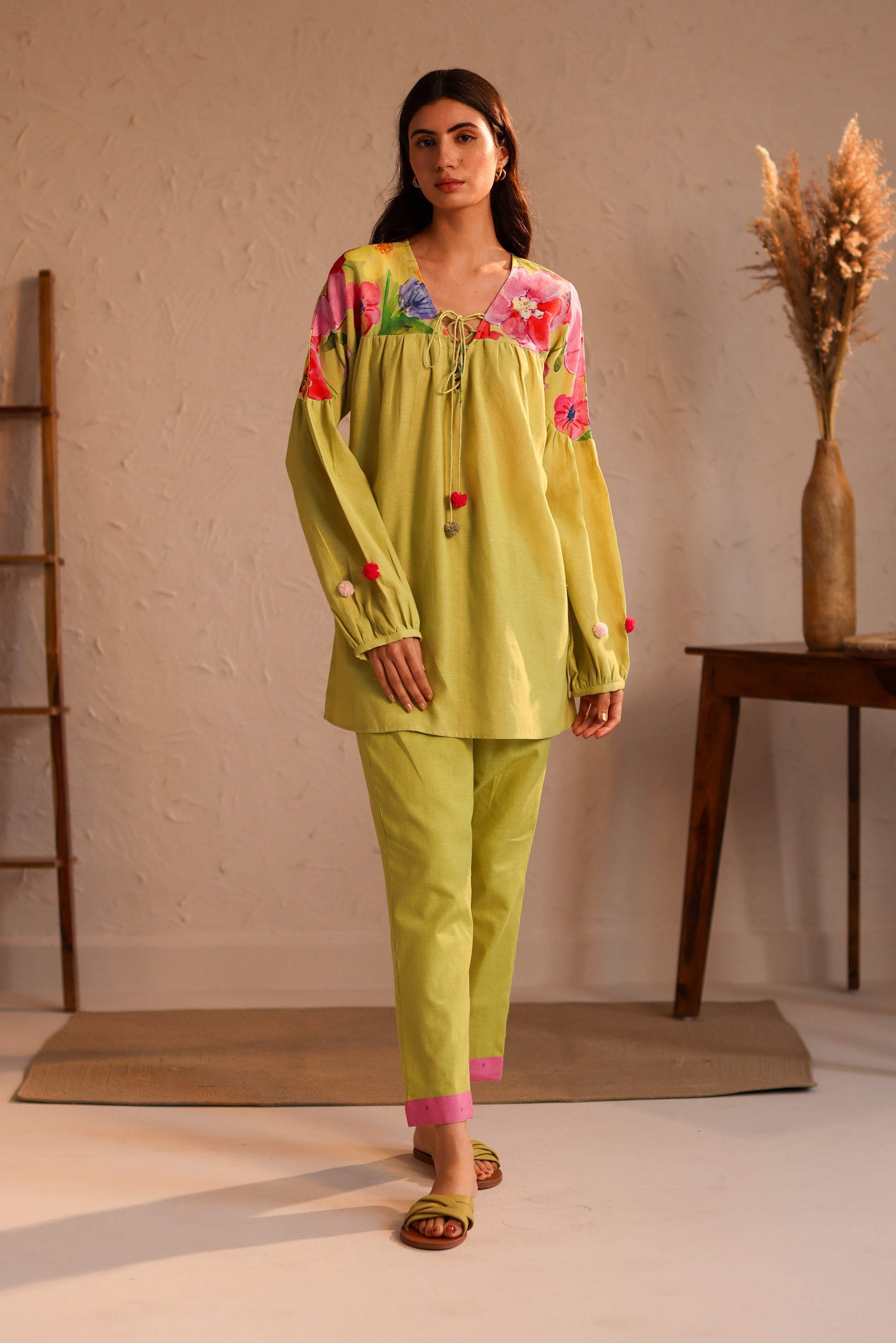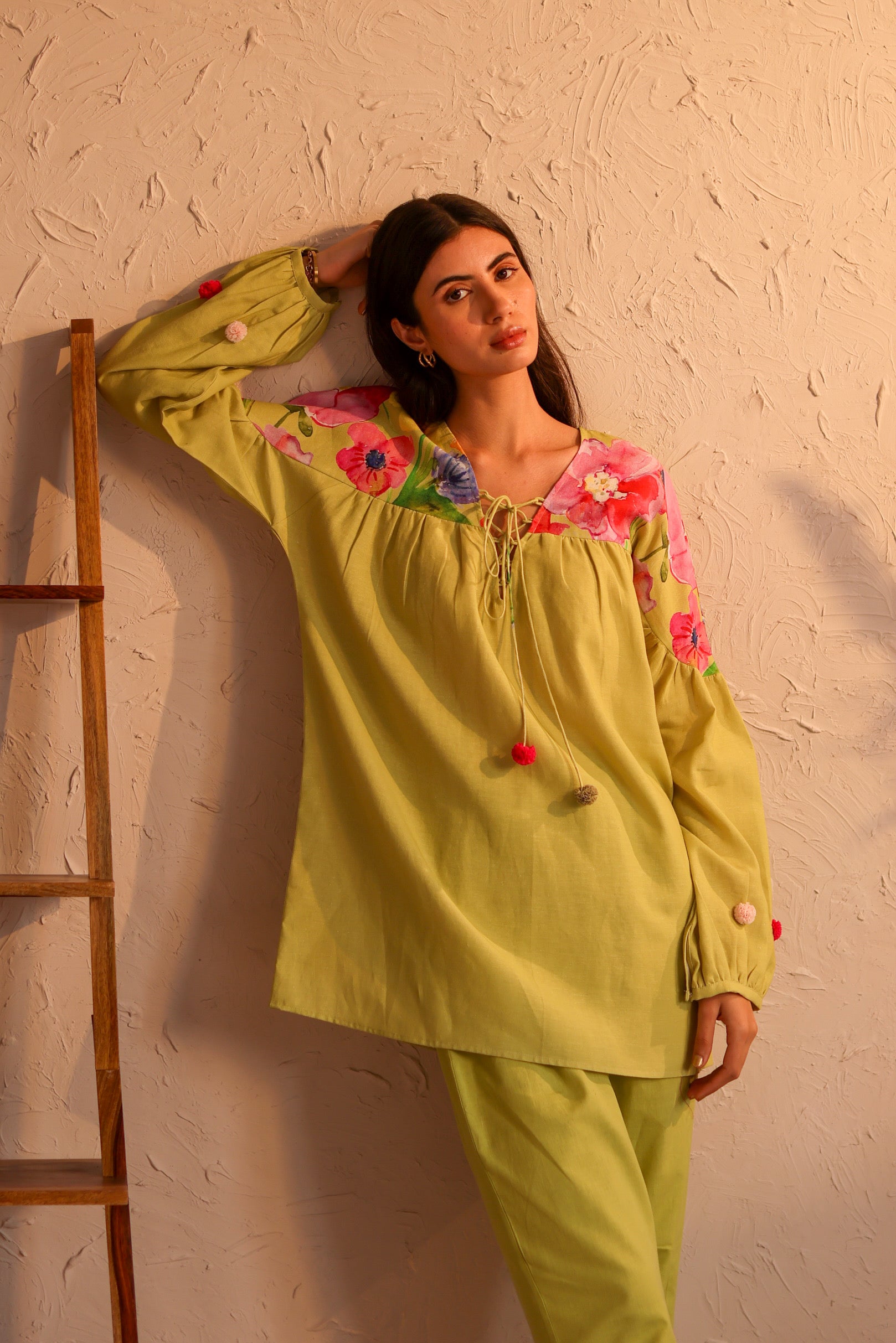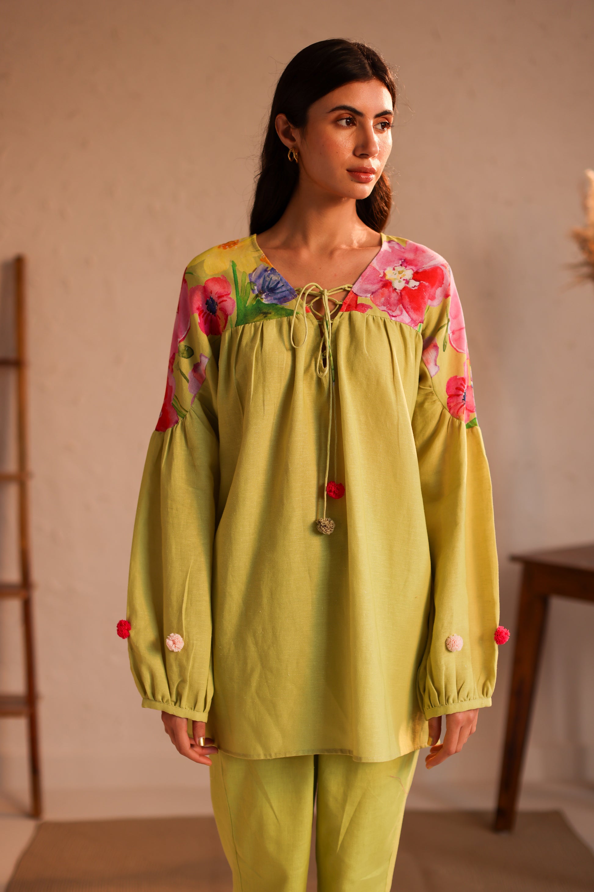 Medium length linen tunic in a comfort fit with a watercolour yoke with a pleated fall and a drawstring for an easy fit.