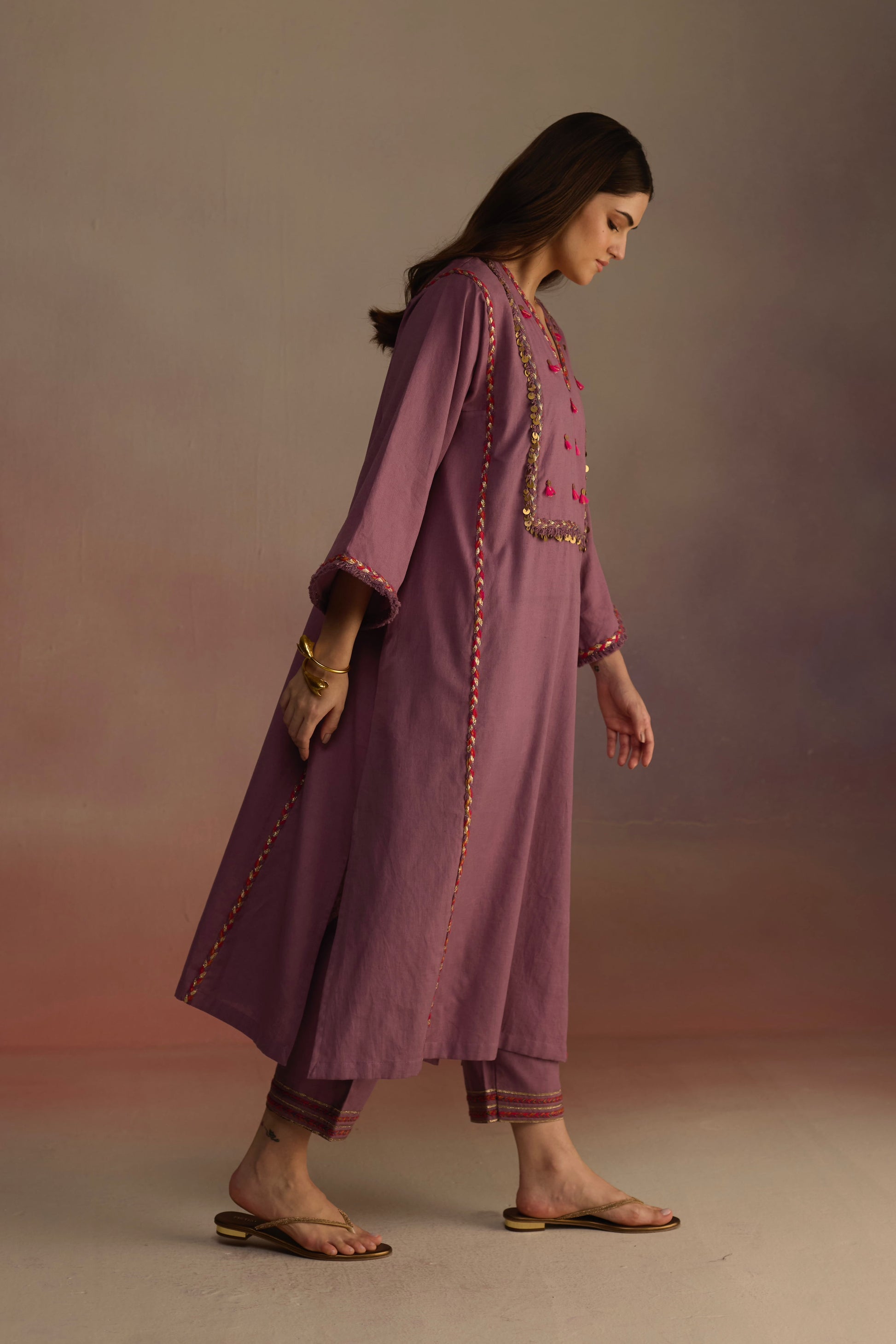 The amber kurta is adorned with hand made dainty tassels and gota accents on the yoke, kurta panel, and cuffs. The front panel has jute and glitter braids across the front. Paired with wide-legged pants featuring gota detailing.