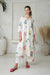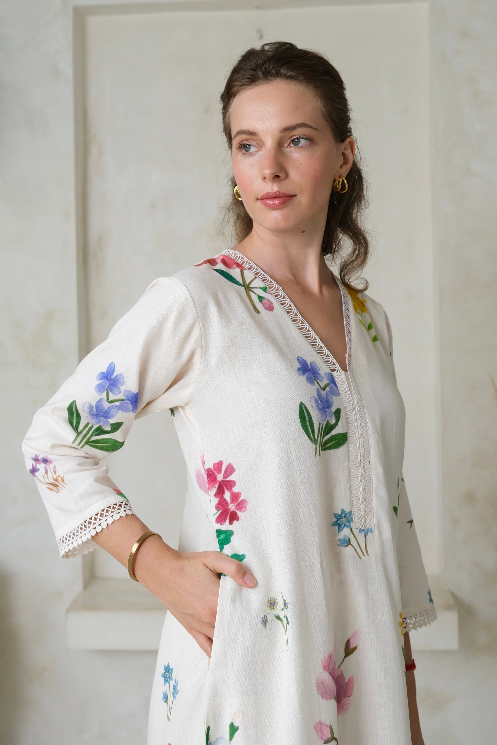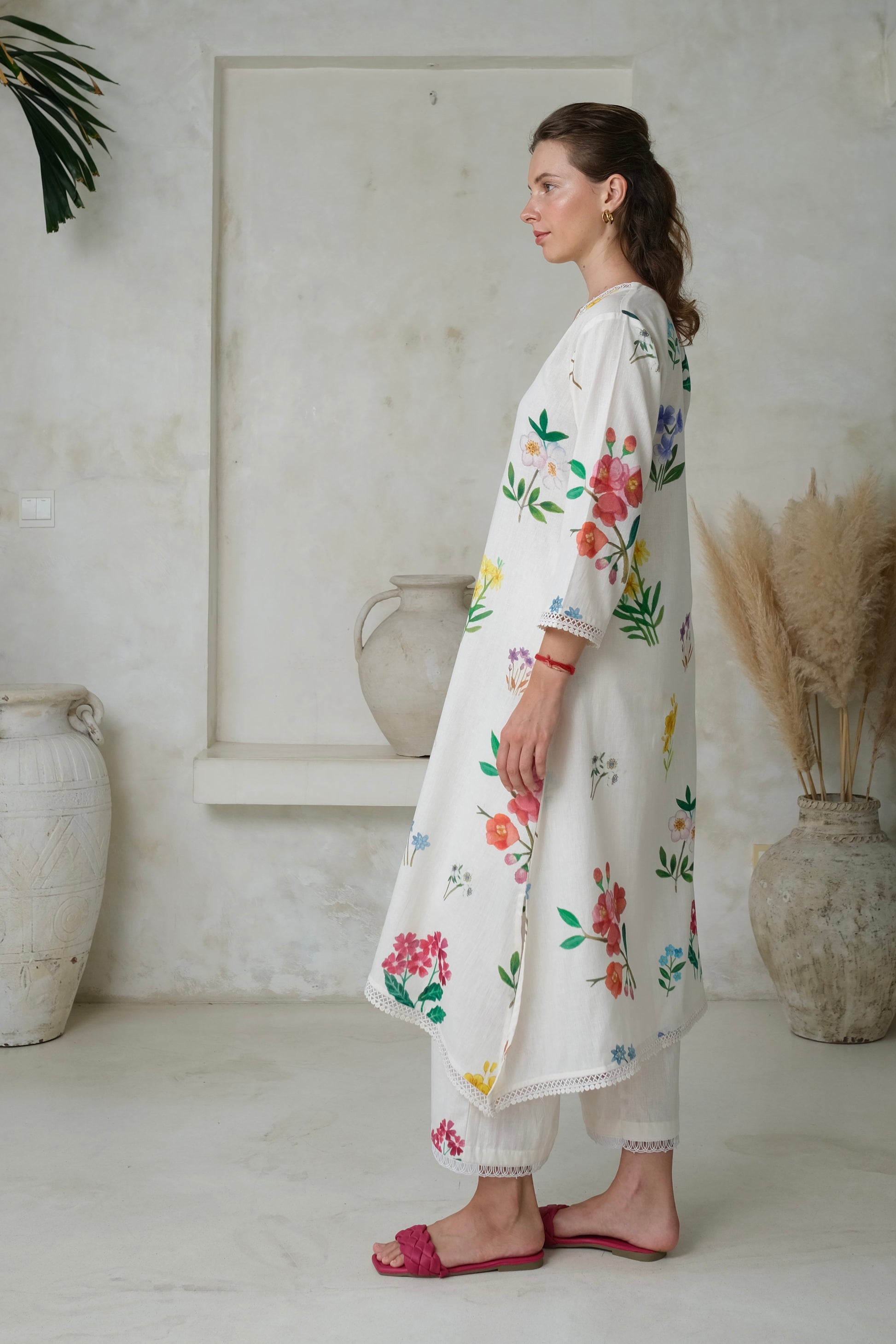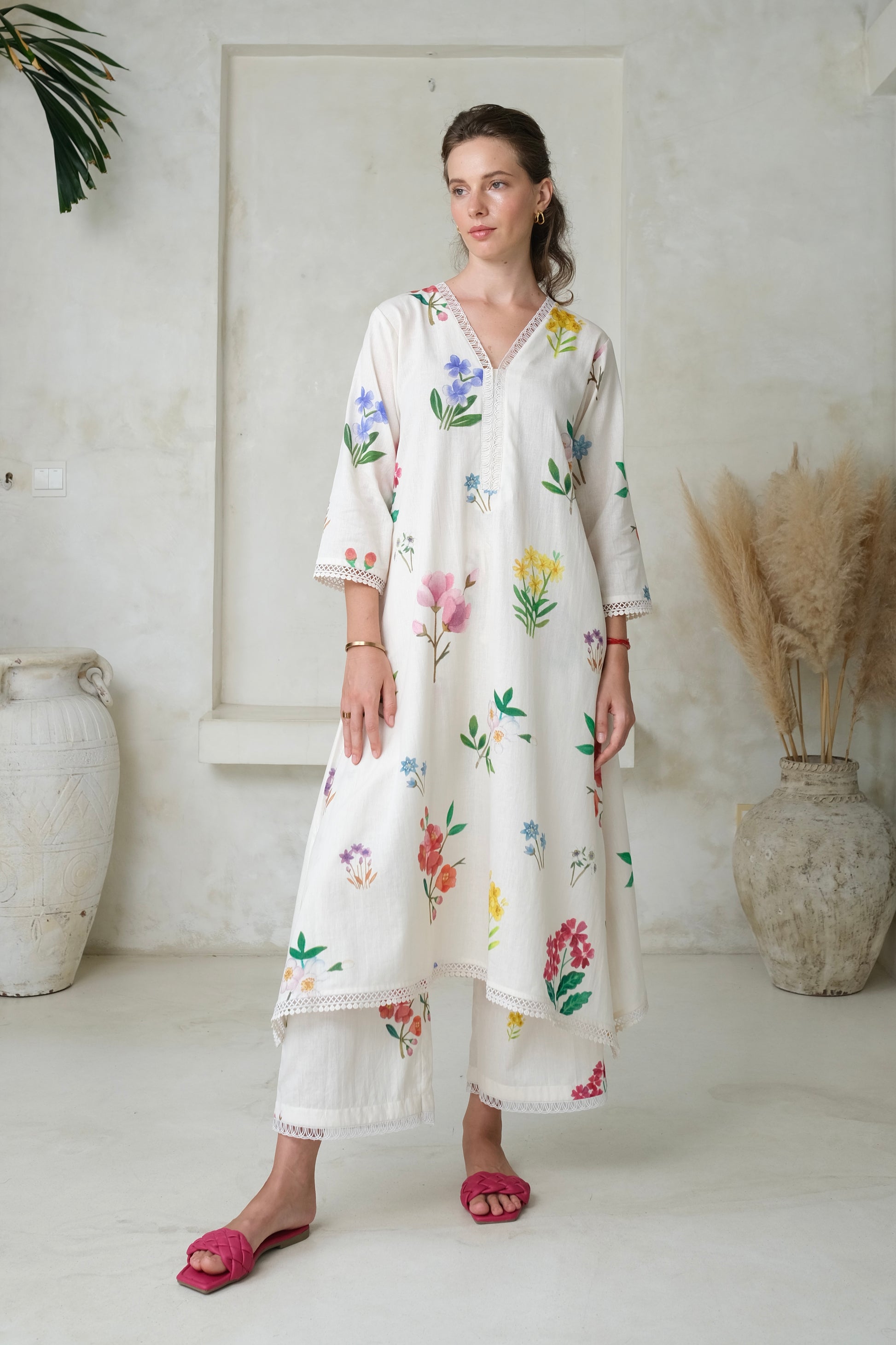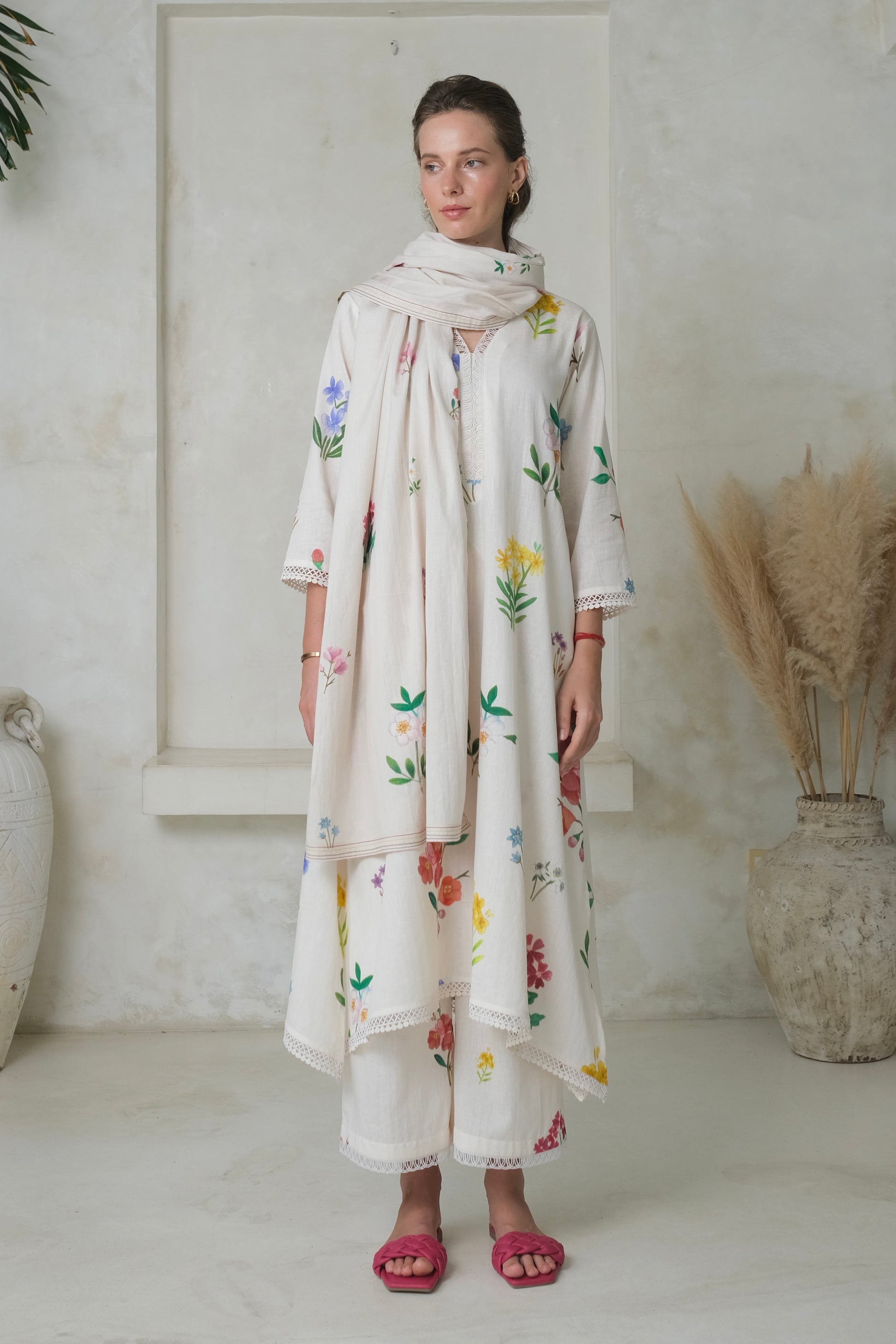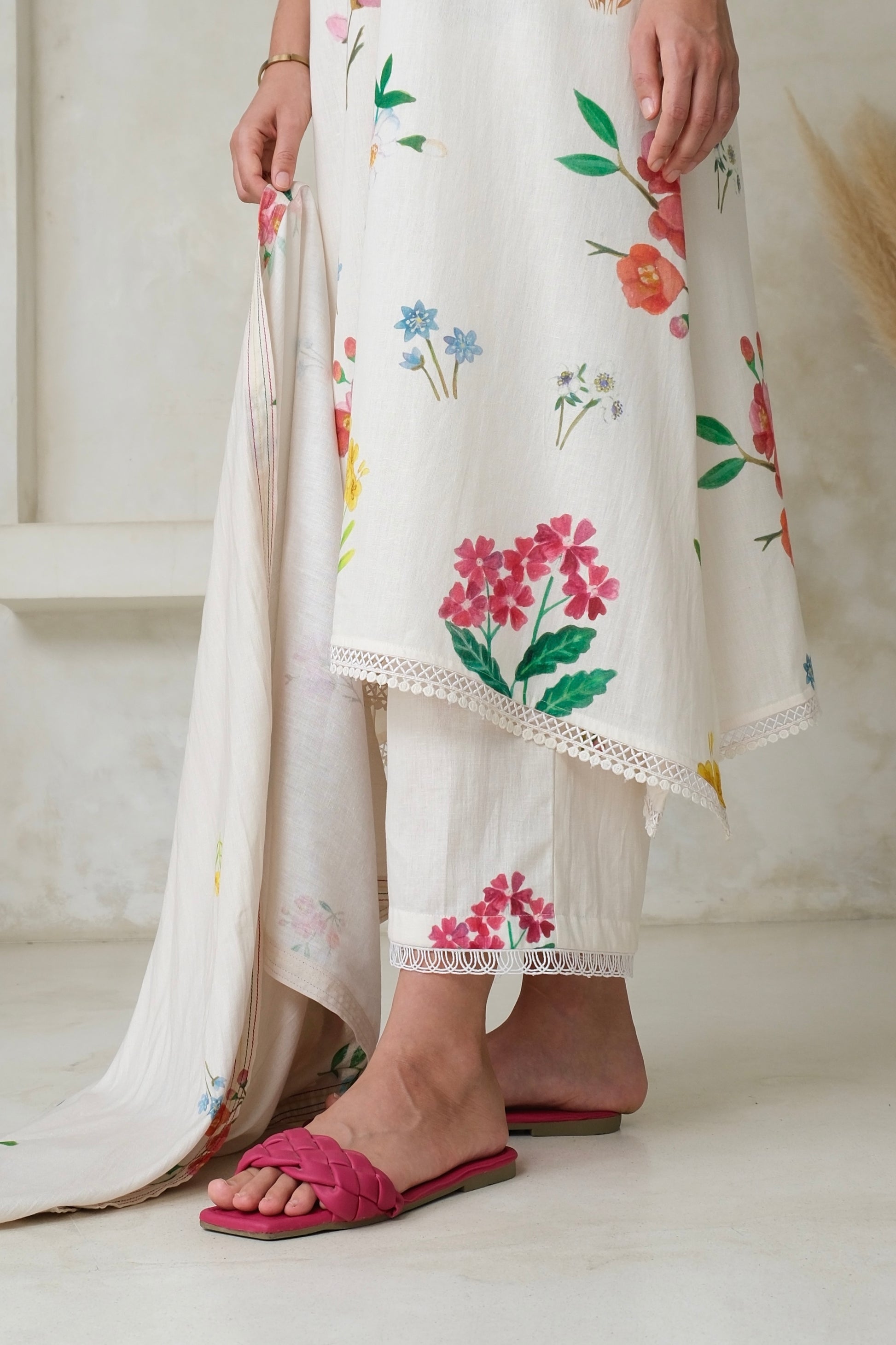 A breezy linen a-line kurta set featuring scattered flowers on both the kurta and pants. This relaxed set is finished with delicate lace trims. Pair the kurta with the straight pants and dupatta for a coordinated look.