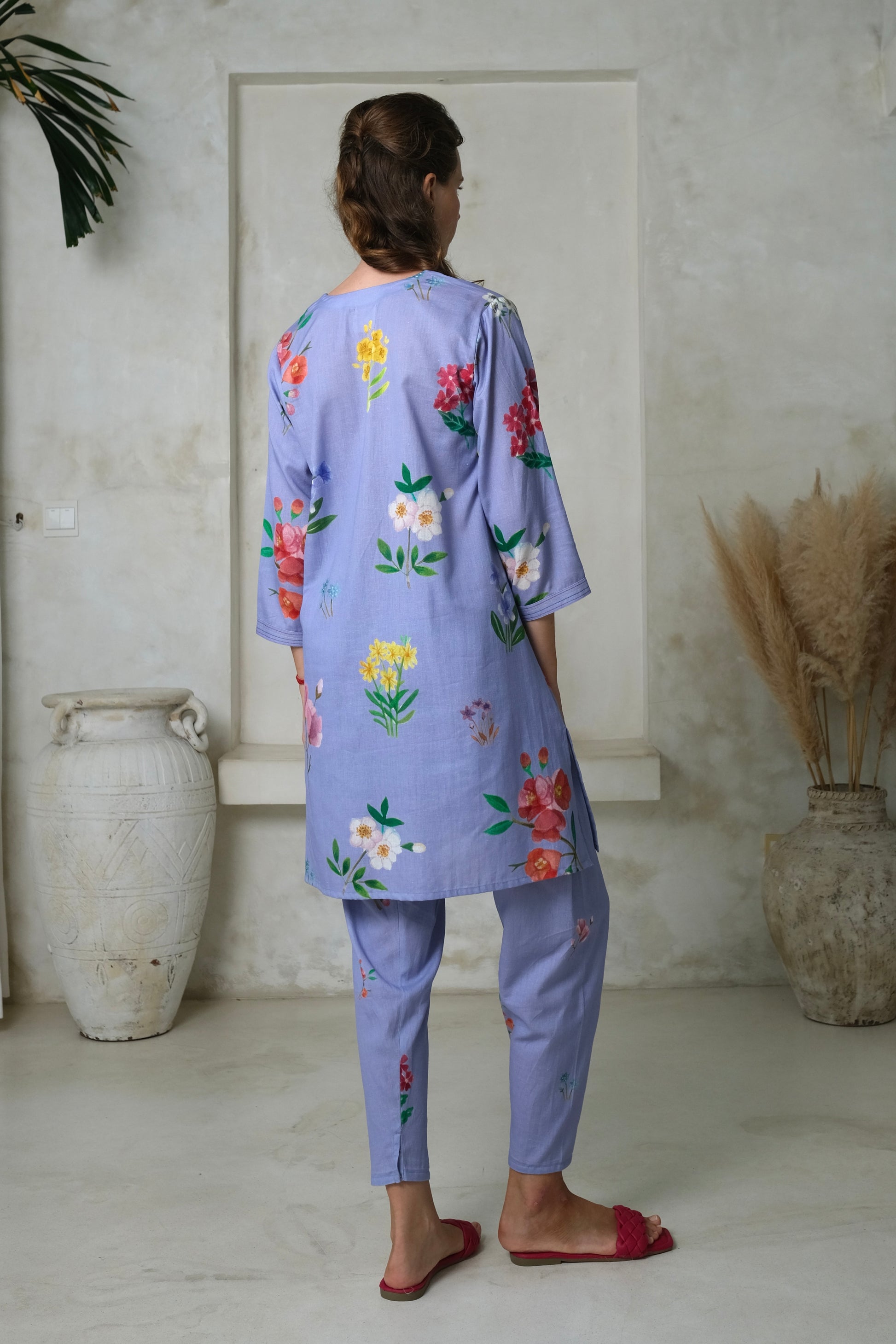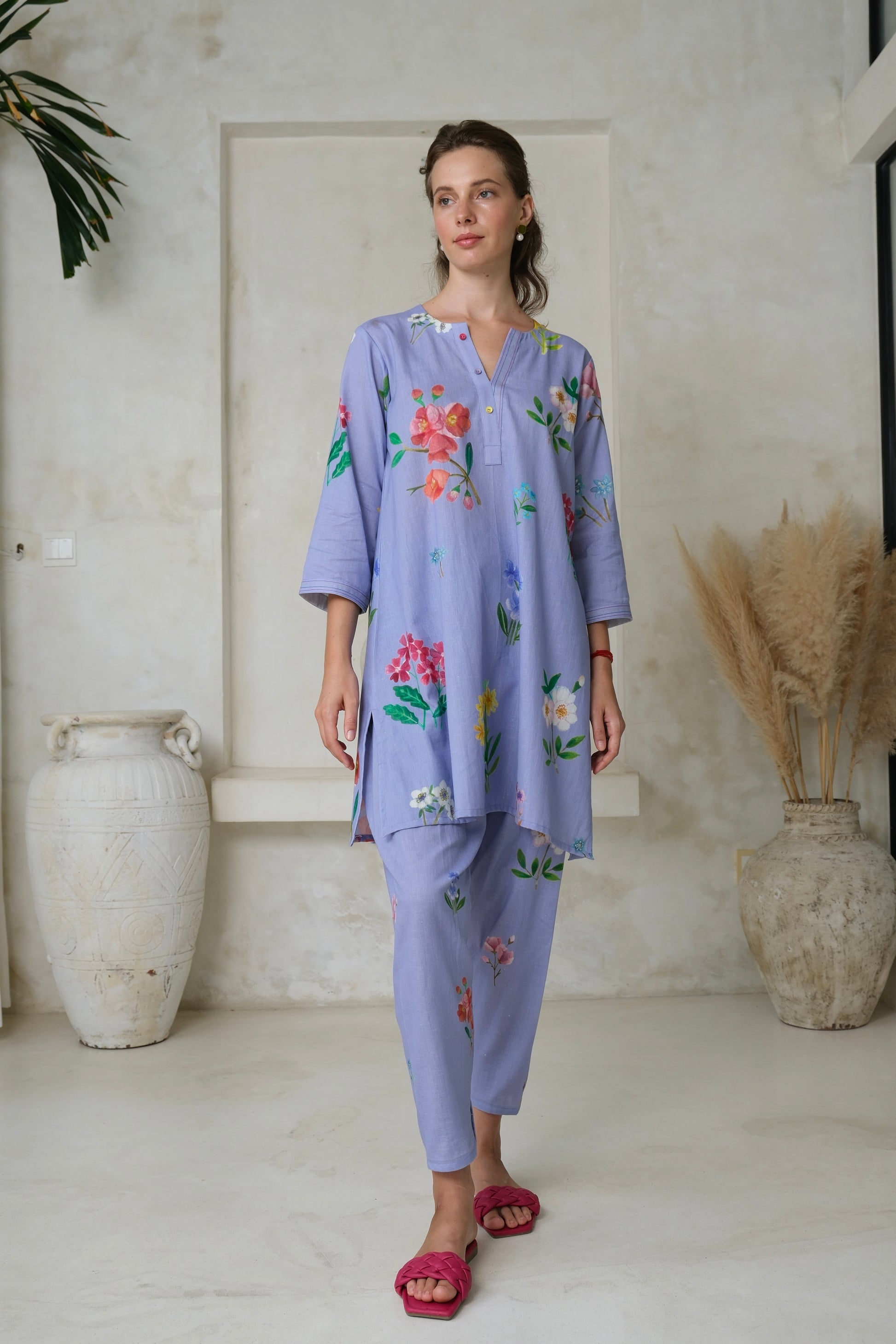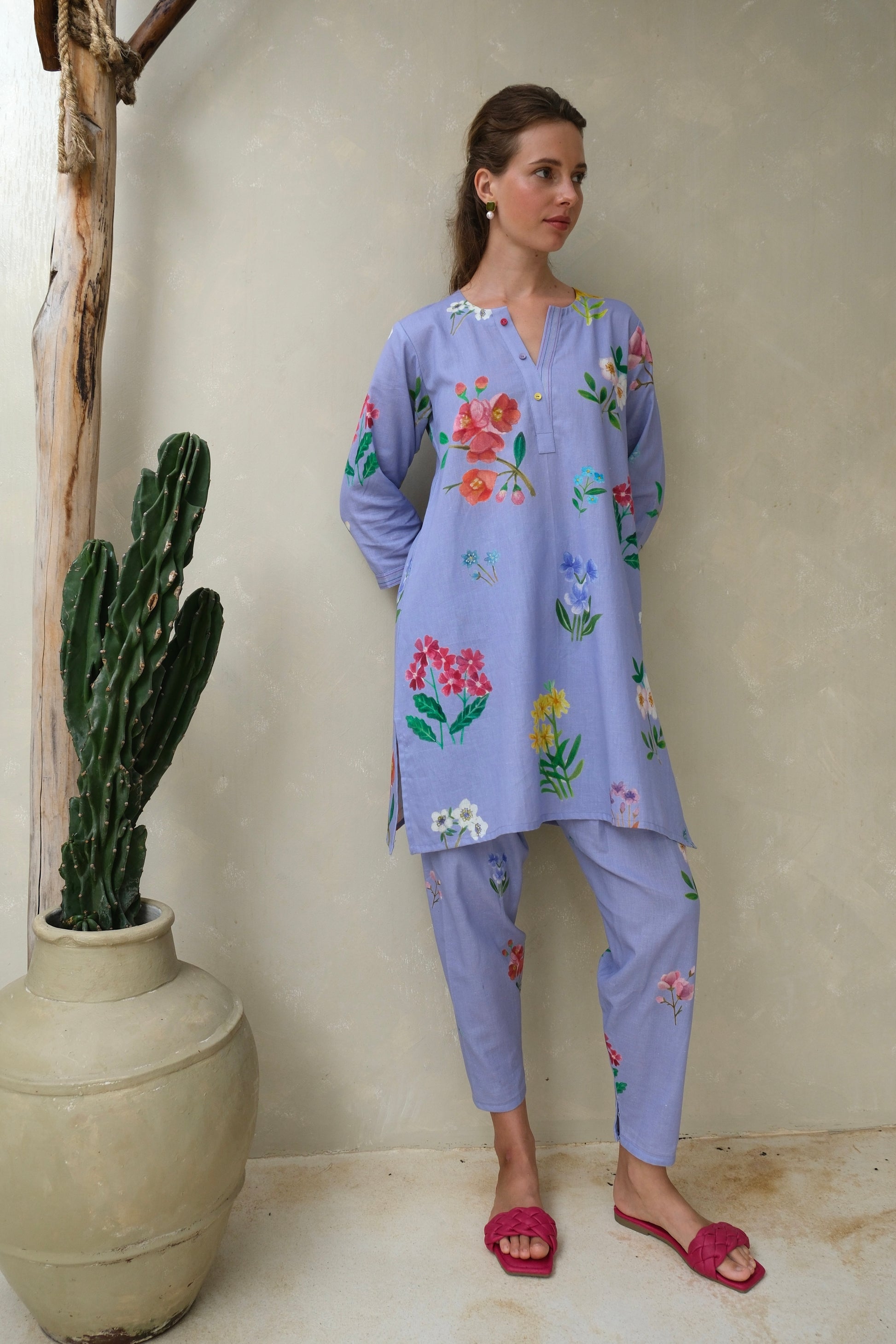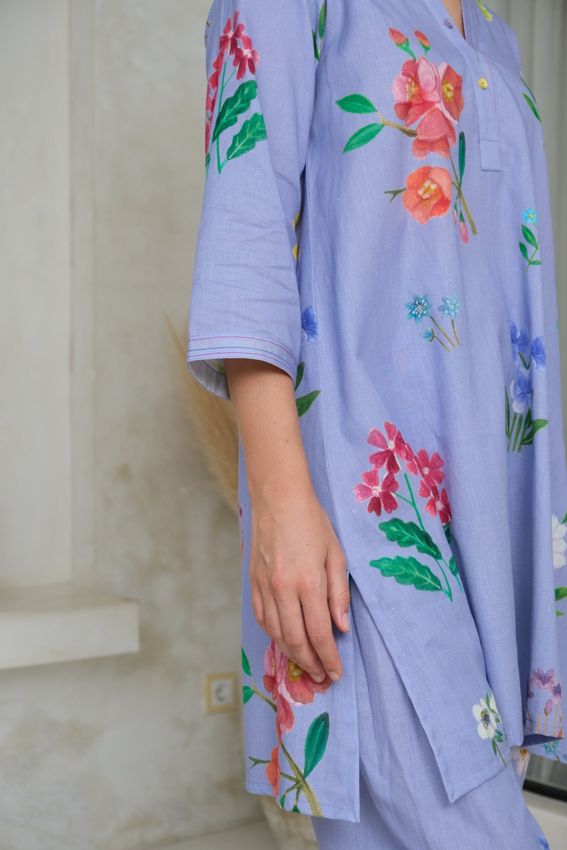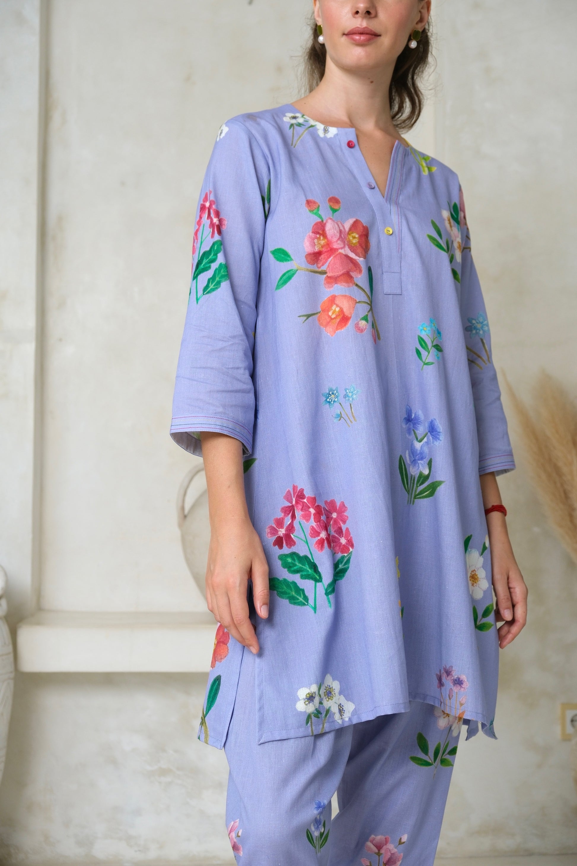 A short linen kurta with dainty handwork in the neck and sleeves paired with tapered pants, this set is adorned with dainty watercolor flowers. An easy to wear co-ord for a casual festive look.