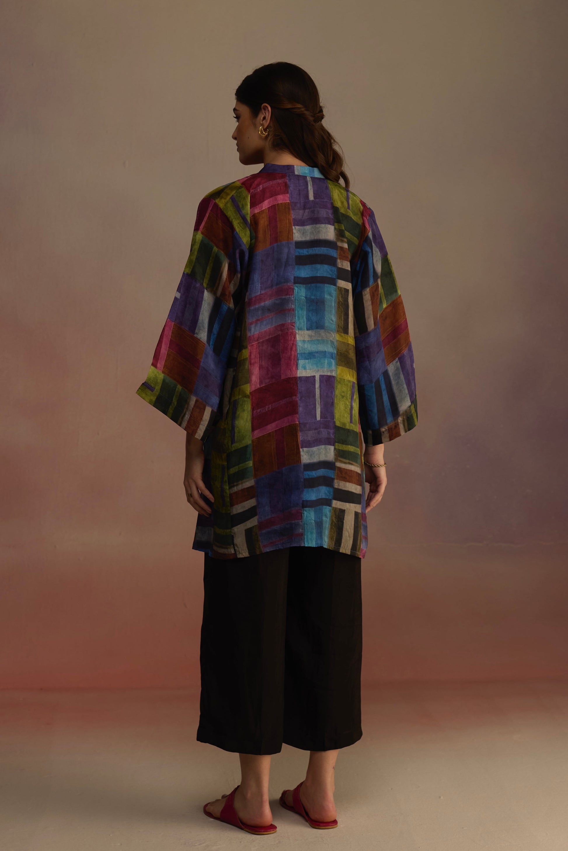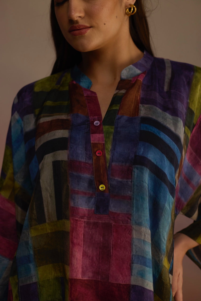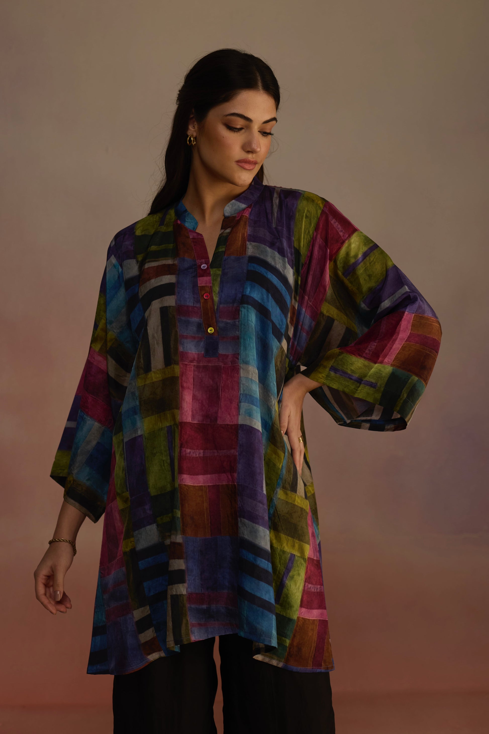 The attico boxy top features a relaxed fit and is adorned with a hand-sketched print inspired by paper piecing, complemented by signature roza buttons. It can be paired with attico pants for a coordinated look.