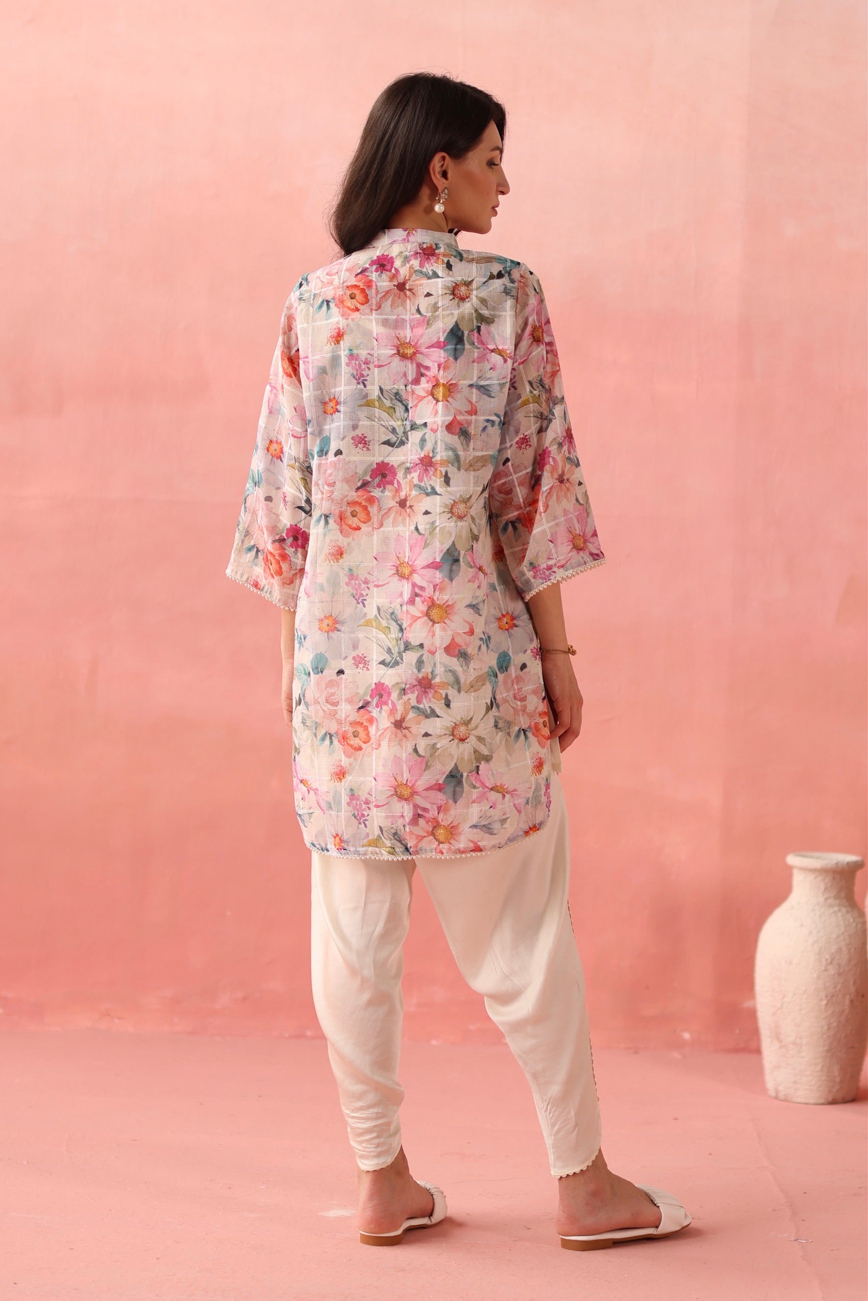 The aurora co-ord set is made with the finest and most lightweight linen fabric. The co-ord set includes a short-length a-line kurta and a laced dhoti pants. The kurta has floral prints with flared sleeves, is adorned with pearl buttons, and has pearl lace outlining on the front, making it a perfect festive pick me up.