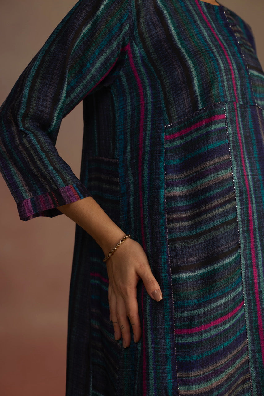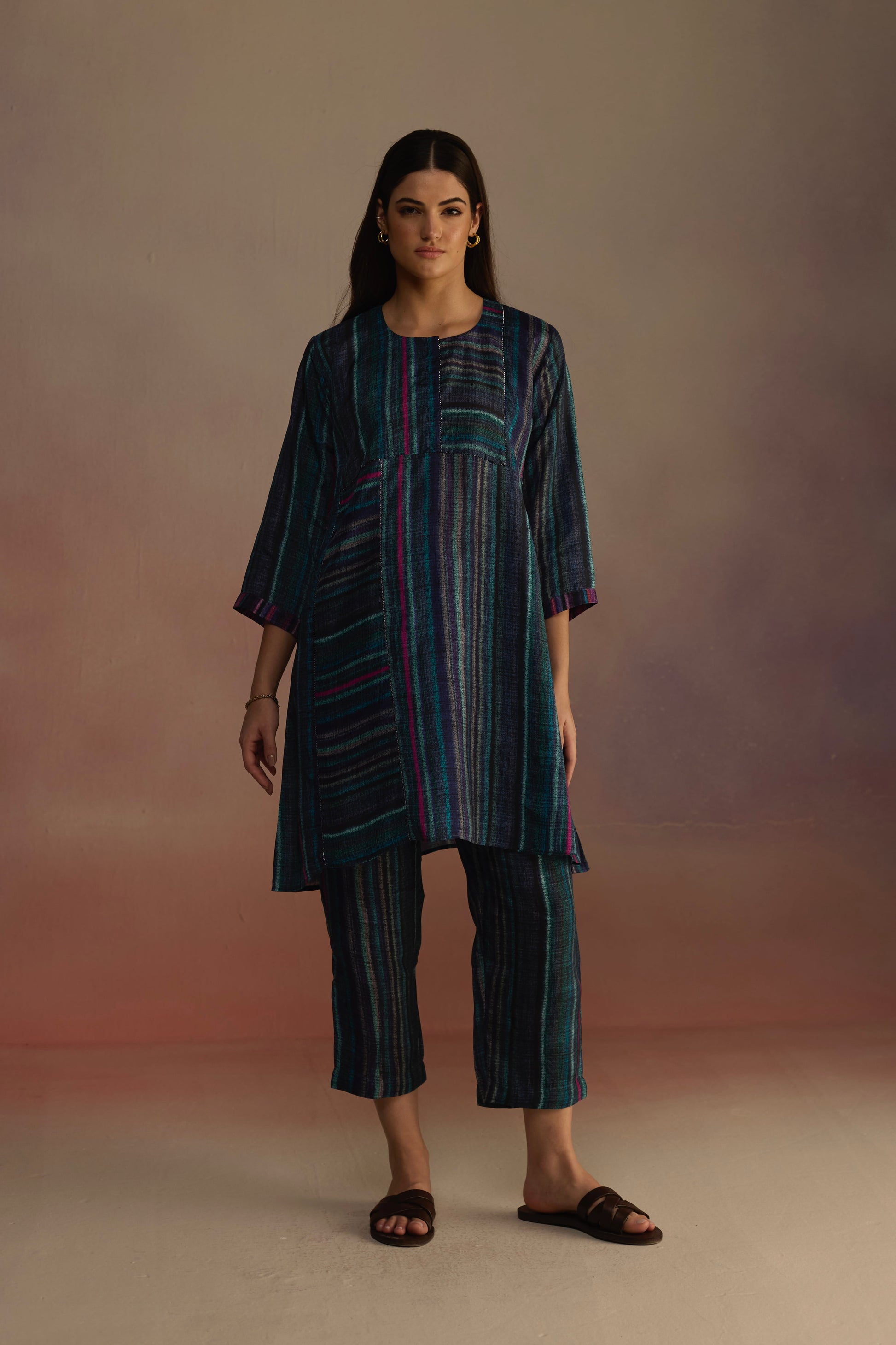 A short a-line kurta crafted in habutai silk, featuring a hand-sketched stripe print in festive hues. The tunic has glitter trims across the front placket. The pants are wide legged for comfort fit.