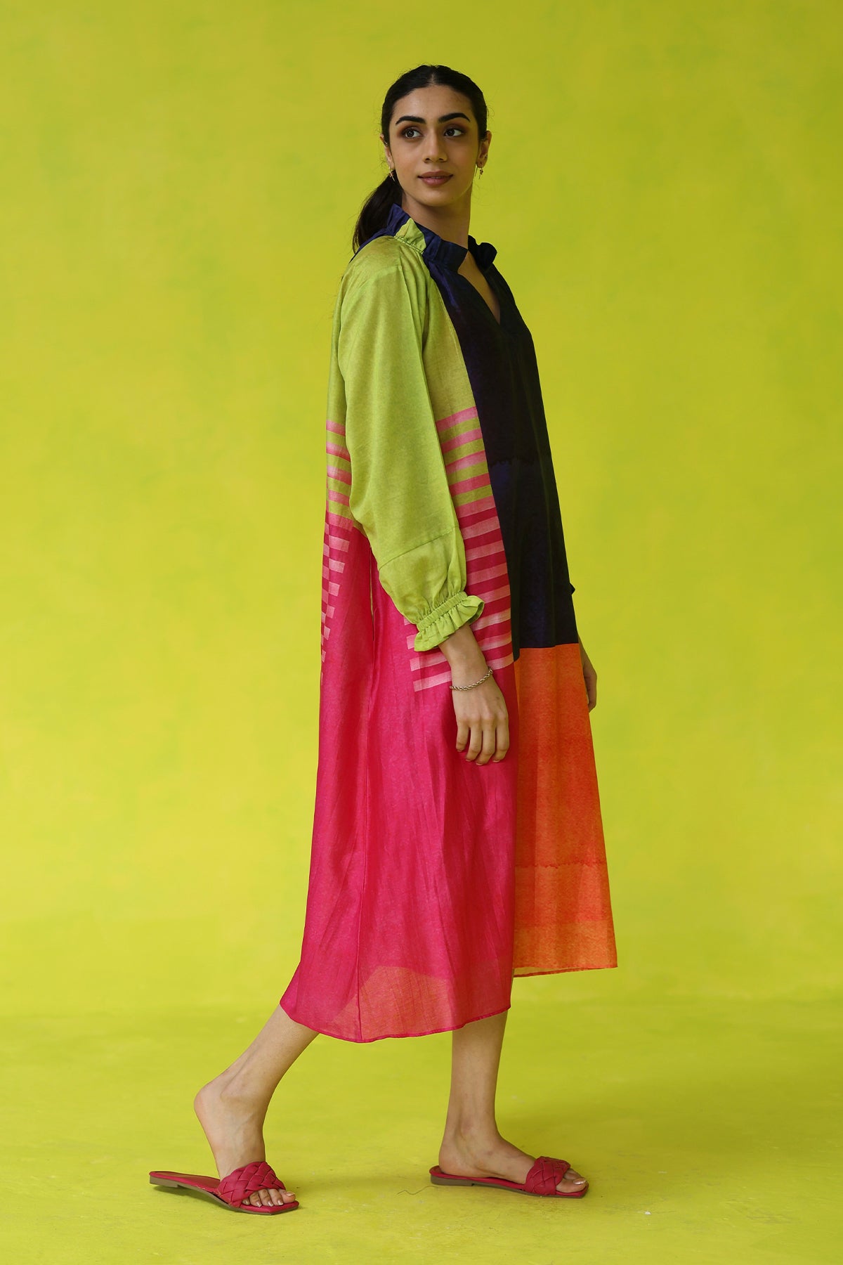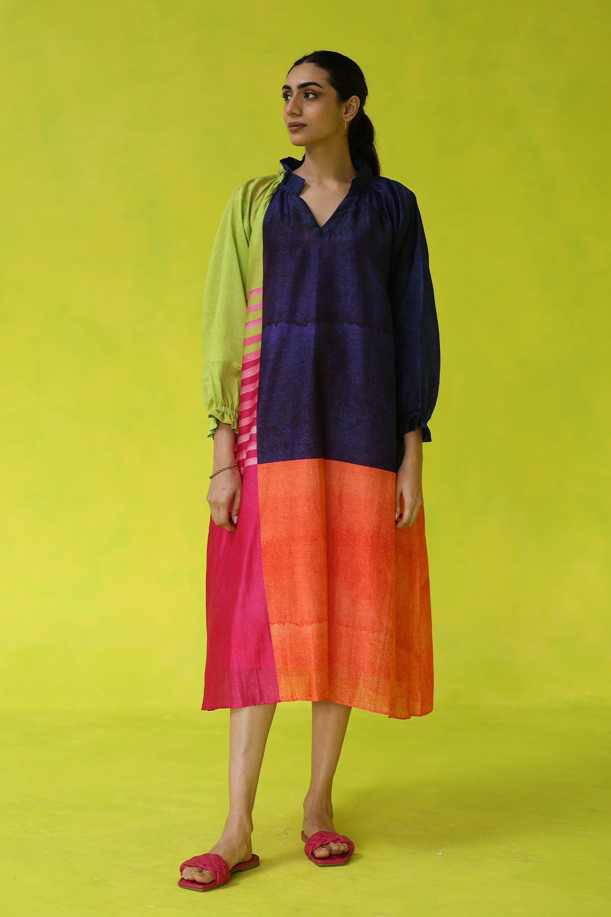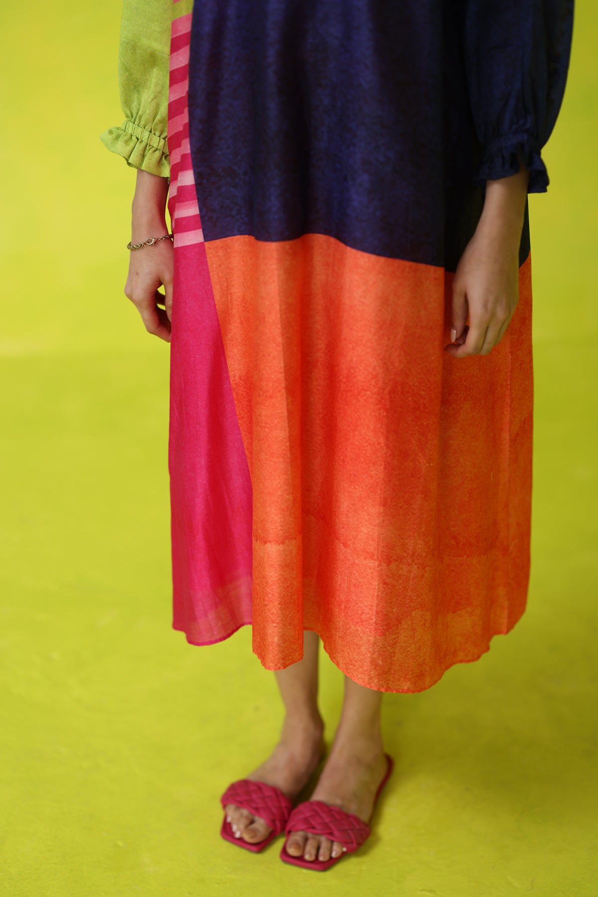 The block party dress brings the energy with vibrant color blocking in navy, orange, and fuchsia cut in a breezy a-line silhouette that moves as freely as you do. Whether you’re dancing through errands or slipping into weekend mode, this one turns heads without trying
