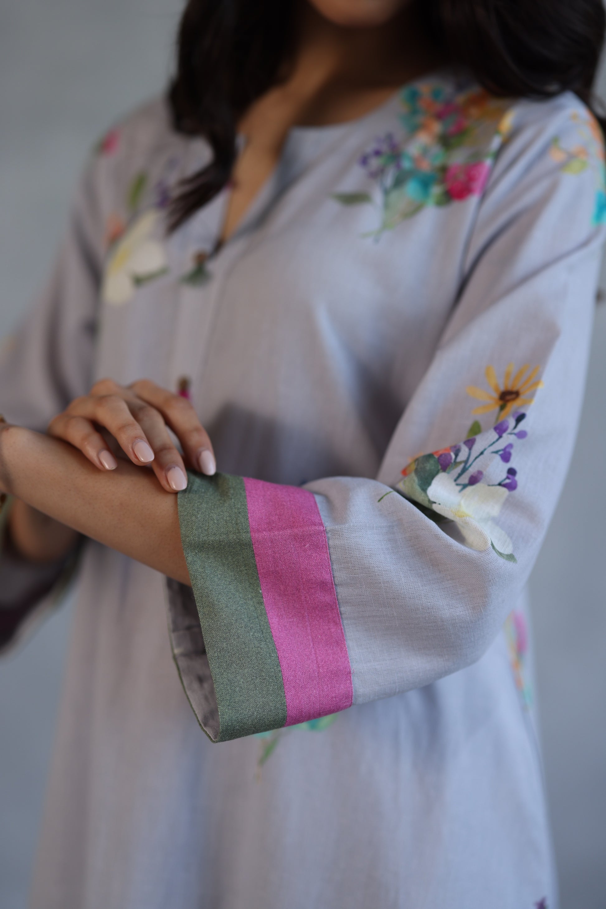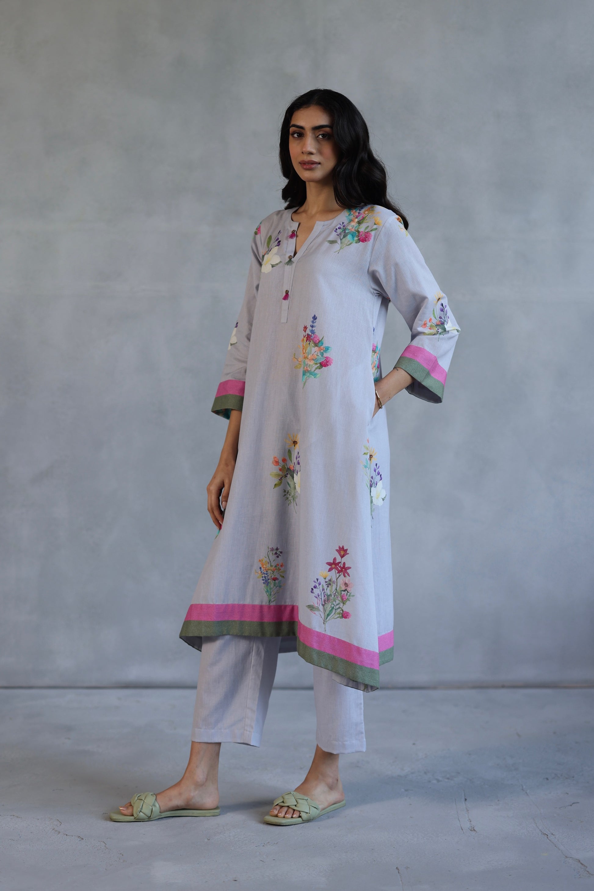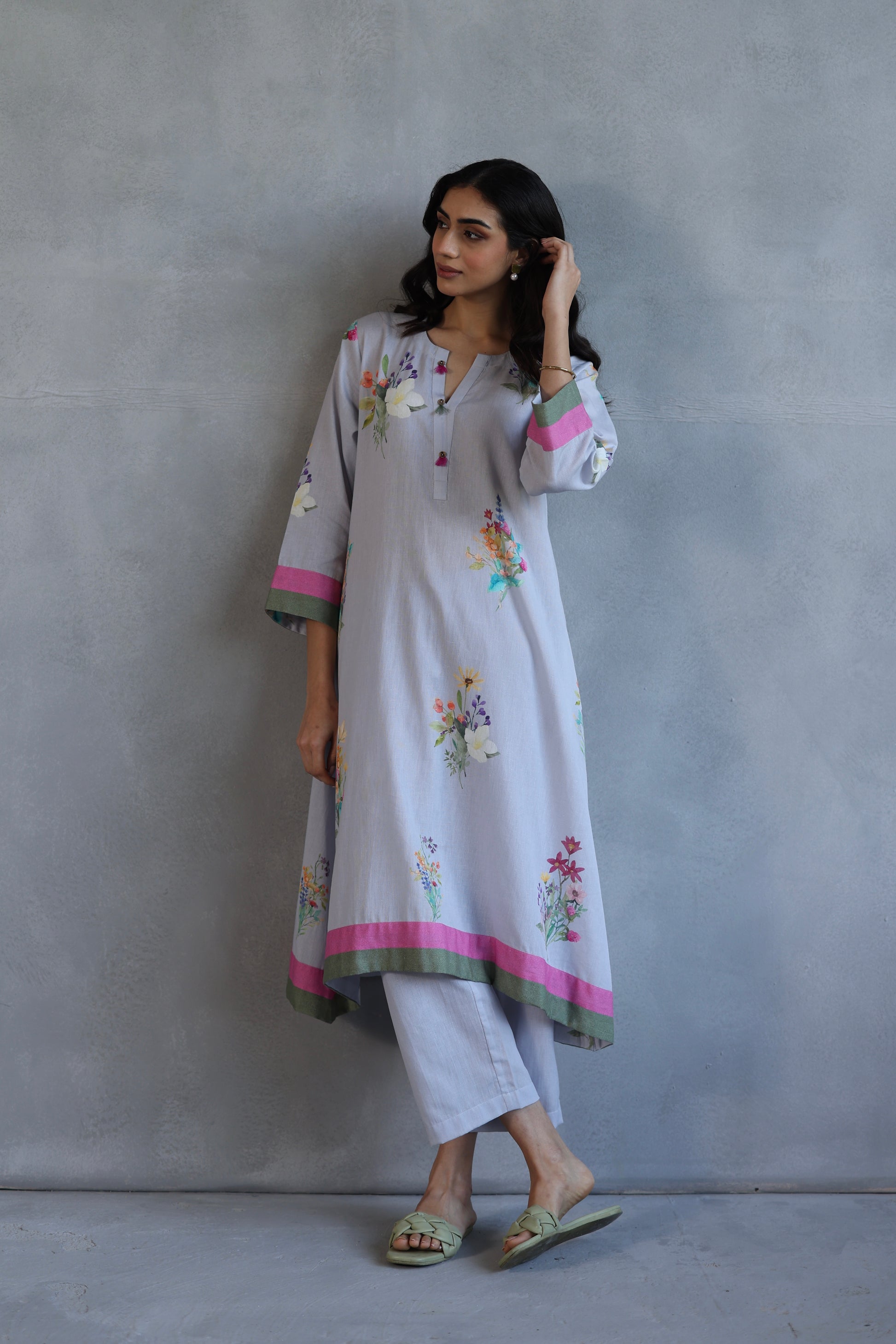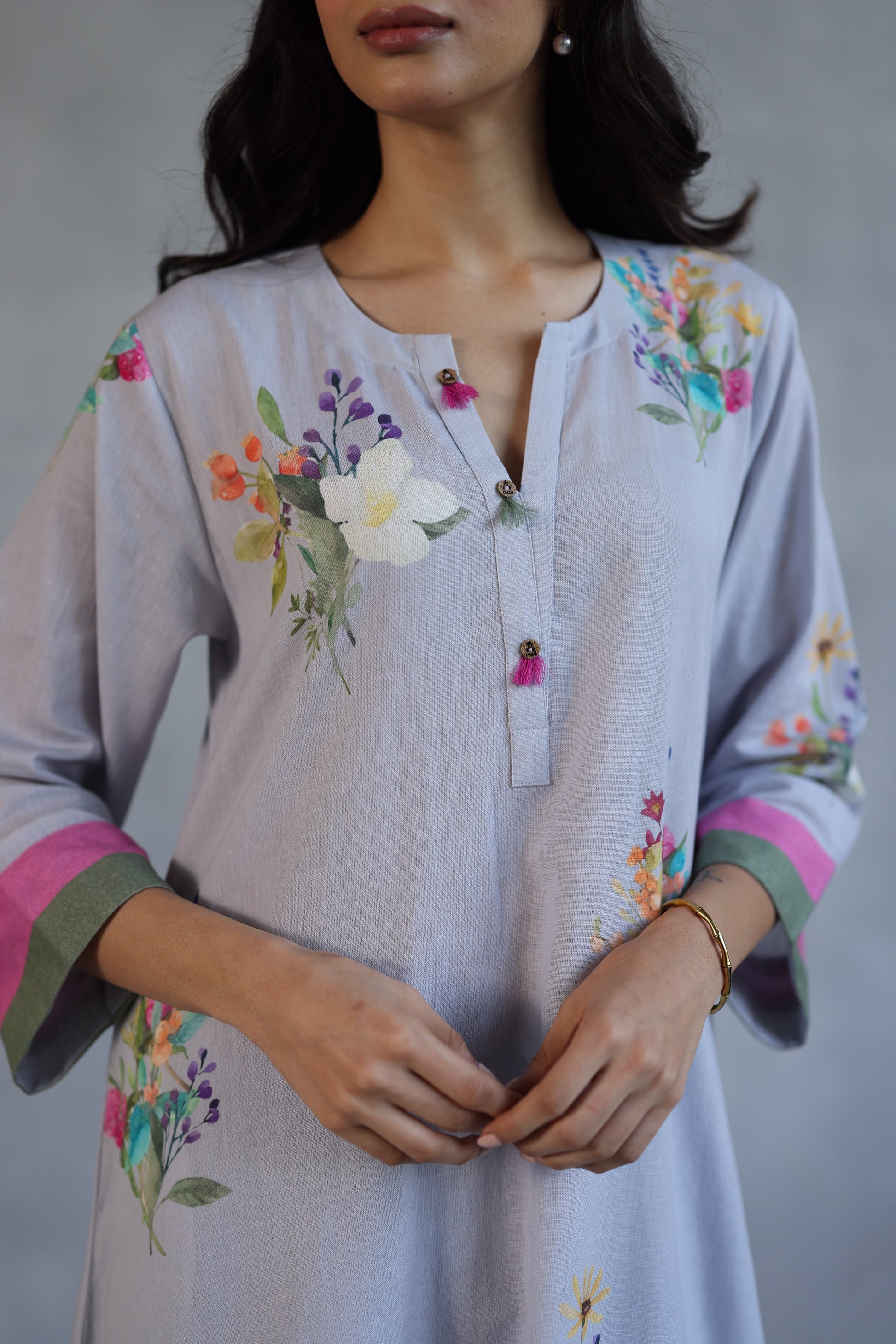 A dreamy blend of artistry and comfort, this a-line kurta features delicate watercolor florals that flow effortlessly across the fabric. The contrast color stripes on the sleeves add a subtle statement, while playful tassels at the neckline enhance its charm. Paired with breezy straight pants, this set is an ode to effortless elegance light, airy, and perfect for slow, sunlit days.
