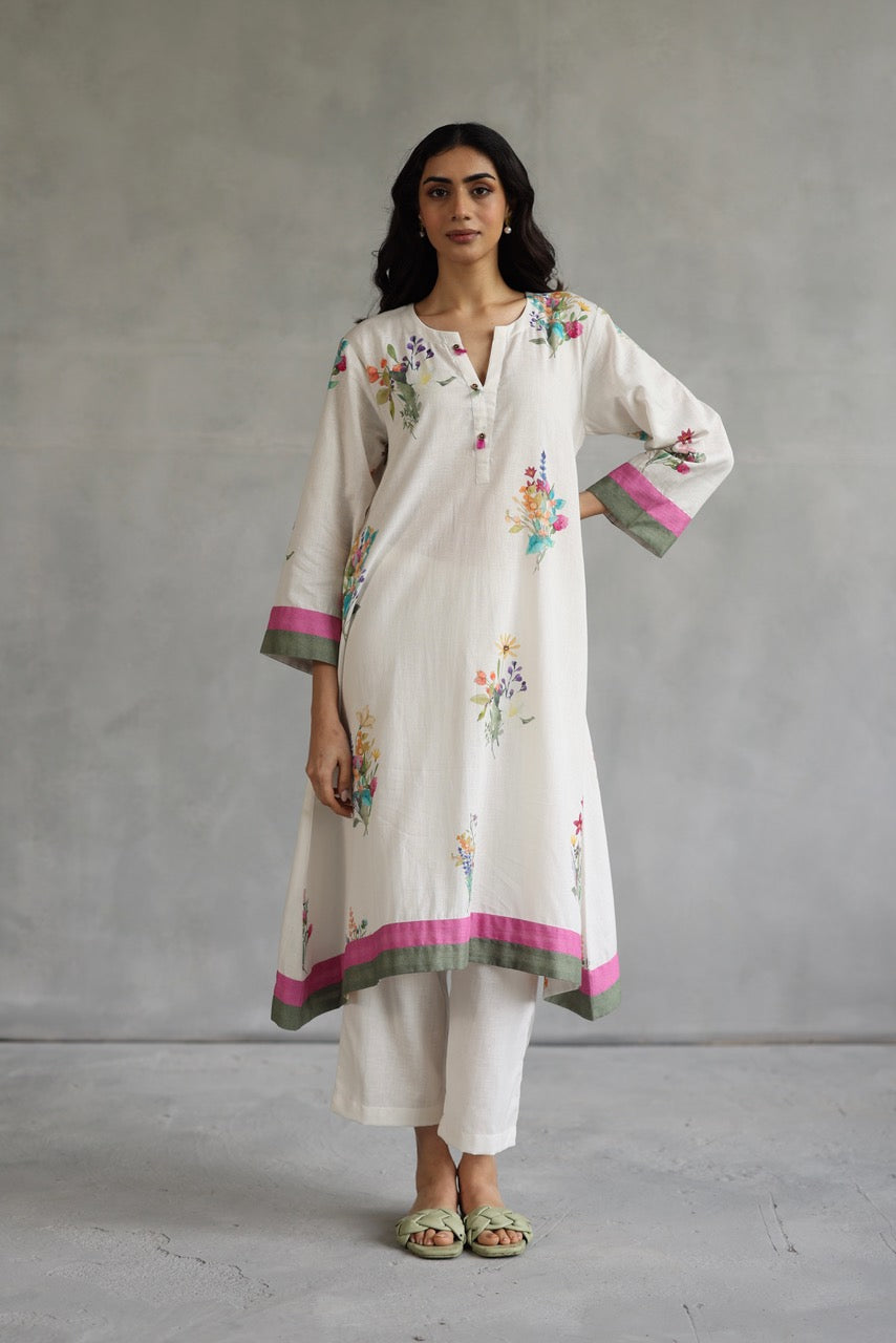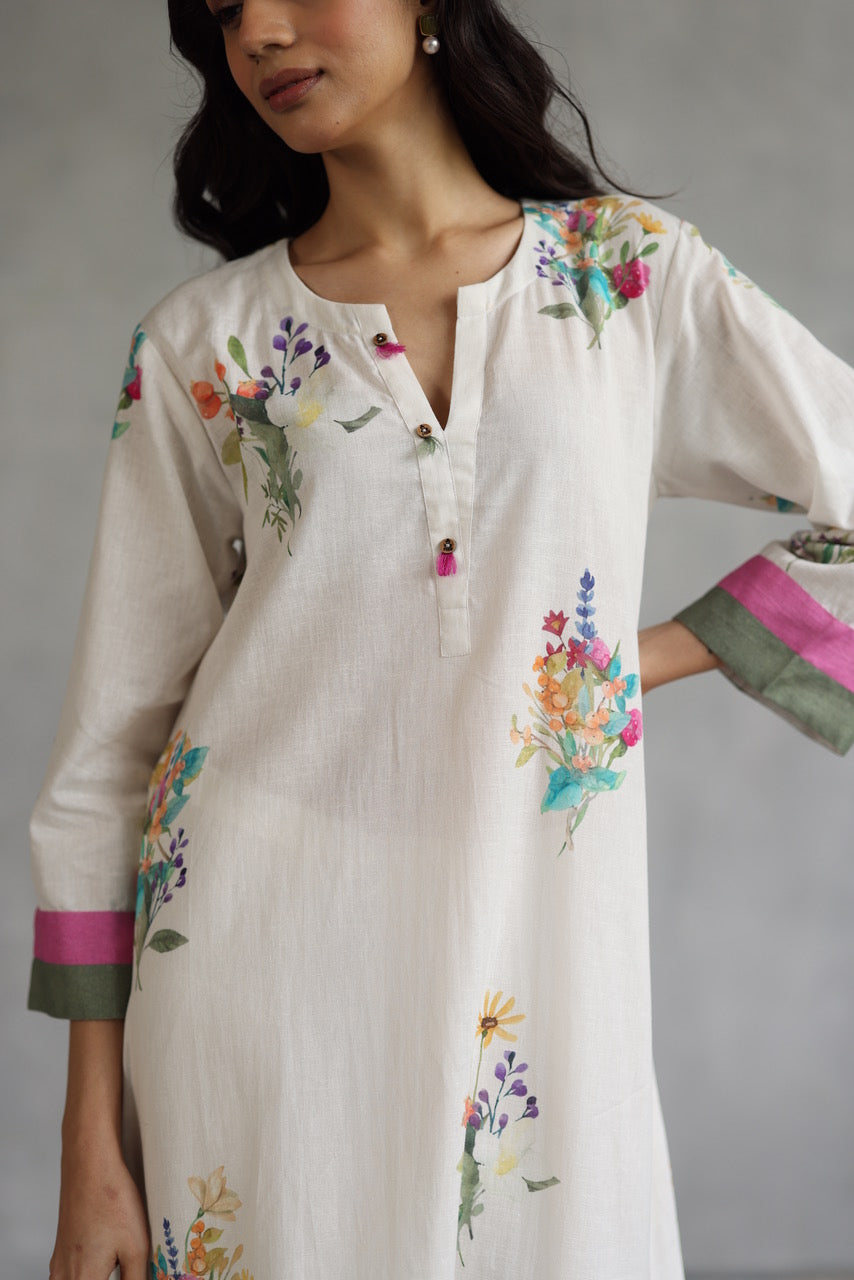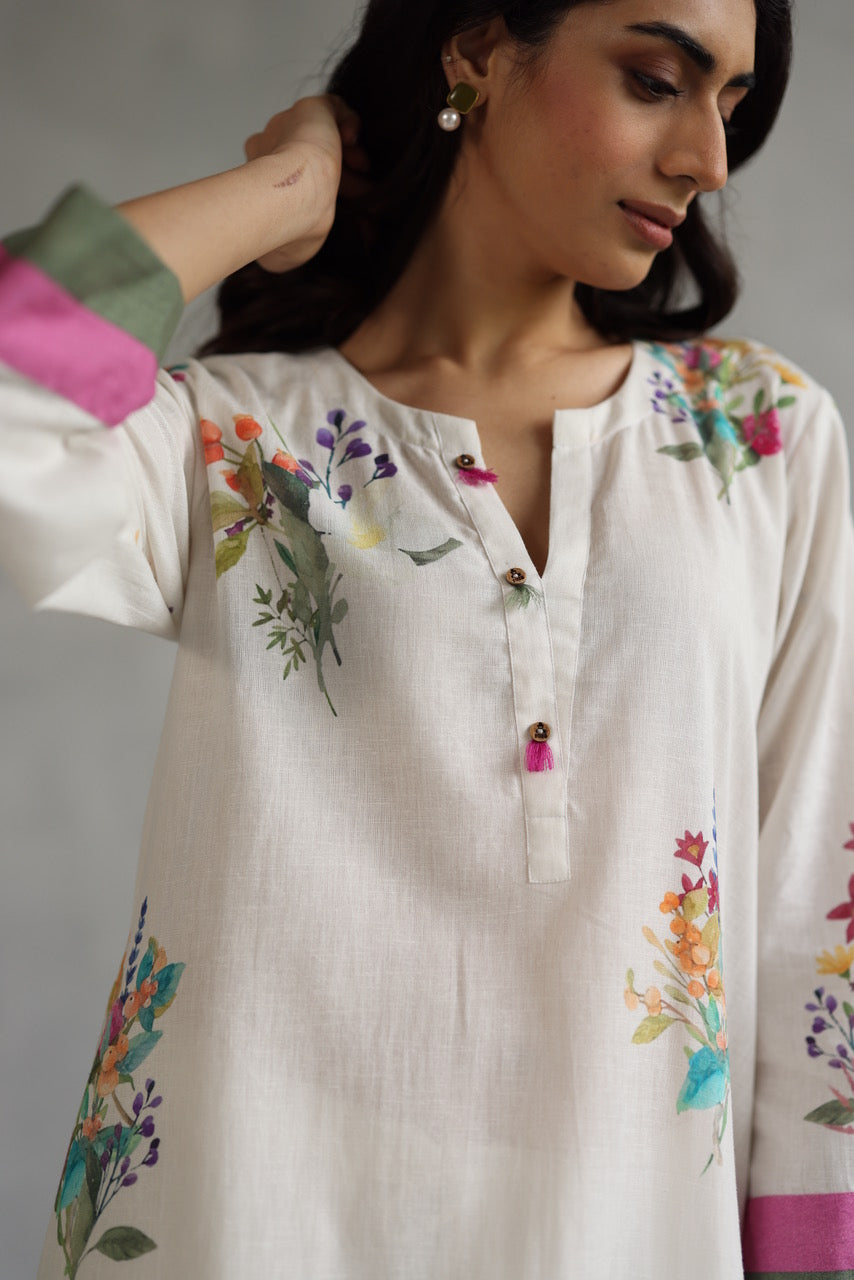 A dreamy blend of artistry and comfort, this a-line kurta features delicate watercolor florals that flow effortlessly across the fabric. The contrast color stripes on the sleeves add a subtle statement, while playful tassels at the neckline enhance its charm. Paired with breezy straight pants, this set is an ode to effortless elegance light, airy, and perfect for slow, sunlit days.