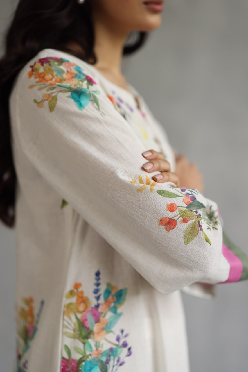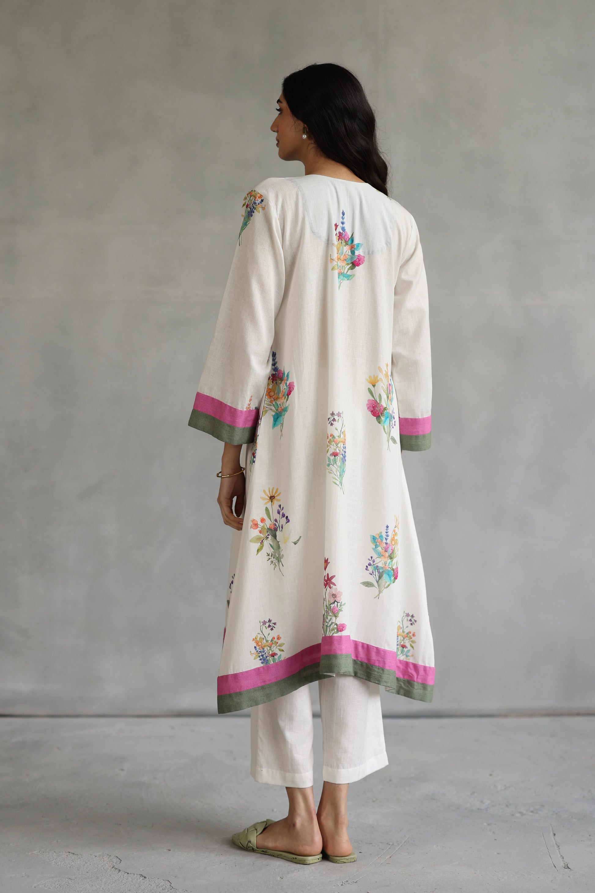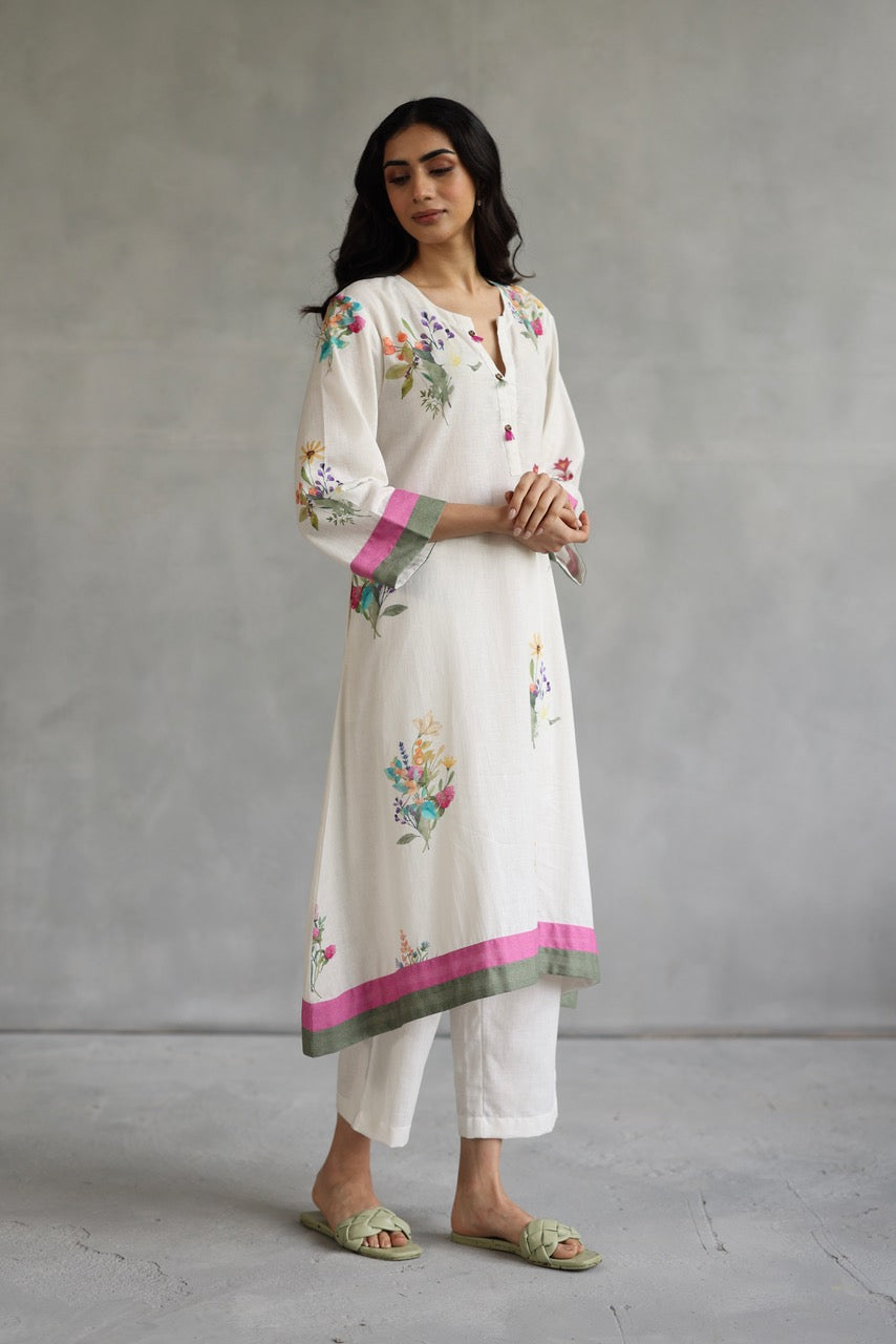 A dreamy blend of artistry and comfort, this a-line kurta features delicate watercolor florals that flow effortlessly across the fabric. The contrast color stripes on the sleeves add a subtle statement, while playful tassels at the neckline enhance its charm. Paired with breezy straight pants, this set is an ode to effortless elegance light, airy, and perfect for slow, sunlit days.