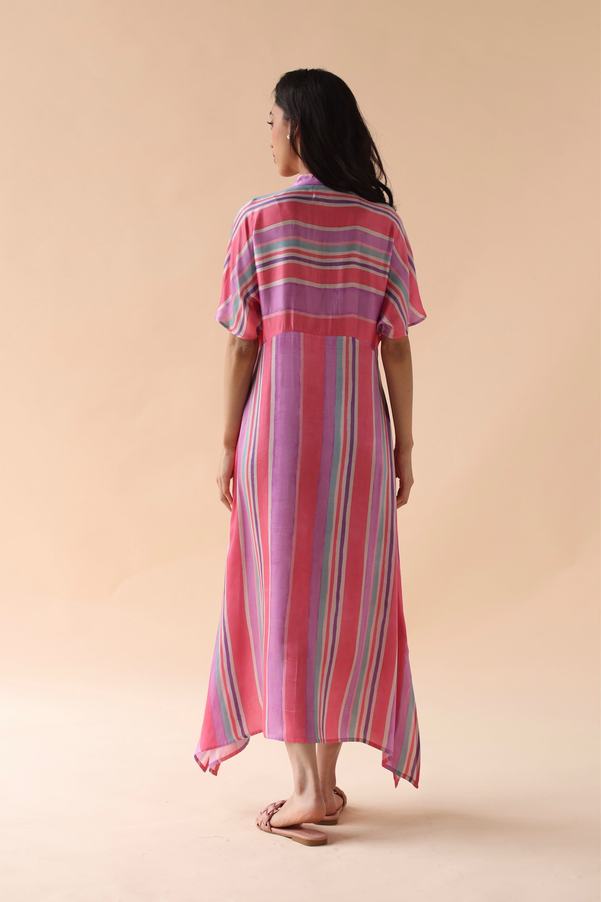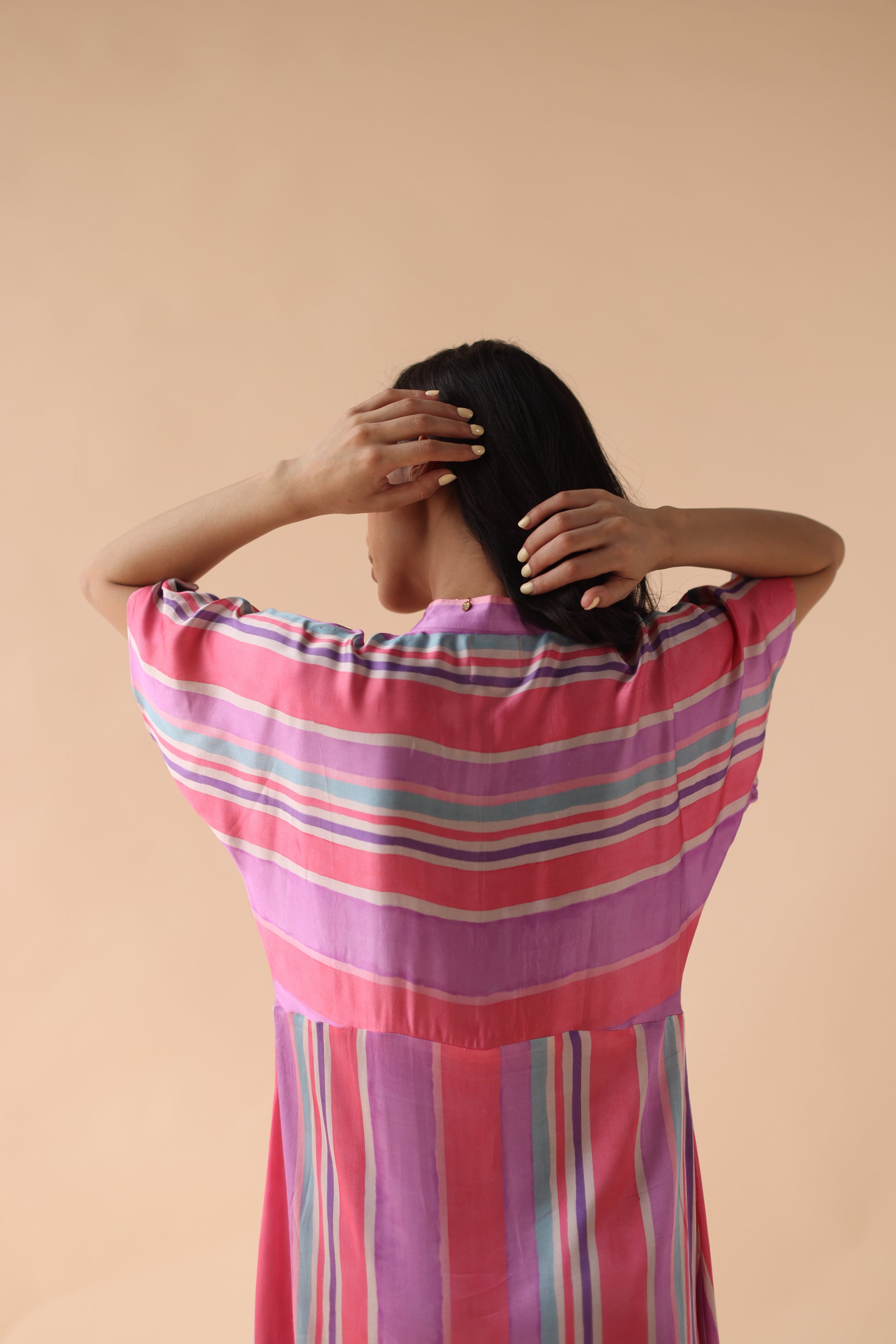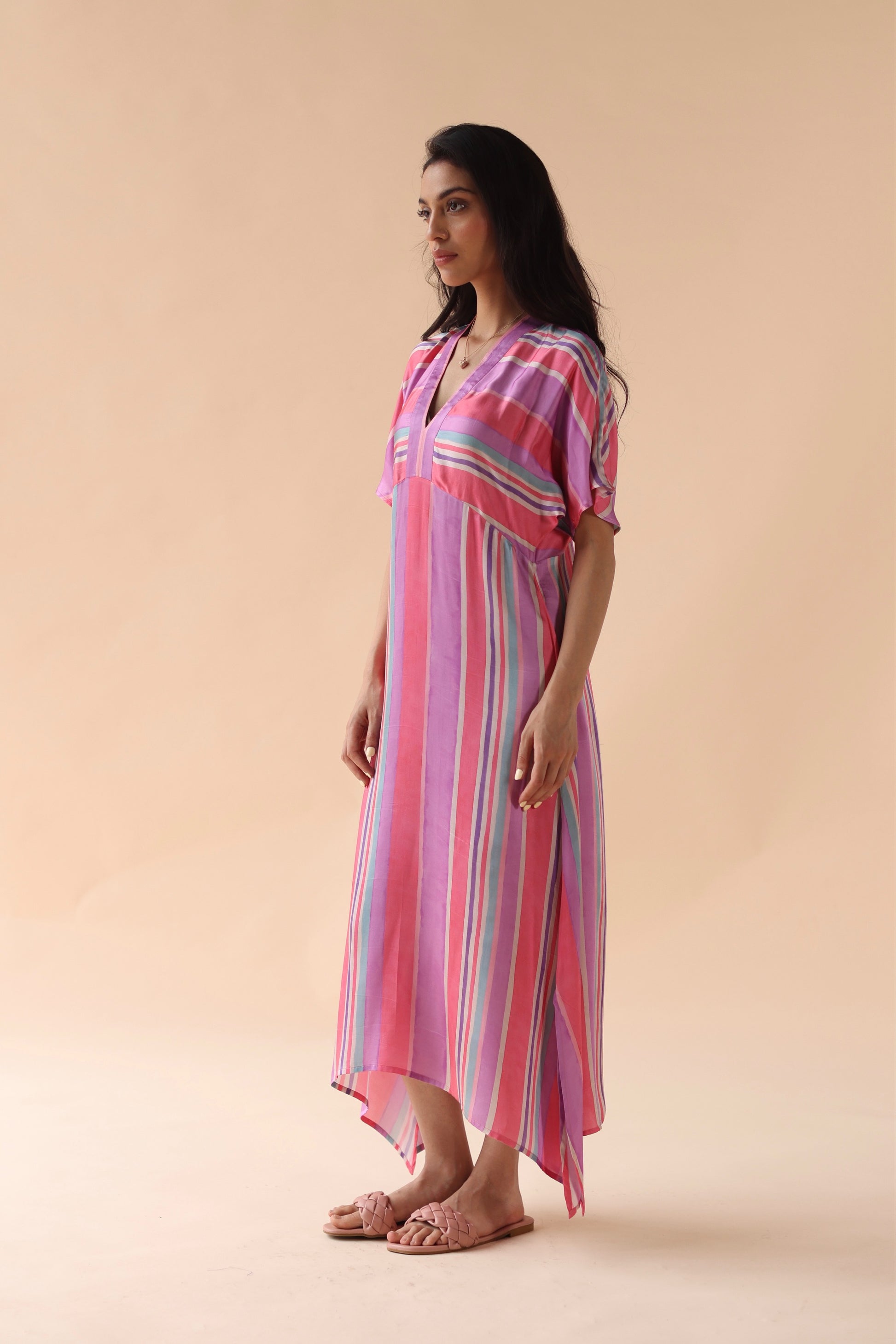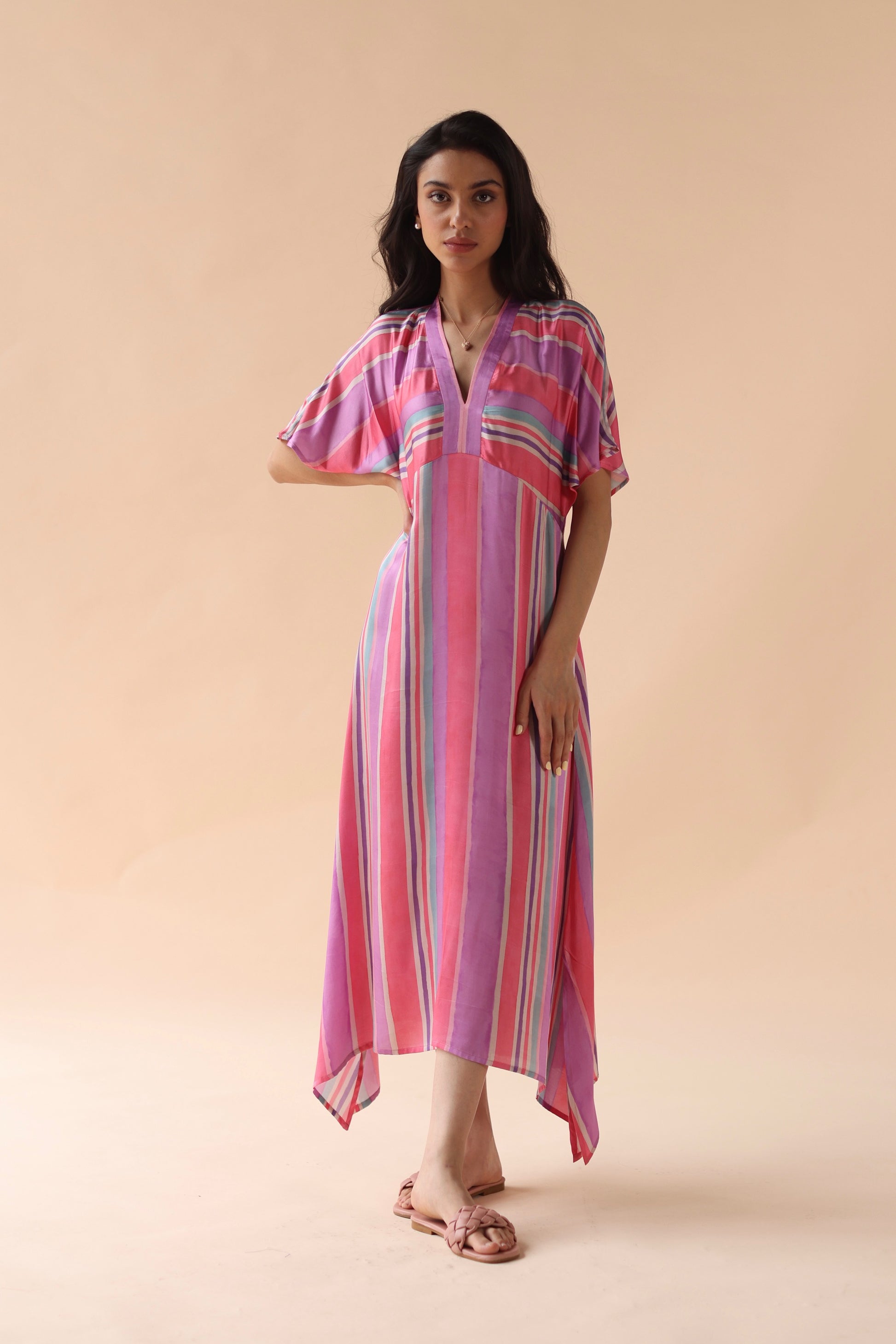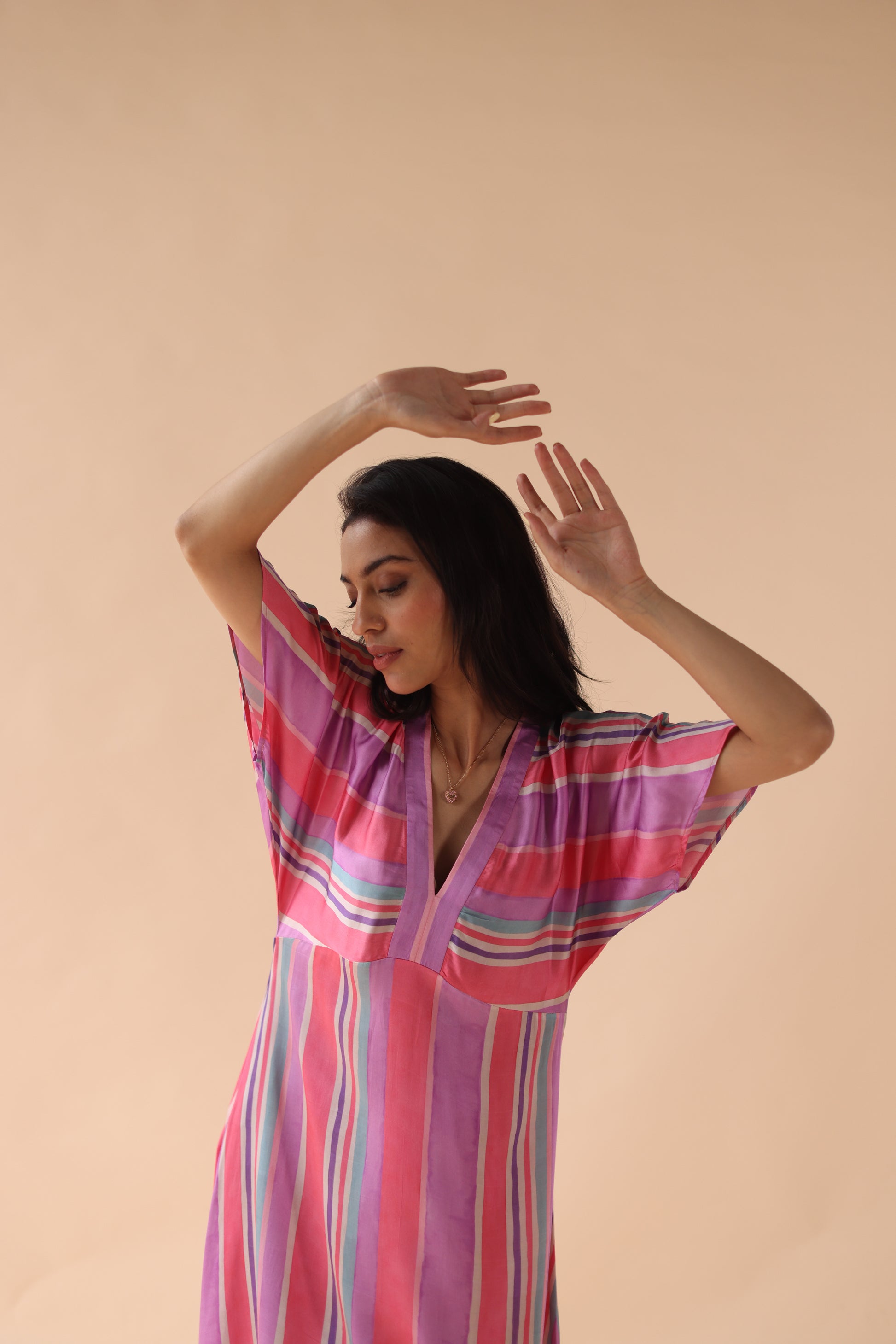 Our cafune dress is an a-line dress made of satin silk, our distinctive fabric. It has kaftan-cut sleeves with stripes along with a flattering neckline, making it the perfect resort wear.
