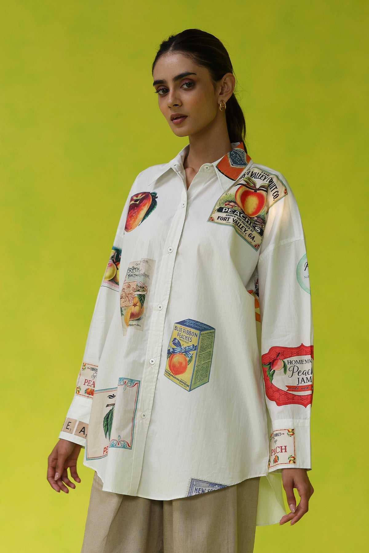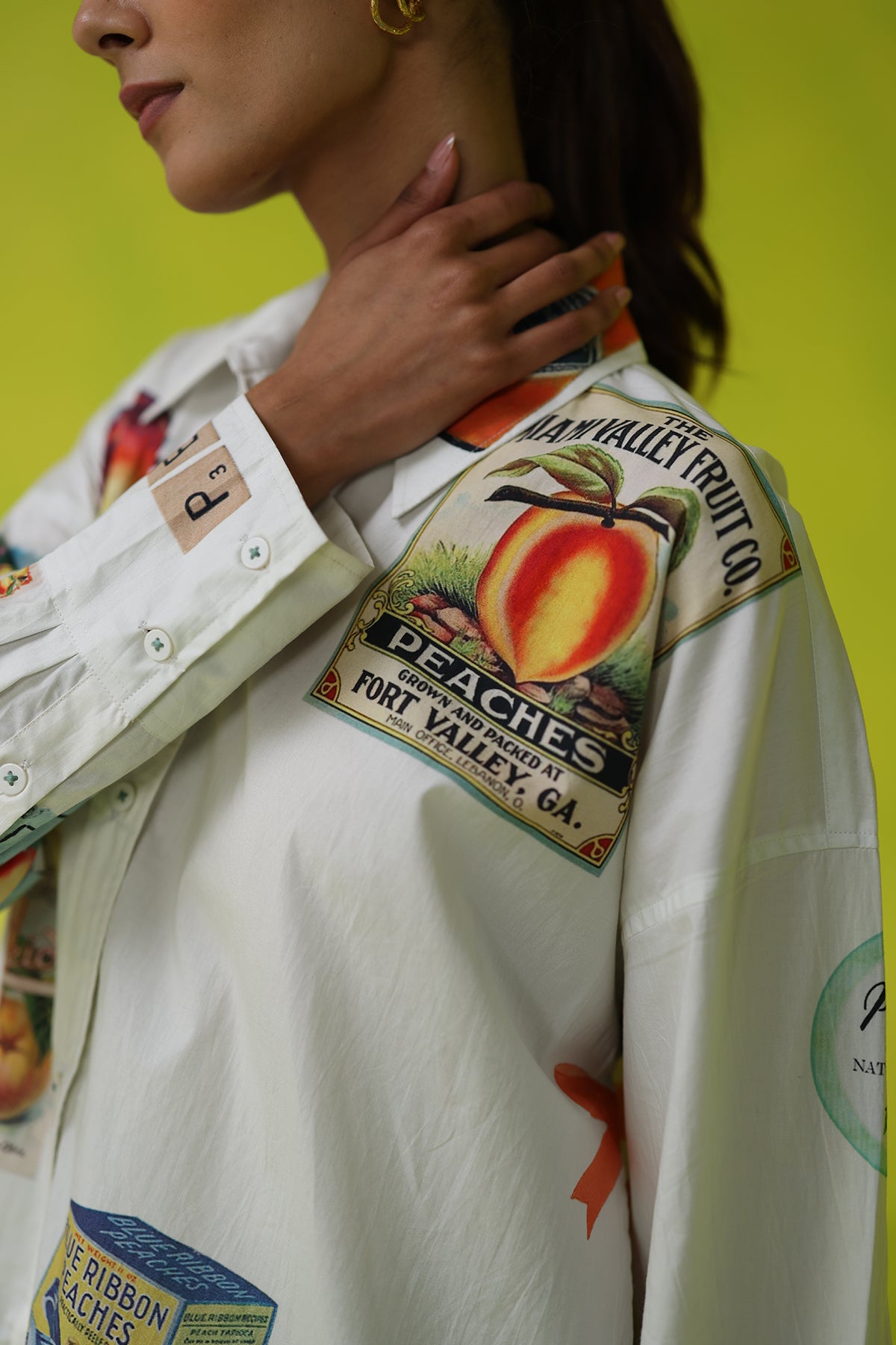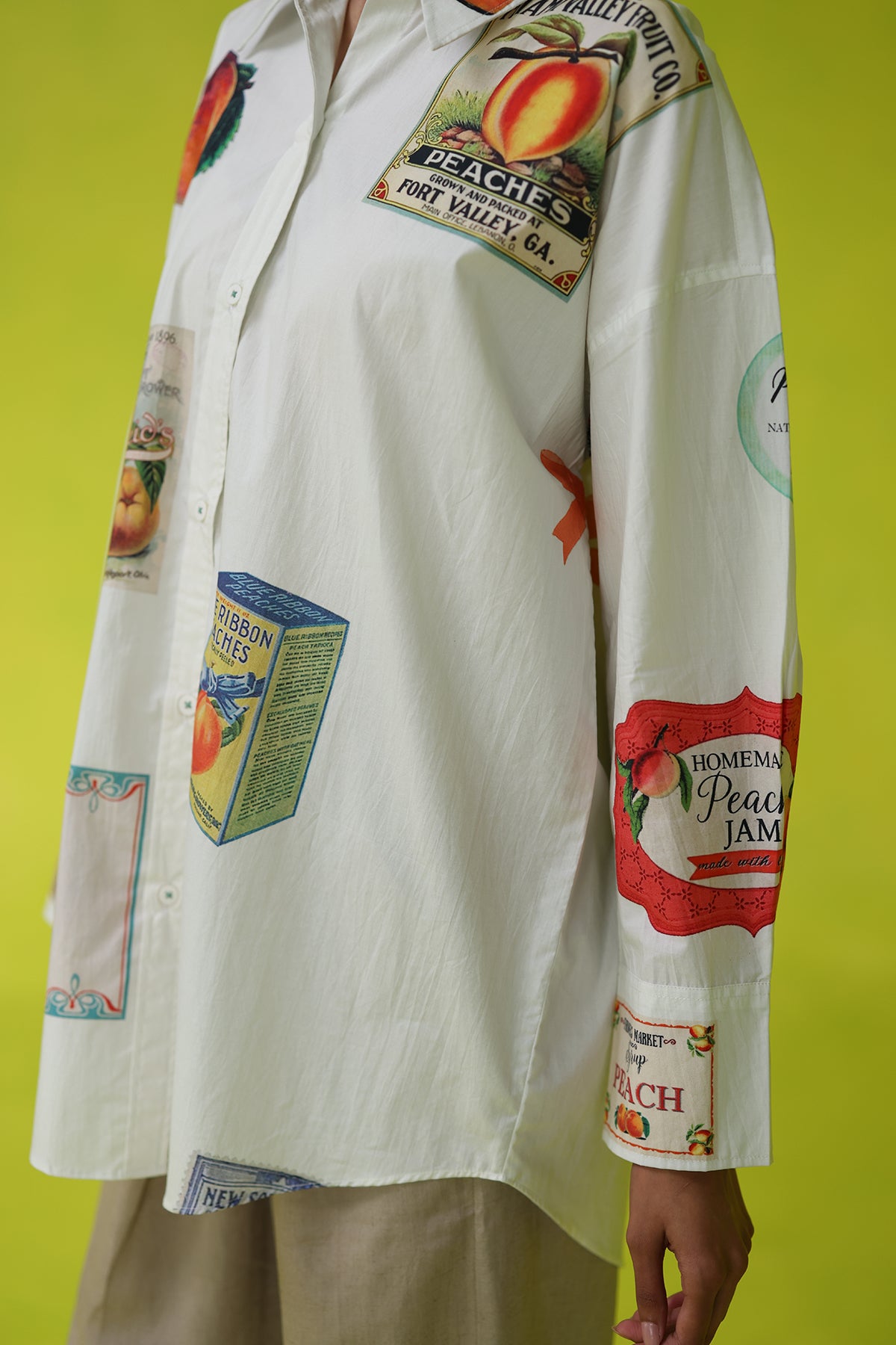 A postcard from the west coast, this shirt bursts with retro peach box illustrations and sun-washed fruit motifs. Breezy poplin meets vintage california charm perfect for road trips down highway 1 or farmers’ market strolls. Pair it with linen pants and take your sweet time.