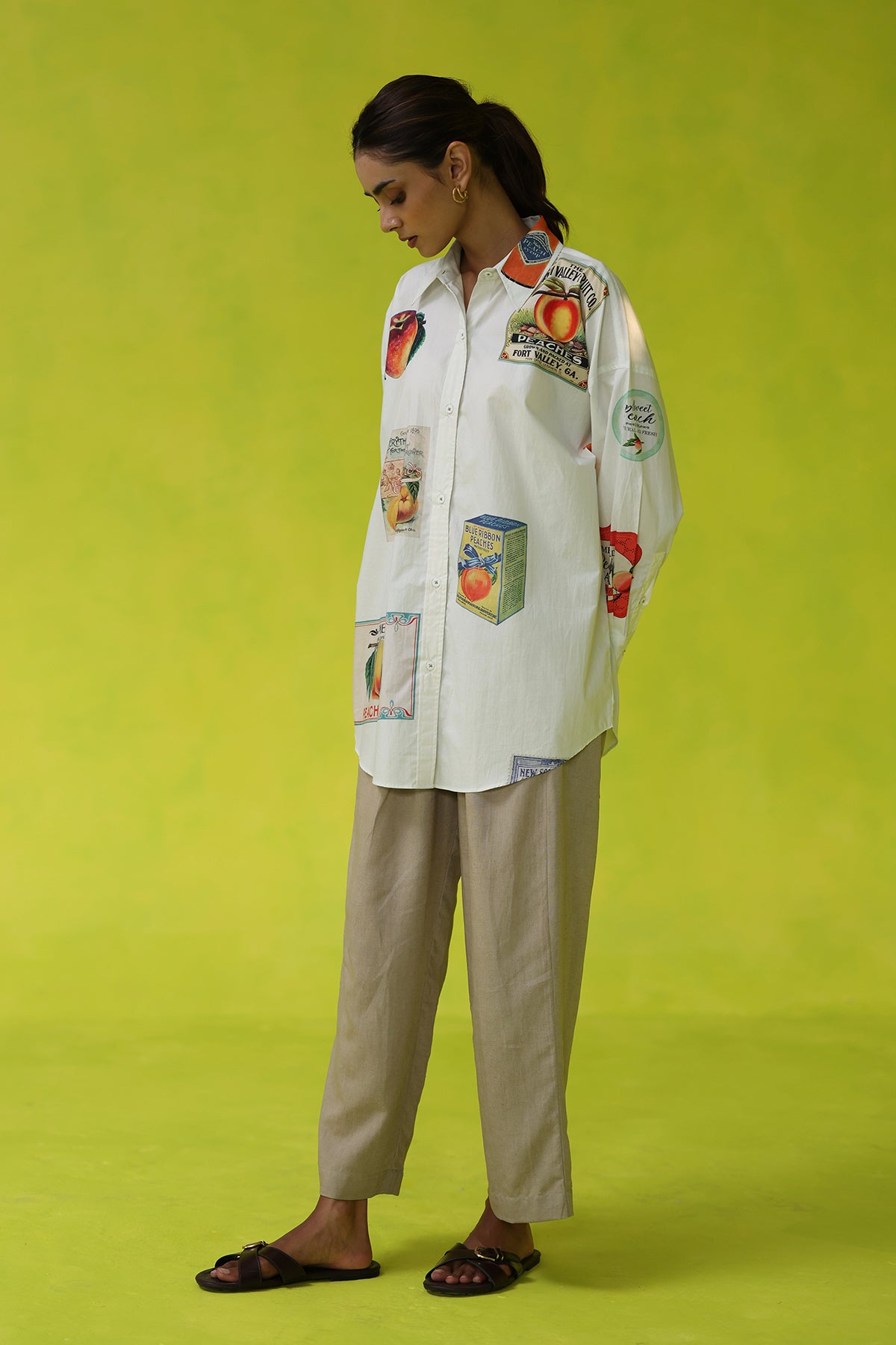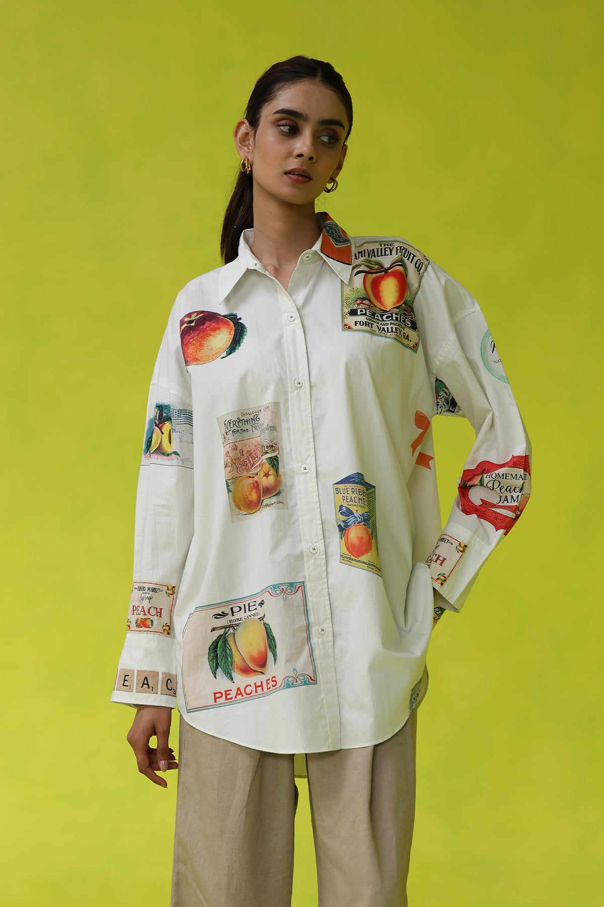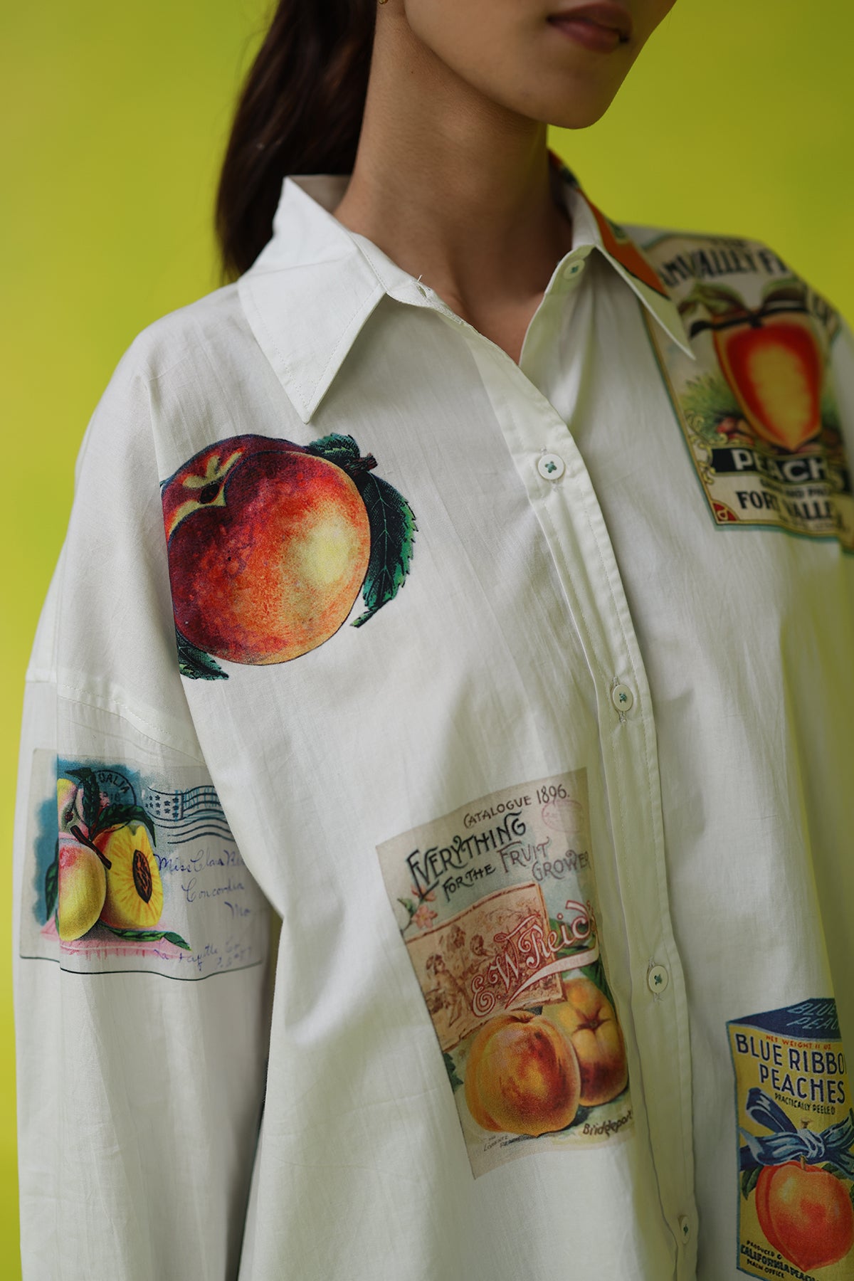 A postcard from the west coast, this shirt bursts with retro peach box illustrations and sun-washed fruit motifs. Breezy poplin meets vintage california charm perfect for road trips down highway 1 or farmers’ market strolls. Pair it with linen pants and take your sweet time.