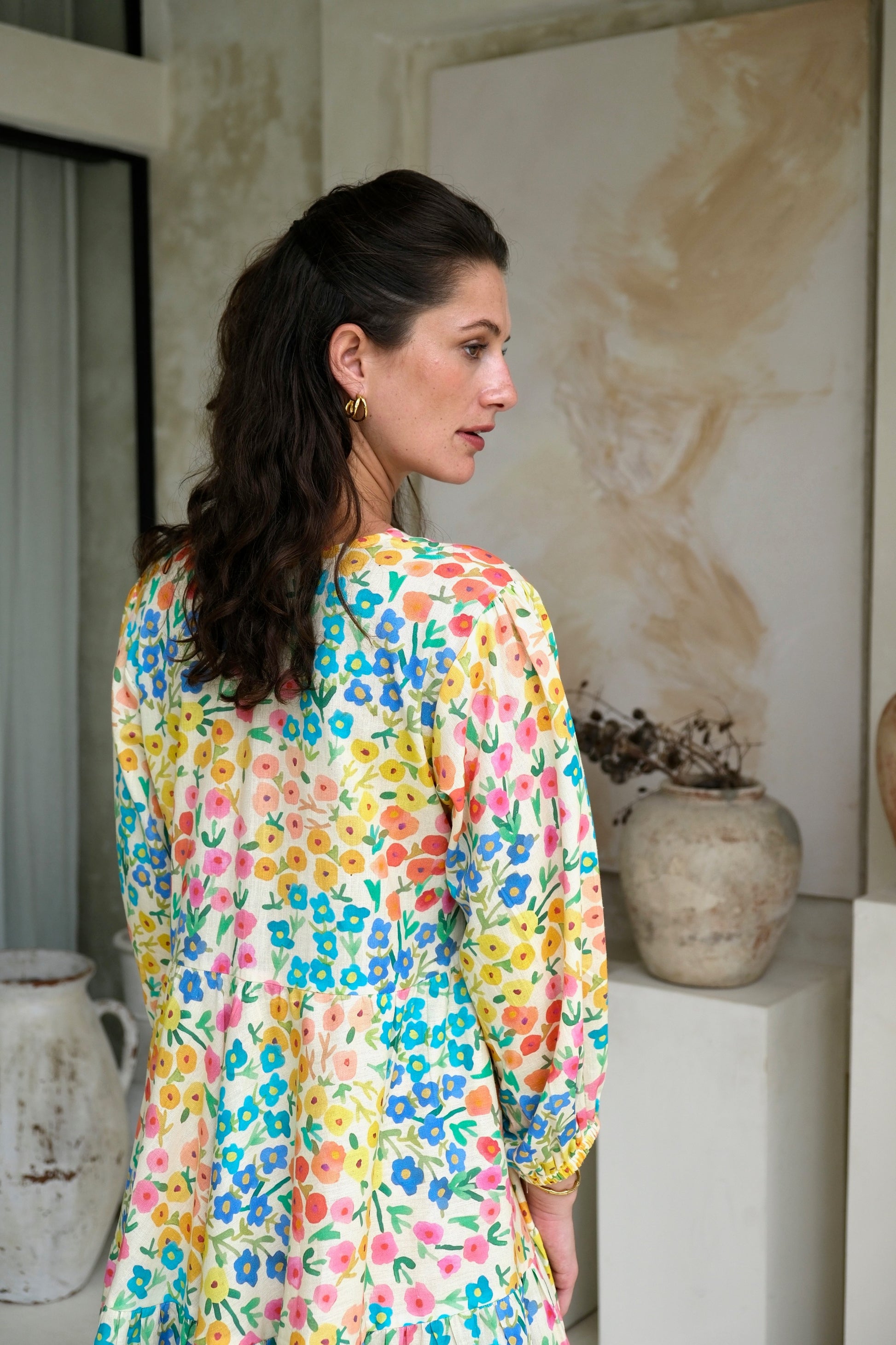 Swing into spring with the whimsical camelia dress in linen! this flirty short dress features gatherings, a playful v-neckline, dainty sleeves detail and a flattering flared bottom. The dress is adorned with adorable tiny peonies, making it perfect for a sunny garden party or a casual brunch date!