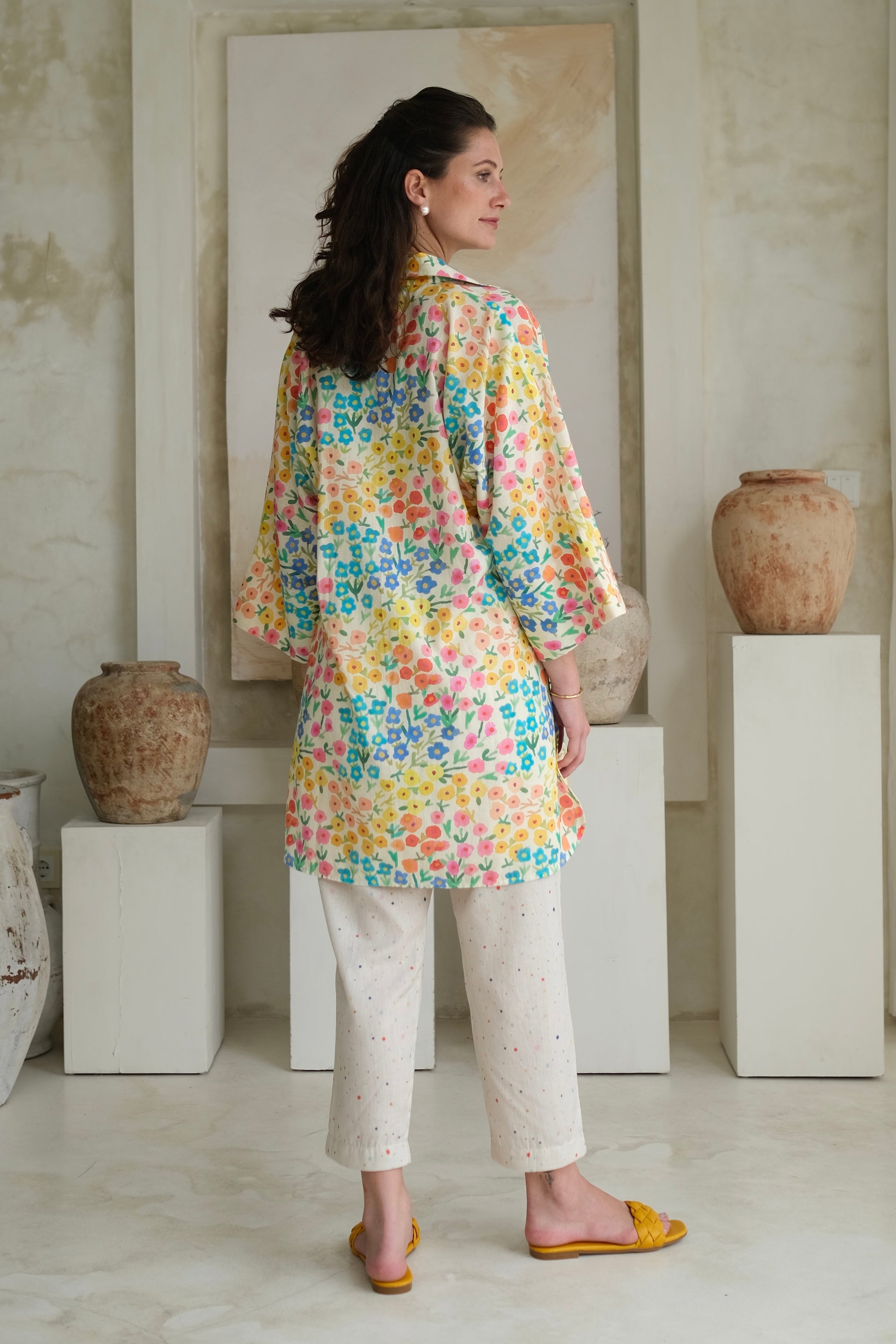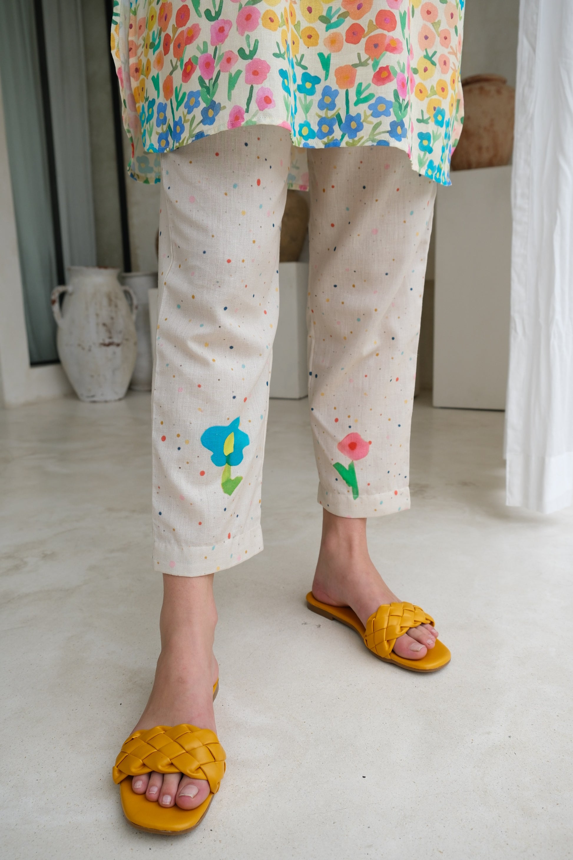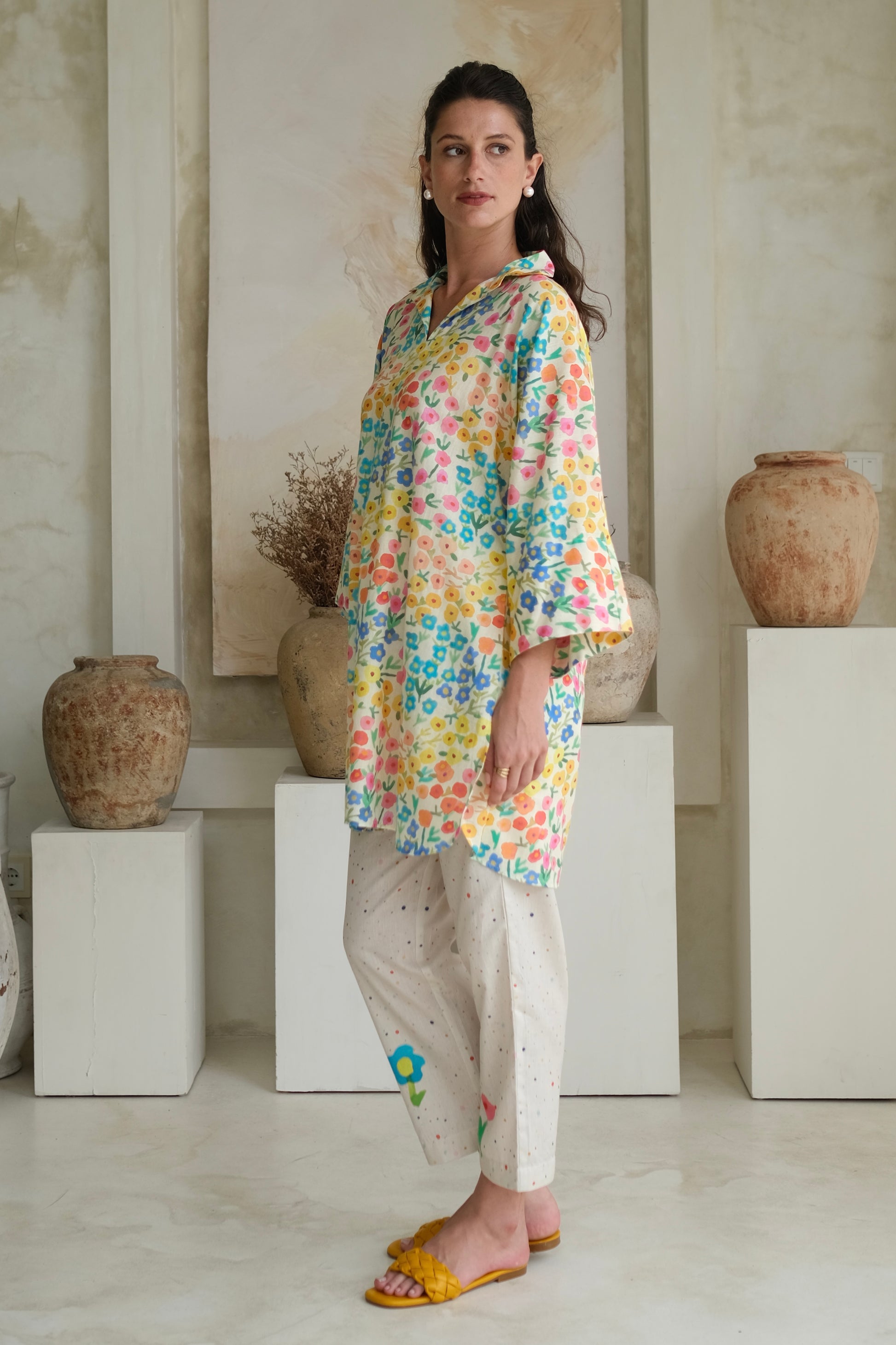 Camelia pants in linen feature abstract watercolor polka dots in vibrant colors and charming peonies at the front bottom. Pair them with the camelia tunic and our range of linen tops or tunics for a playful, whimsical look.