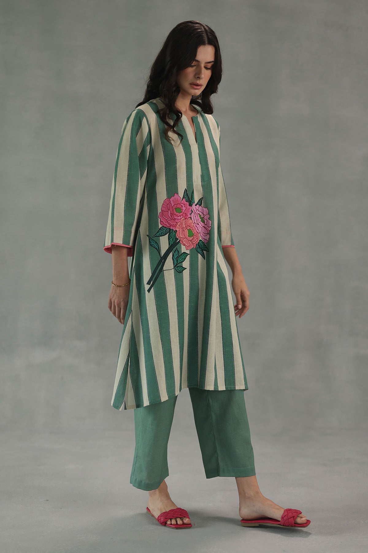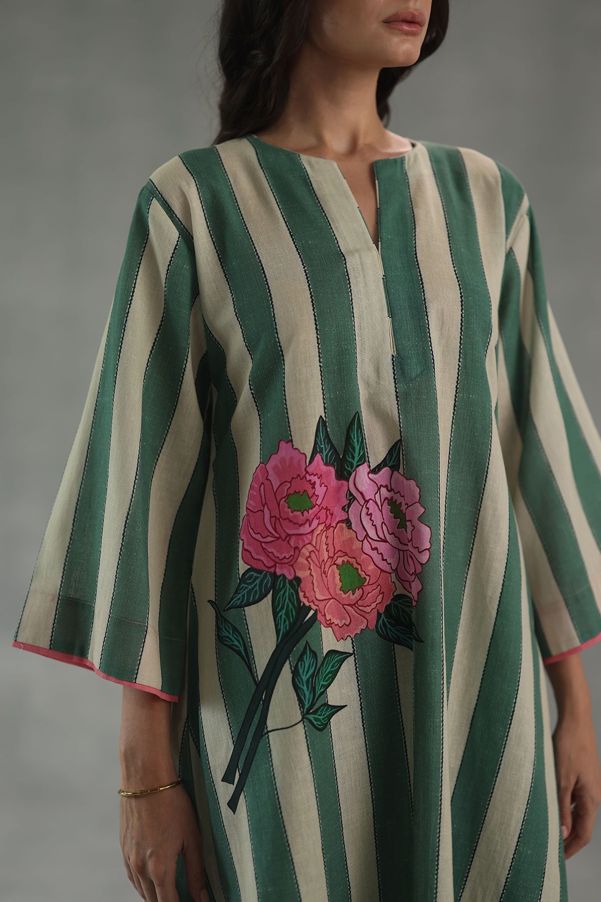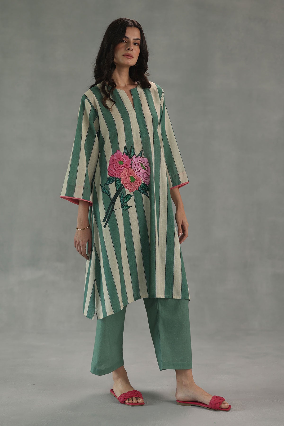 Fresh and graceful, the carolina kurta set features soft watercolor stripes in soothing shades of green and white, brought to life with bold, oversized hydrangeas blooming along the waist. Designed in an easy, relaxed silhouette, this set captures the spirit of laid-back elegance with a touch of floral artistry.