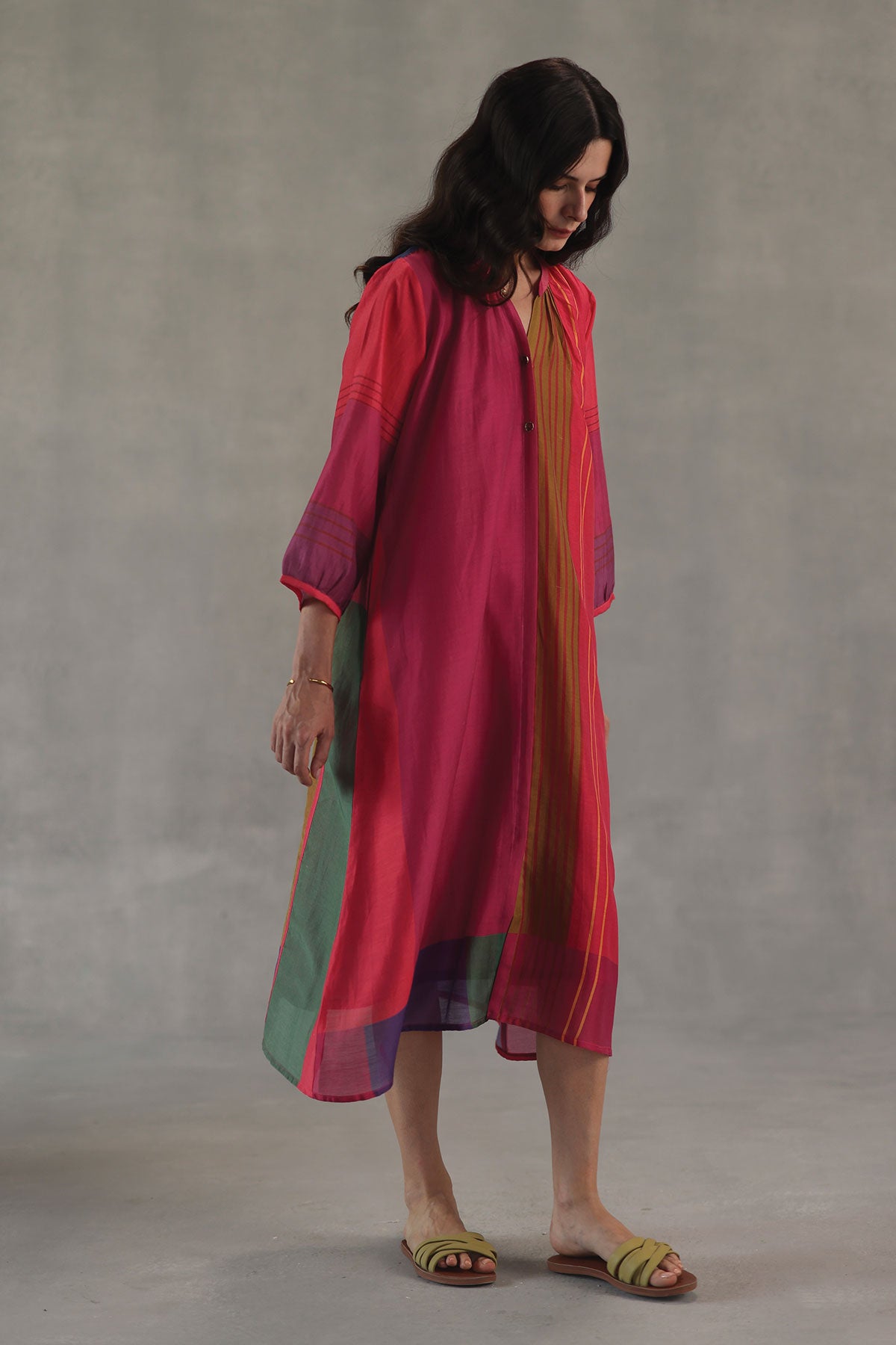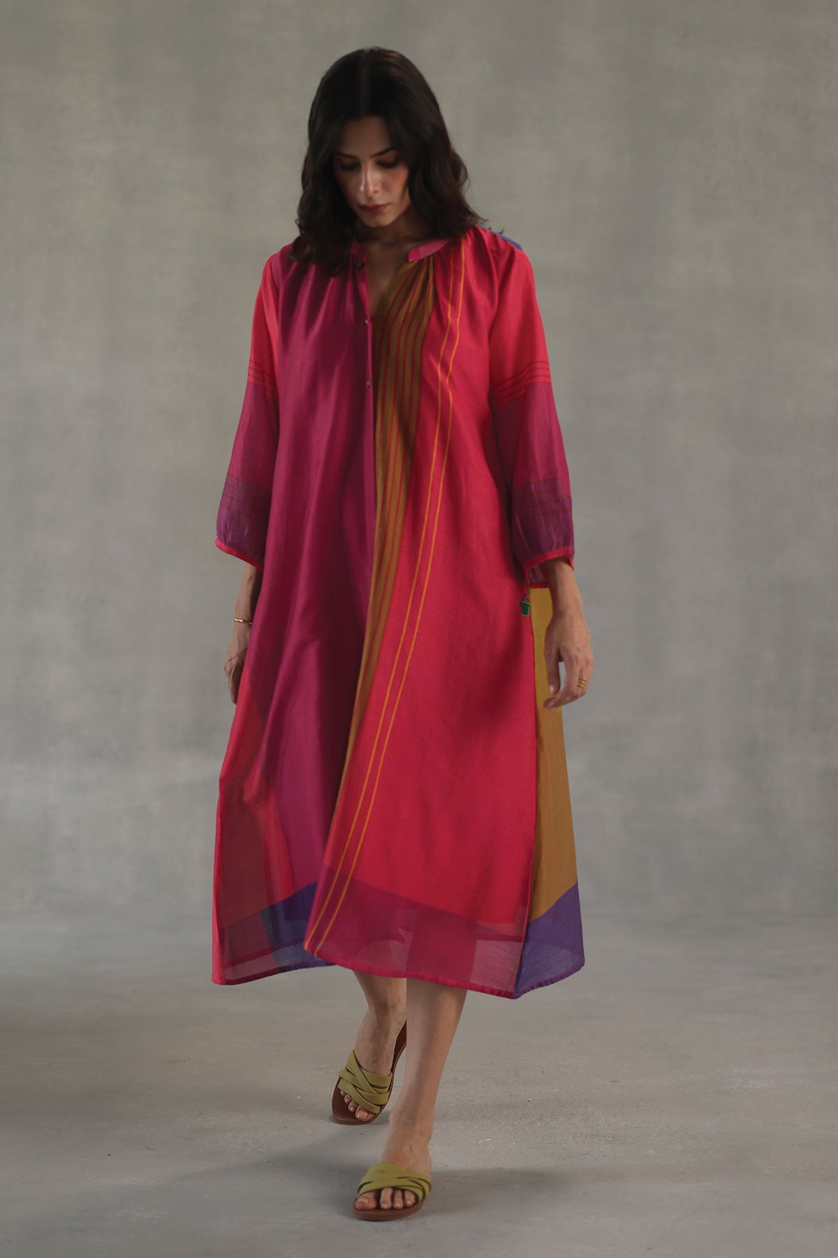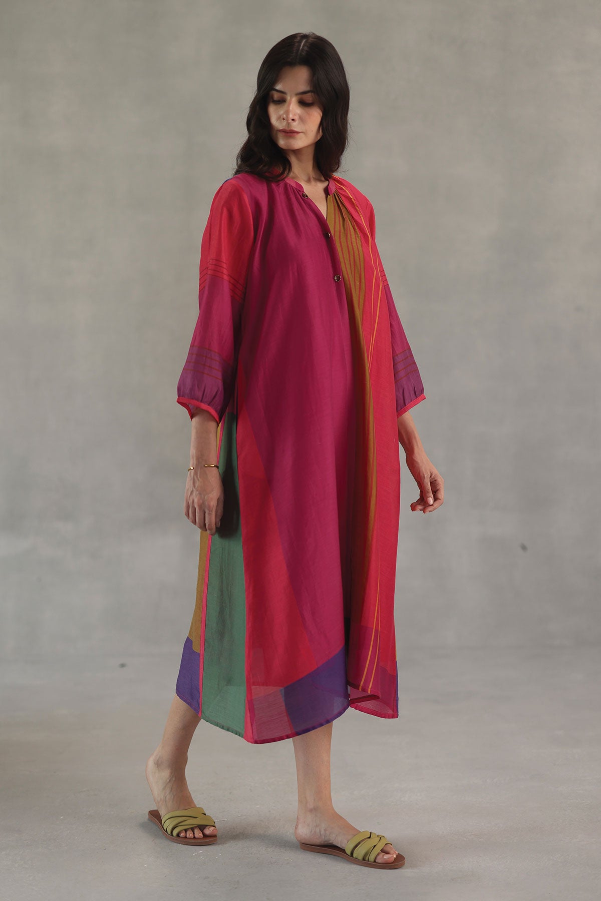 Effortlessly elegant, the celeste dress is crafted in soft chanderi and brought to life with striking color-blocked tones. Featuring playful checks, lush greens, vivid fuchsias, and unexpected pops of mustard and blue, this dress is a celebration of color and comfort. Designed with a relaxed silhouette, it moves with ease perfect for daytime occasions or festive gatherings.