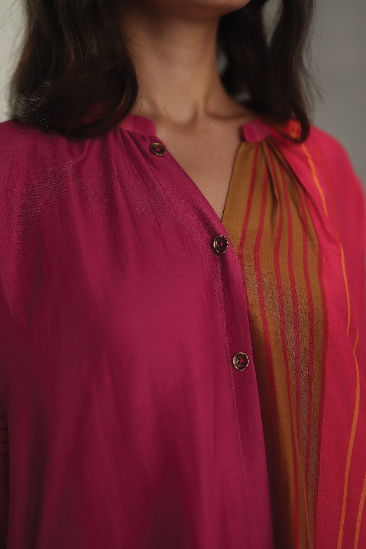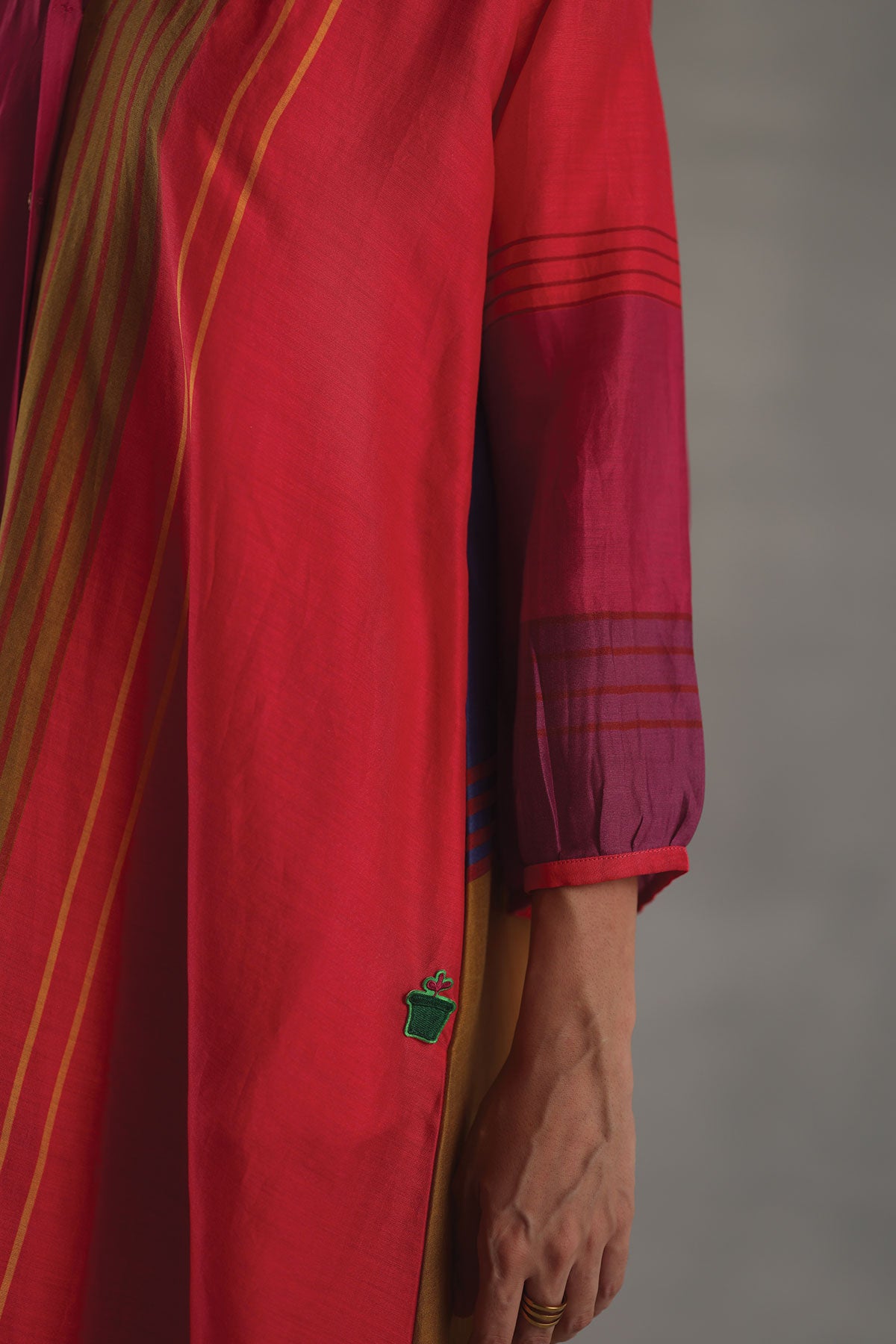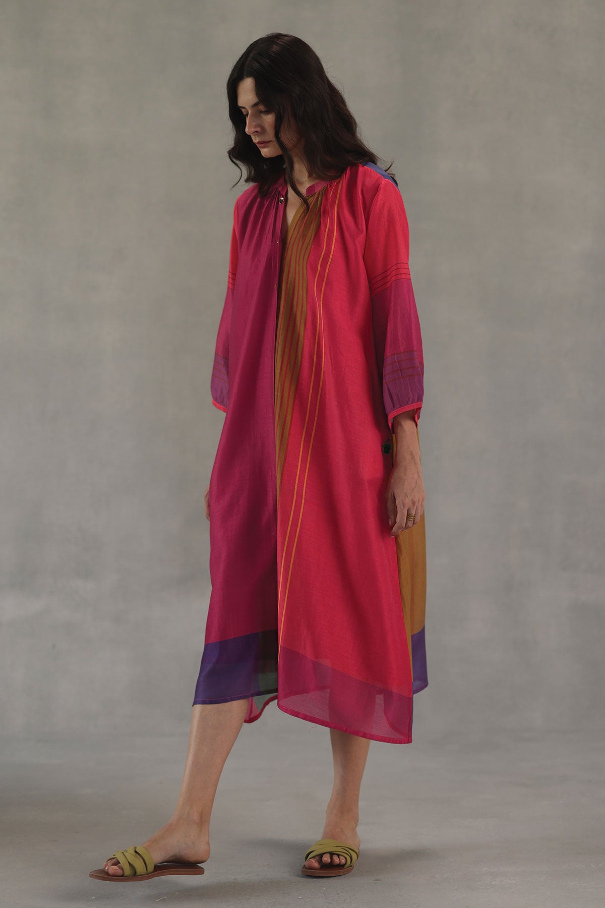 Effortlessly elegant, the celeste dress is crafted in soft chanderi and brought to life with striking color-blocked tones. Featuring playful checks, lush greens, vivid fuchsias, and unexpected pops of mustard and blue, this dress is a celebration of color and comfort. Designed with a relaxed silhouette, it moves with ease perfect for daytime occasions or festive gatherings.