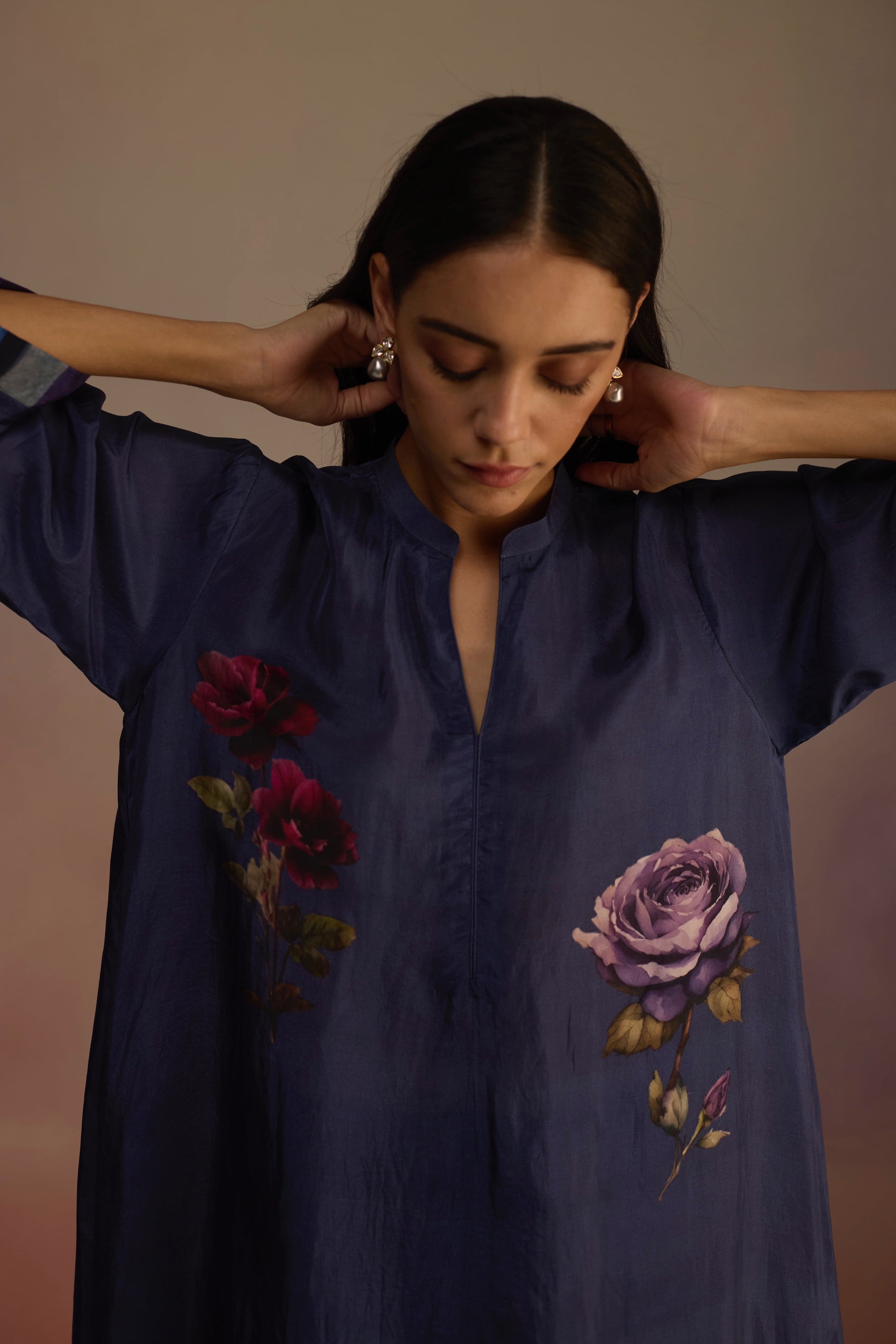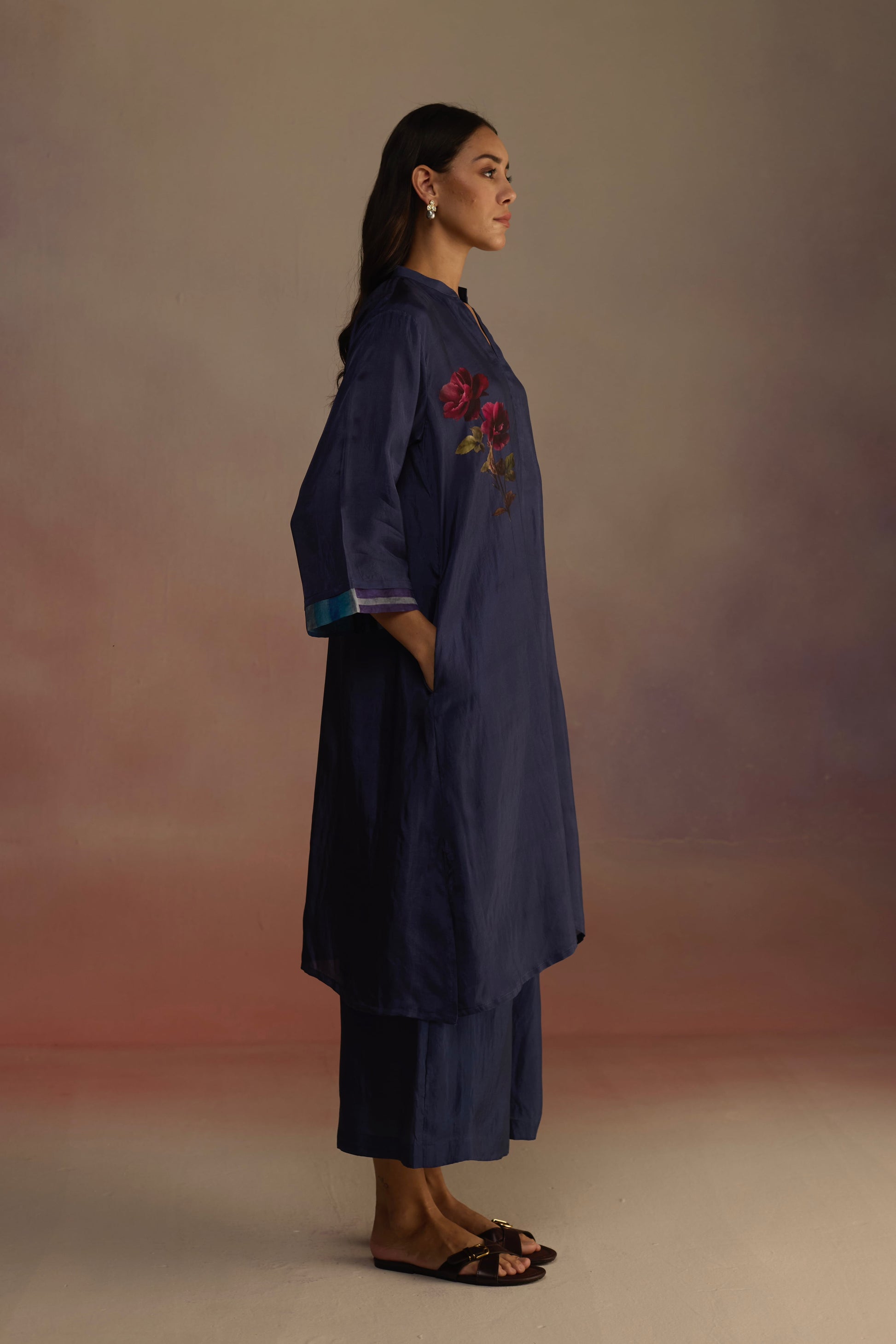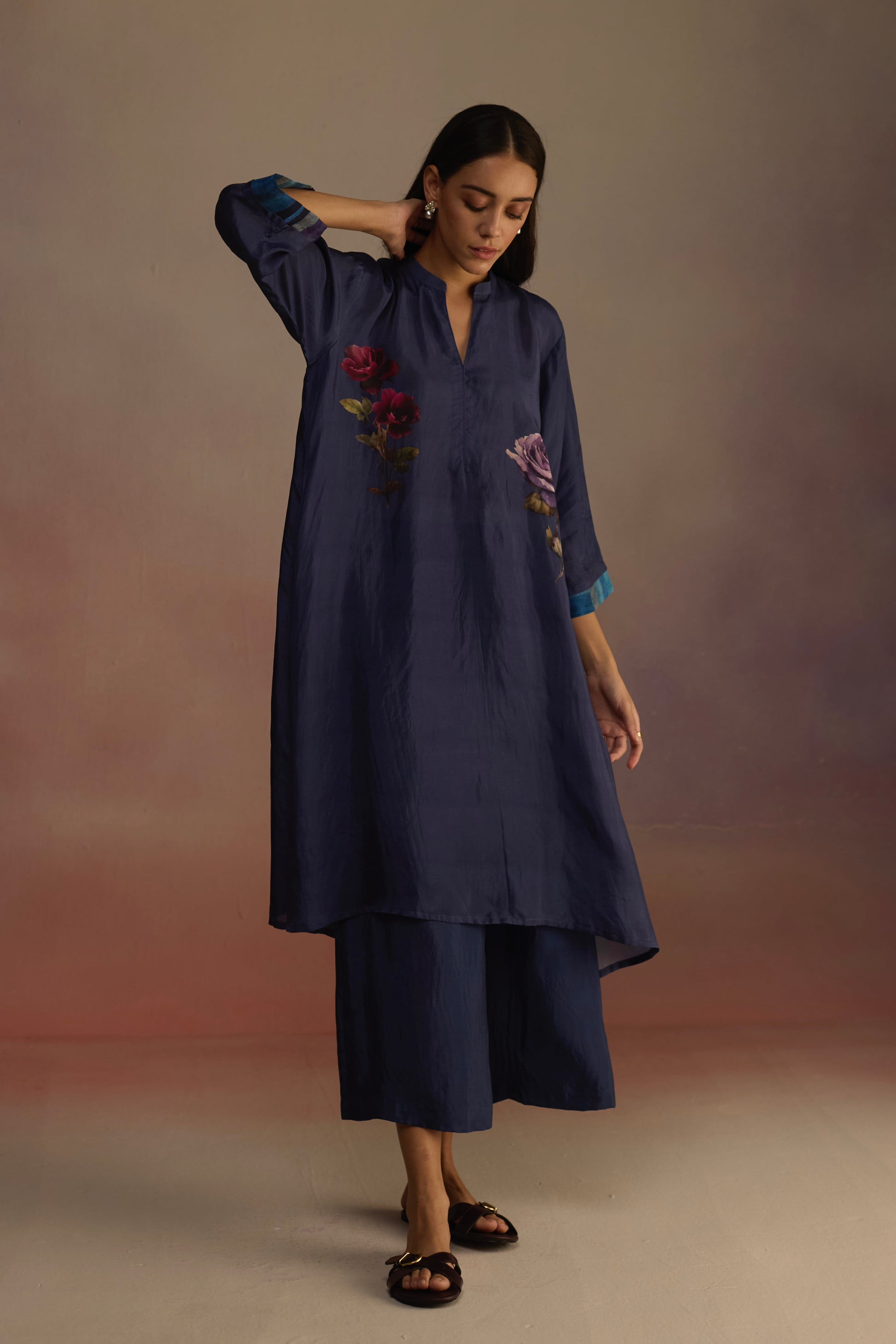 A flowy, comfortable a-line kurta with a neck slit and hand-drawn watercolor floral motifs on both sides of the yoke. The cuffs feature paper-pieced, hand-sketched print. Paired with wide-legged pants.