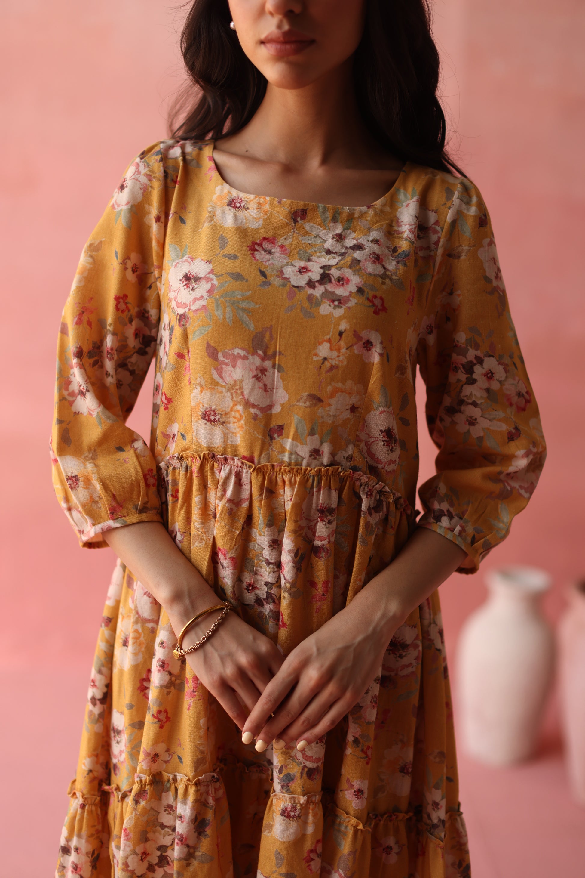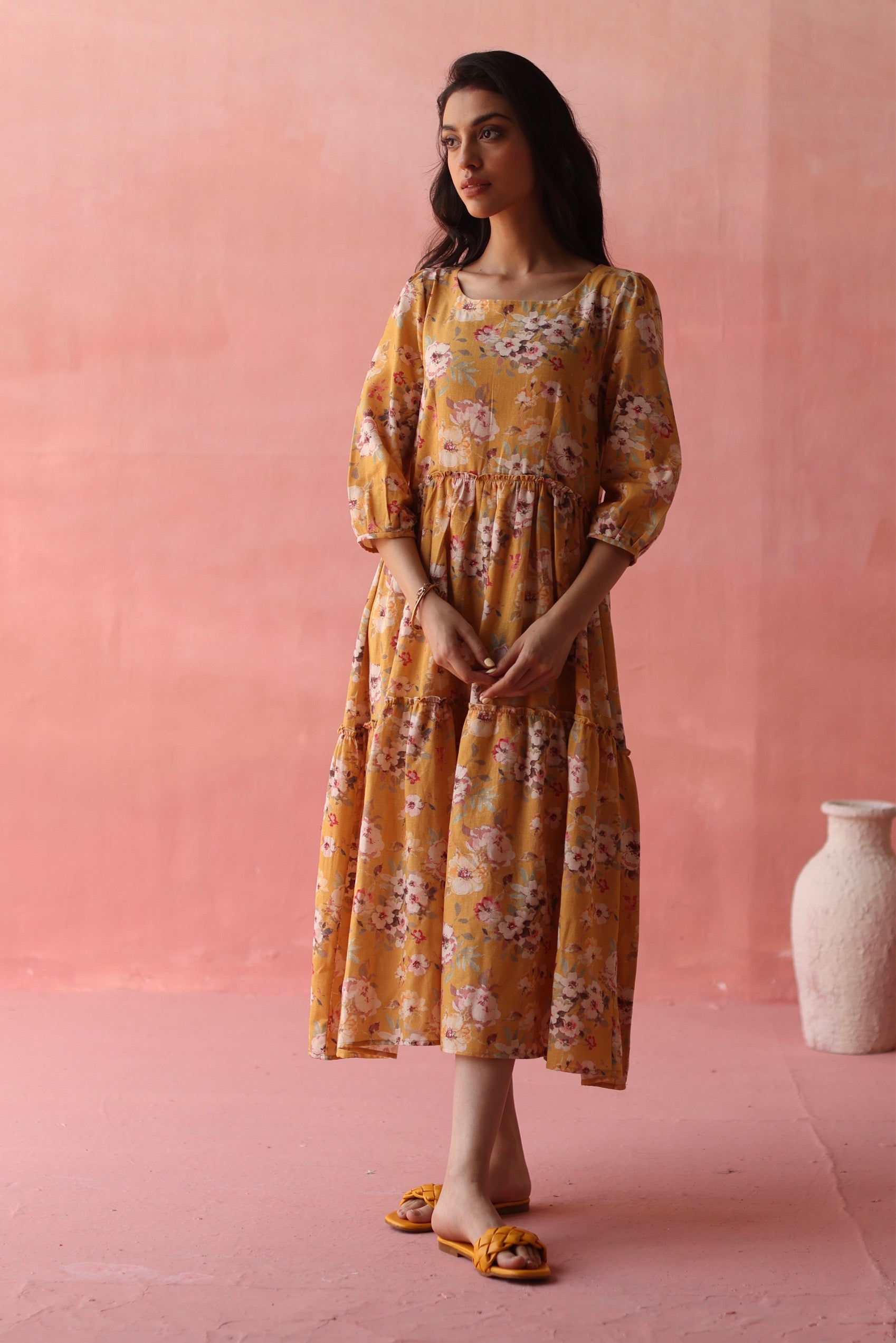 The romaine dress is made with fine linen fabric to give you the utmost comfort and is adorned with a floral print featuring various types of flowers and foliage. The dress is a charming and feminine garment that falls to a mid-length and is designed with multiple tiers or layers that create a beautiful cascading effect, adding volume and movement to the dress.