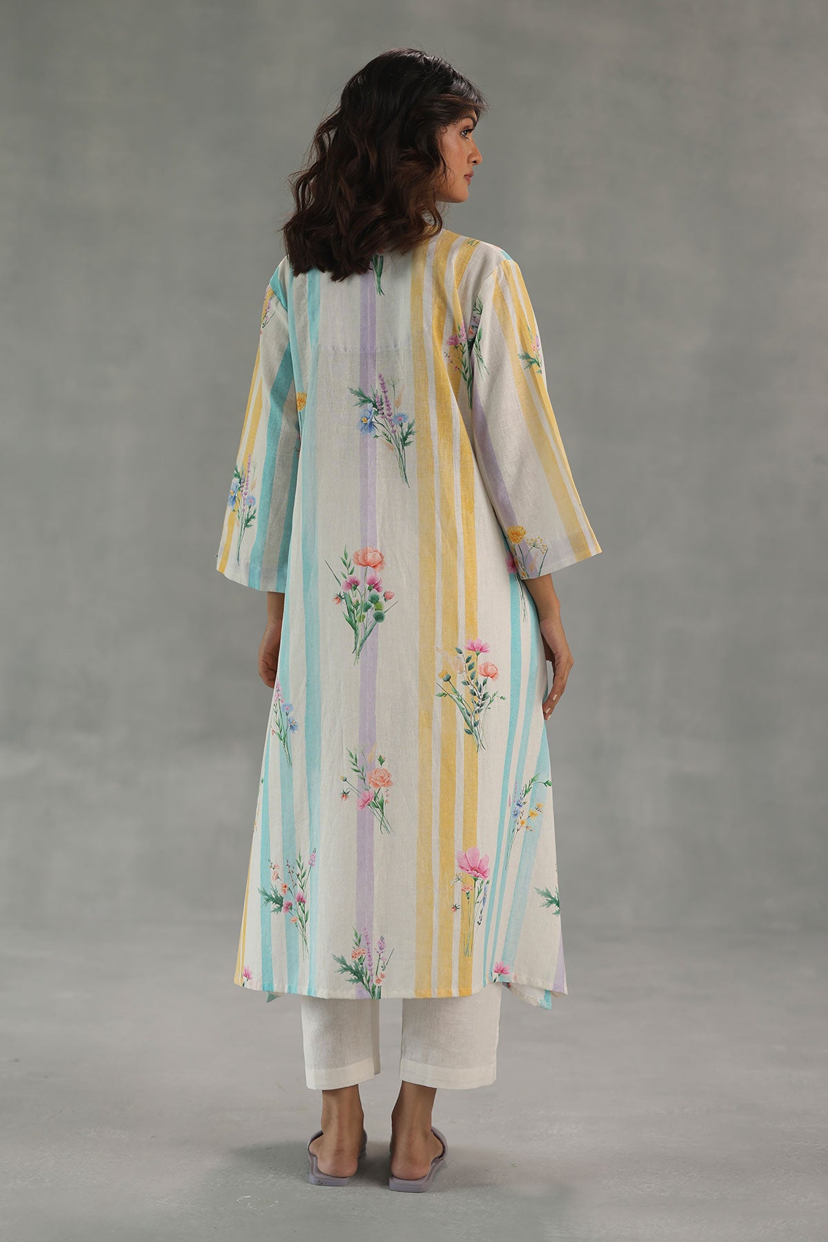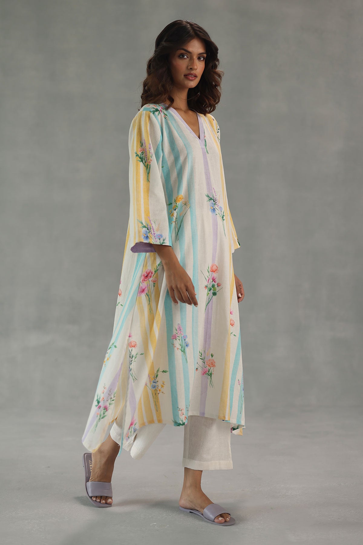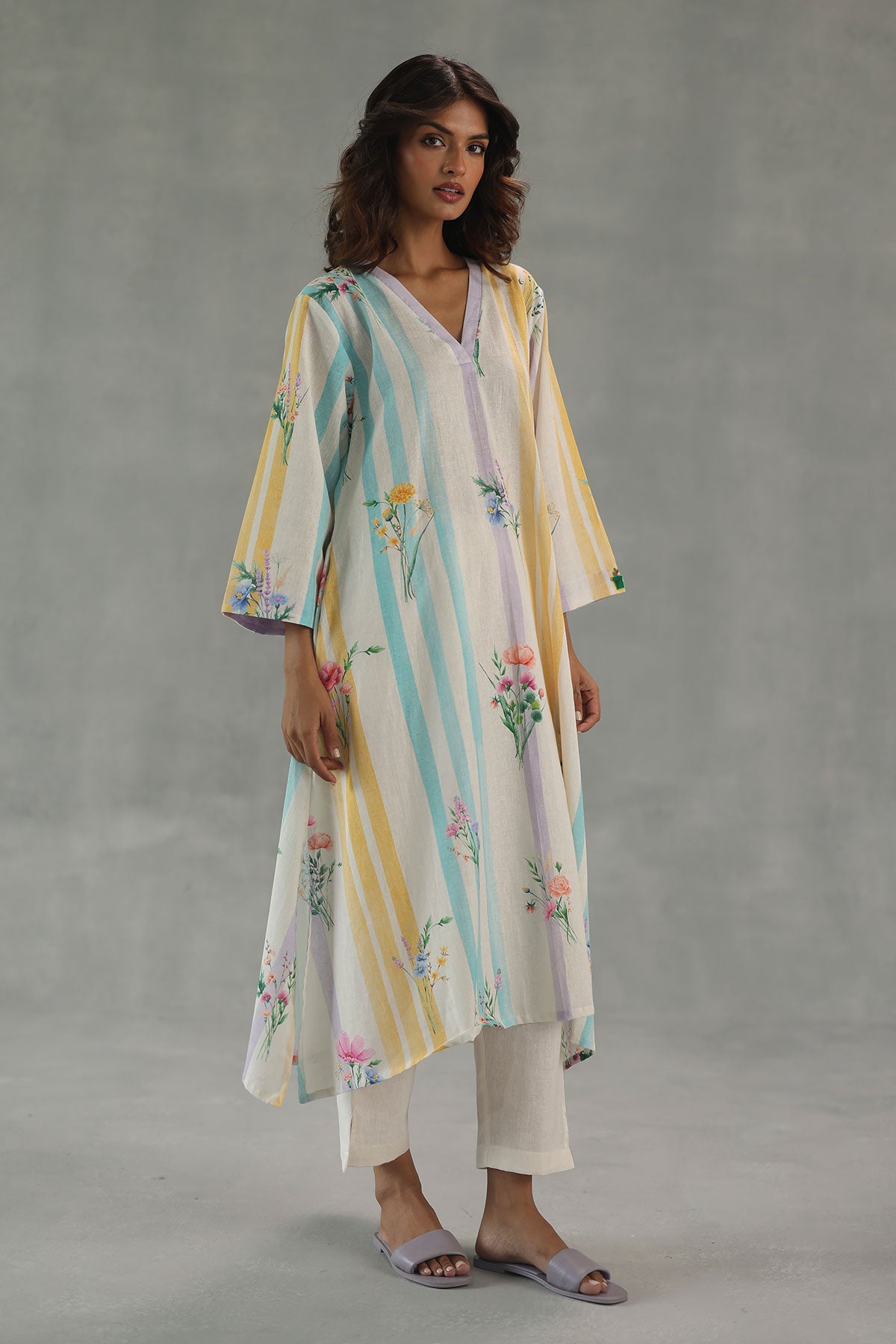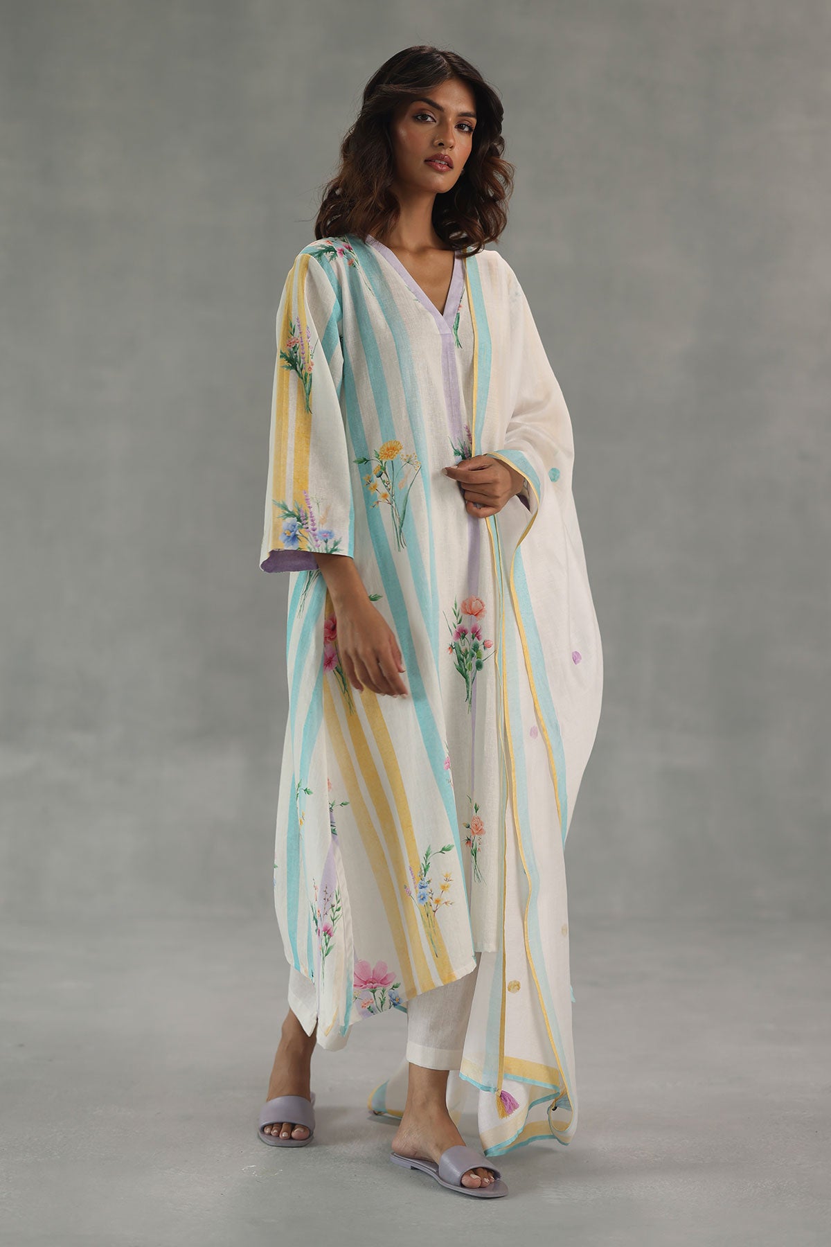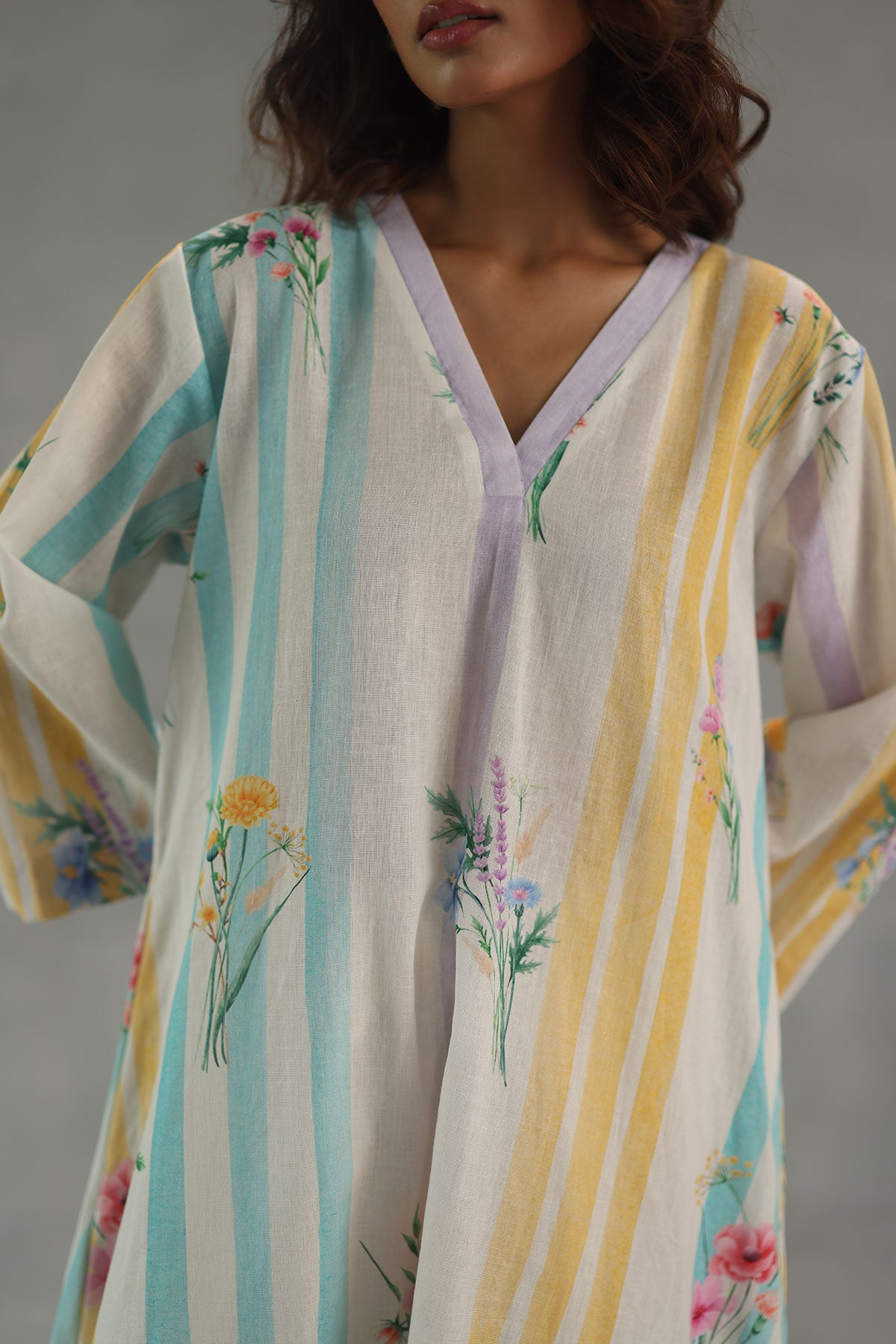 Light, playful, and refreshing, the dahlia kurta set features soft watercolor stripes in soothing aqua and lemon, scattered with dainty floral motifs all over. The gentle blend of colors and delicate detailing lends an effortless charm to this relaxed silhouette perfect for sunlit gatherings or easy festive dressing.