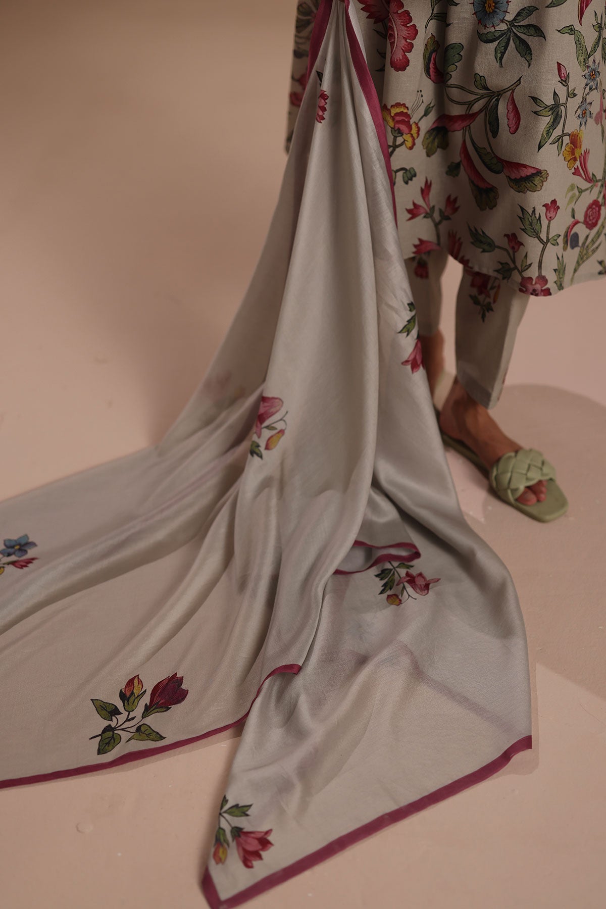 A Chanderi stole in Beige, adorned with contrasting magenta floral motifs. Versatile and elegant, perfect to style with Roza outfits.