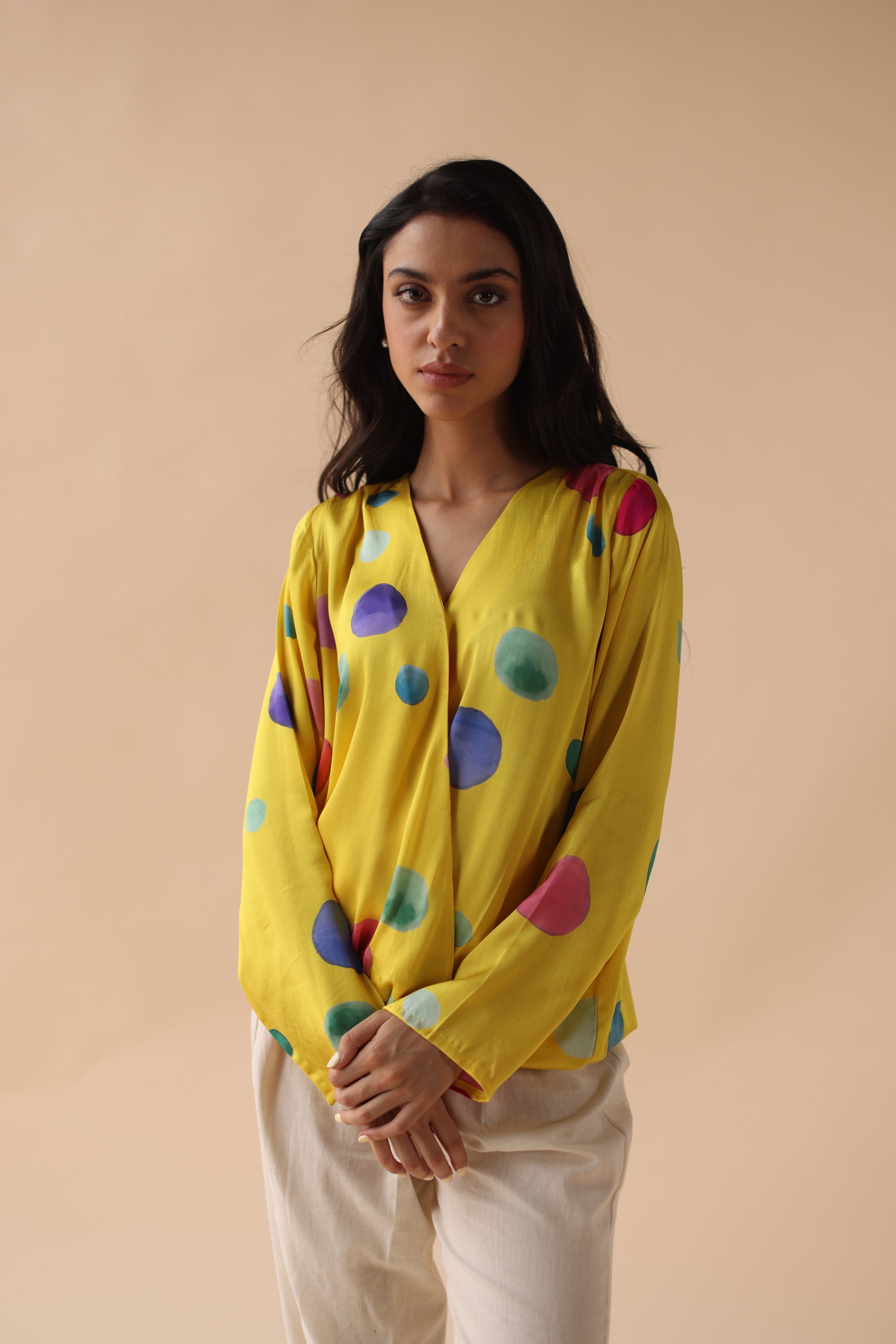 The diara top is a summer favourite with a flattering silhouette on buttery silk satin. With hand drawn polka motifs and an elasticated hem, the silhouette is feminine and chic.