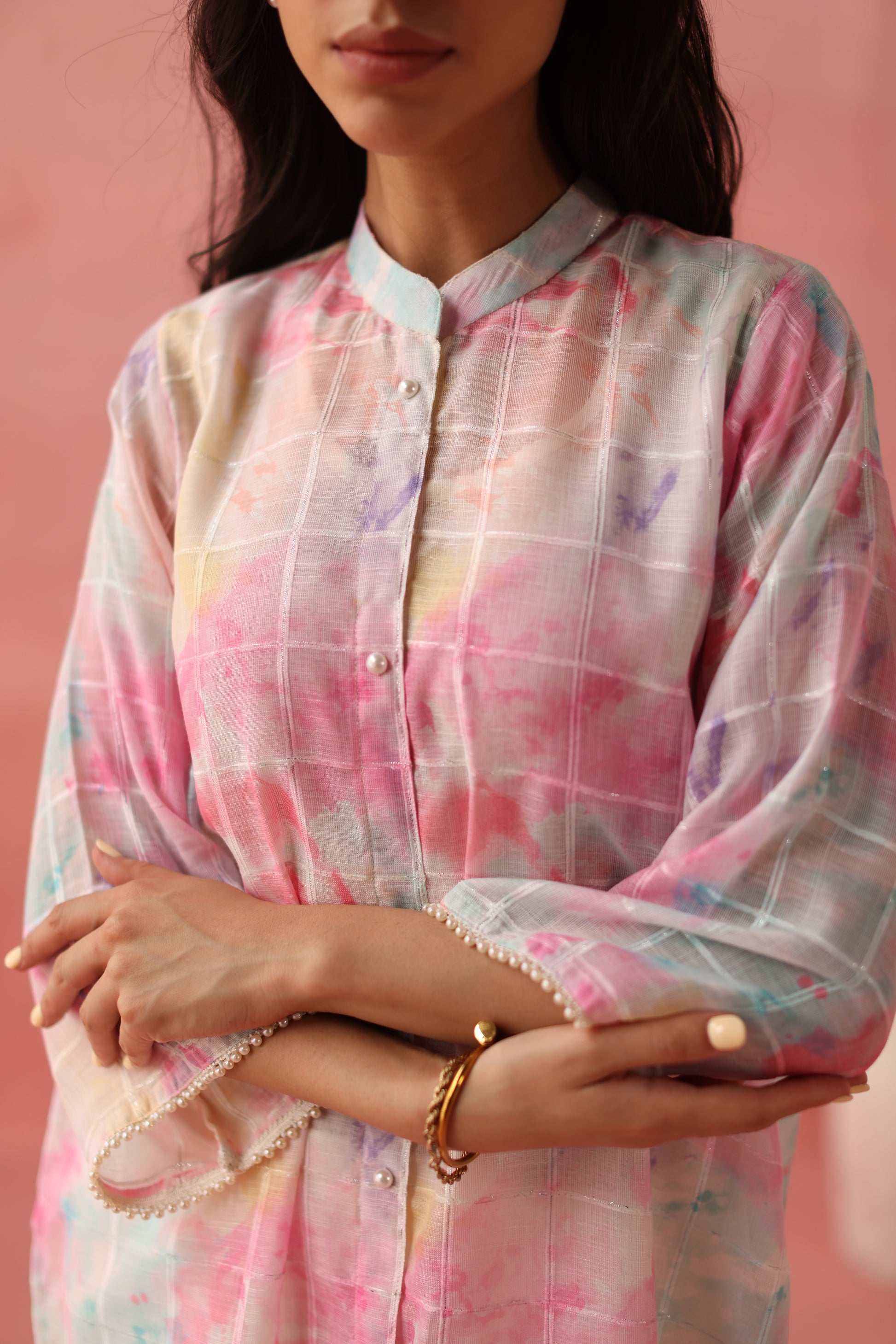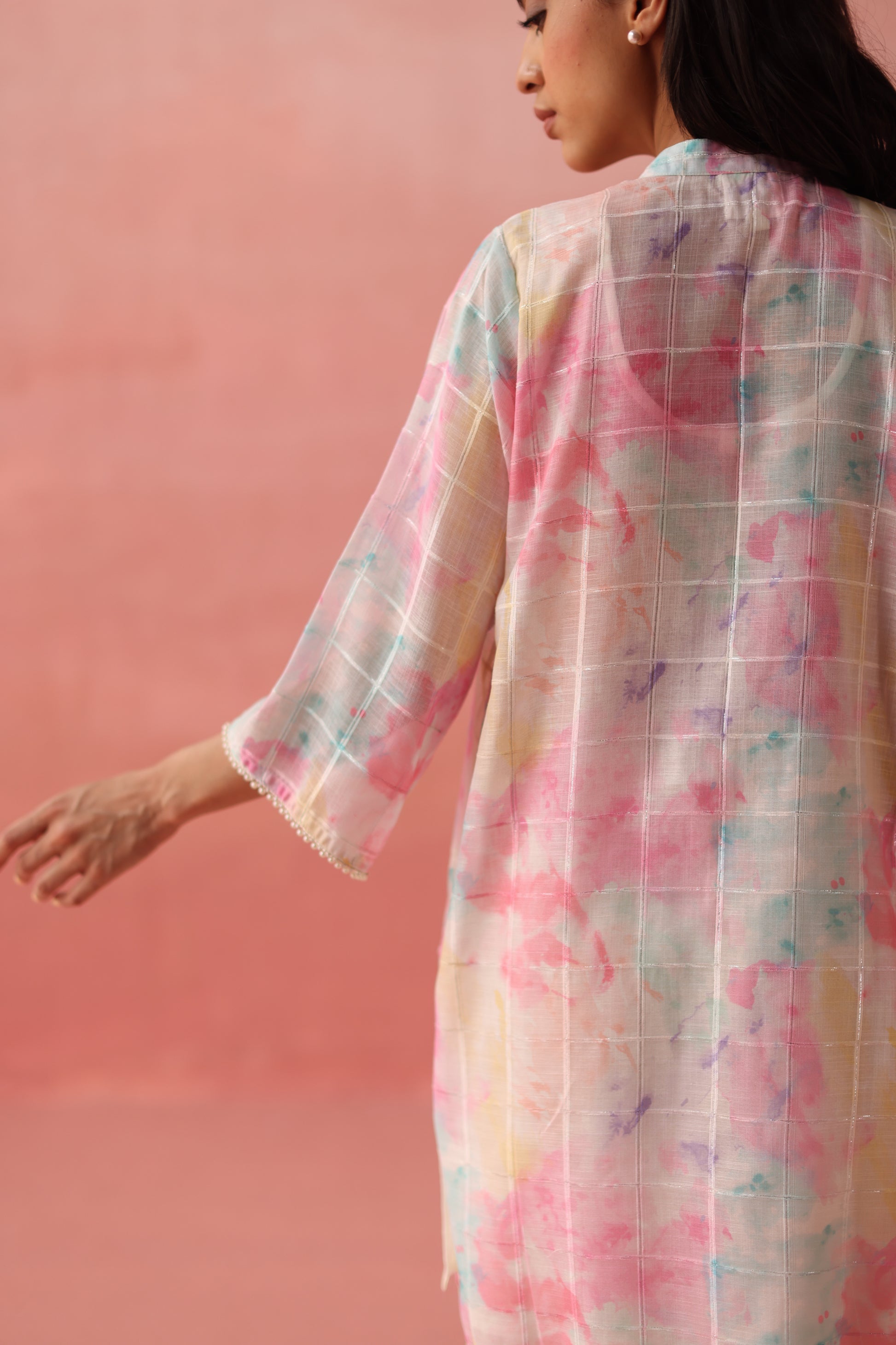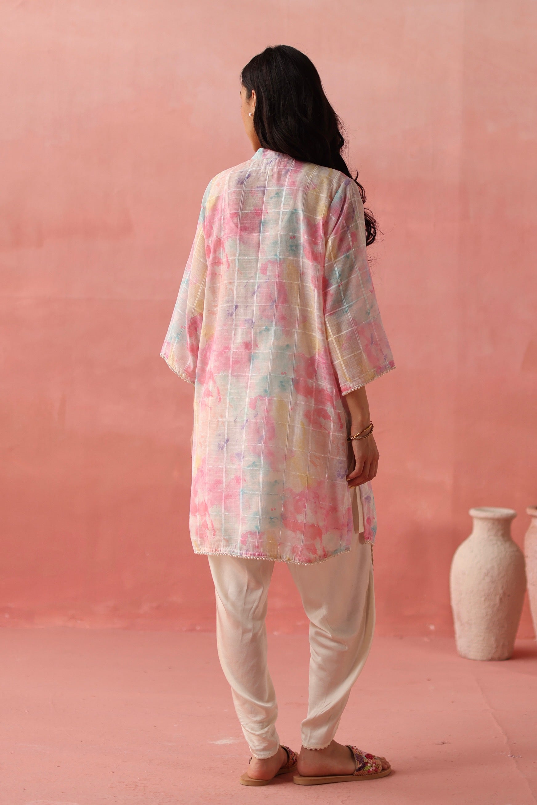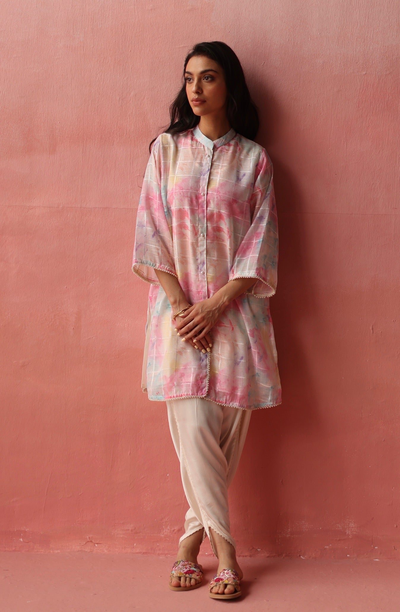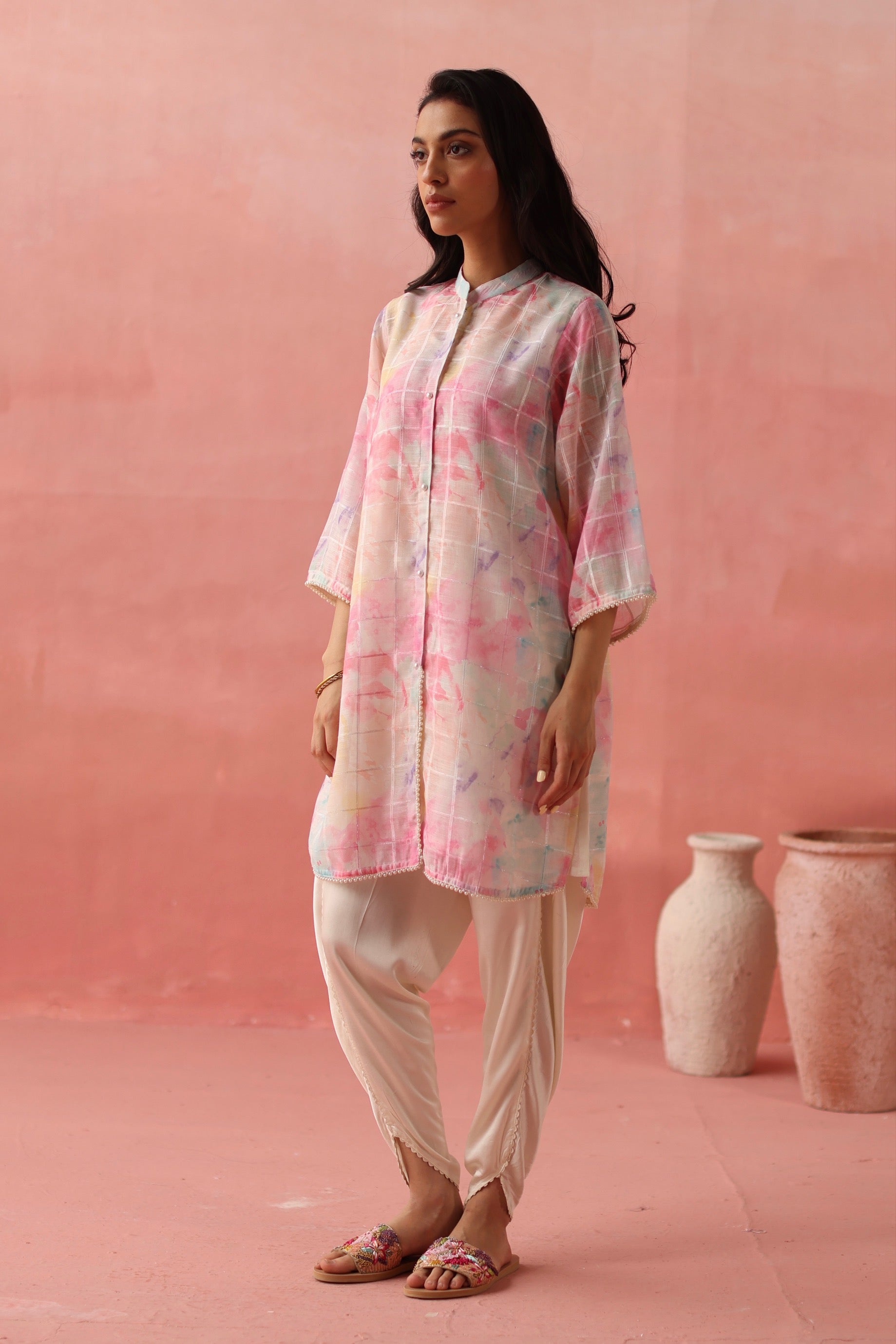 The elora co-ord set is made with the finest and most lightweight linen fabric. The co-ord set includes a short-length a-line kurta and a laced dhoti pants. The kurta has floral prints with flared sleeves, is adorned with pearl buttons, and has pearl lace outlining on the front, making it a perfect festive pick me up.