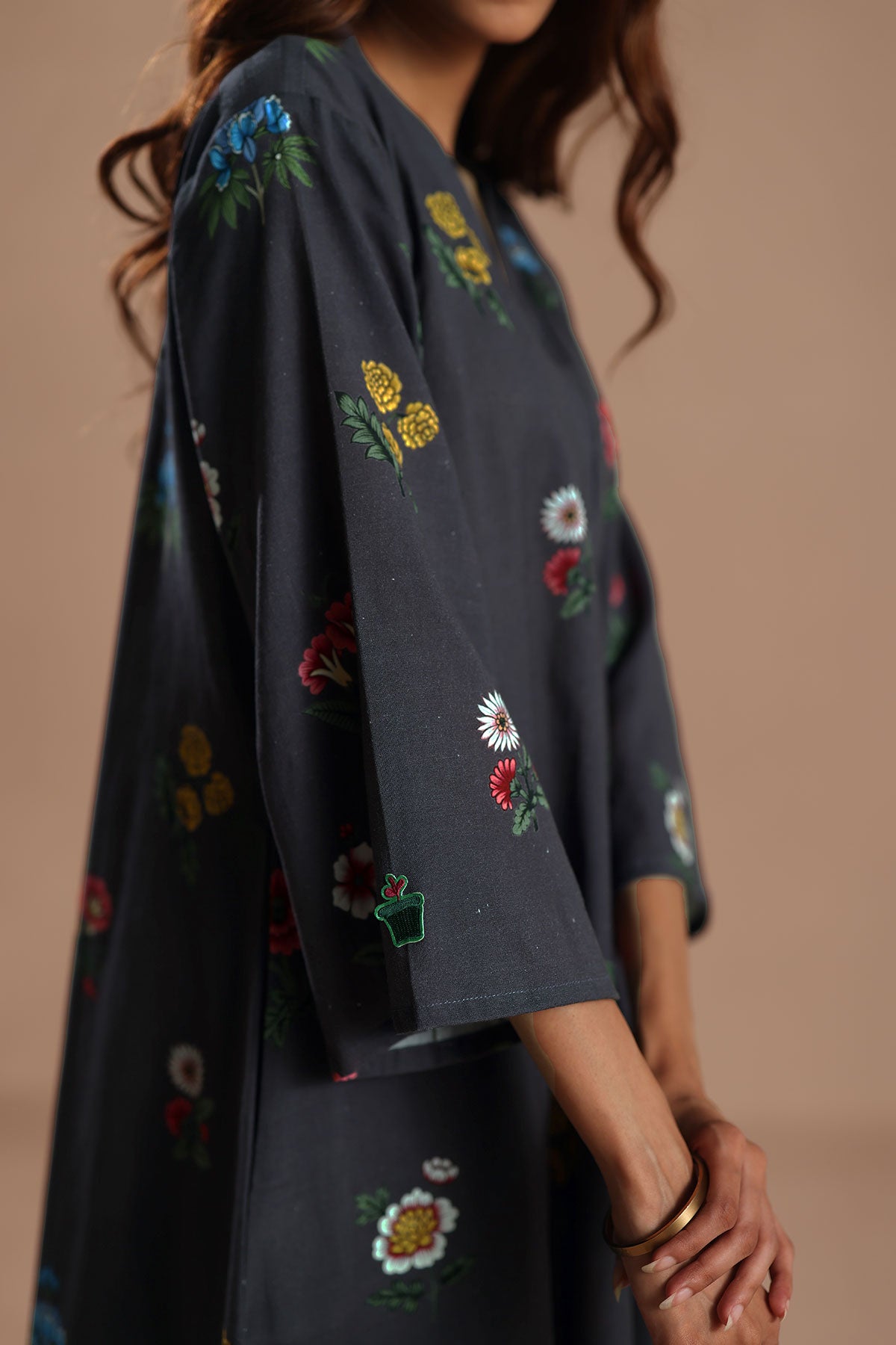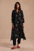An A-line kurta with floral watercolour motifs, V-neck and a side slit. Paired with solid black box pleat bottoms, making it the perfect fall-ready ensemble.