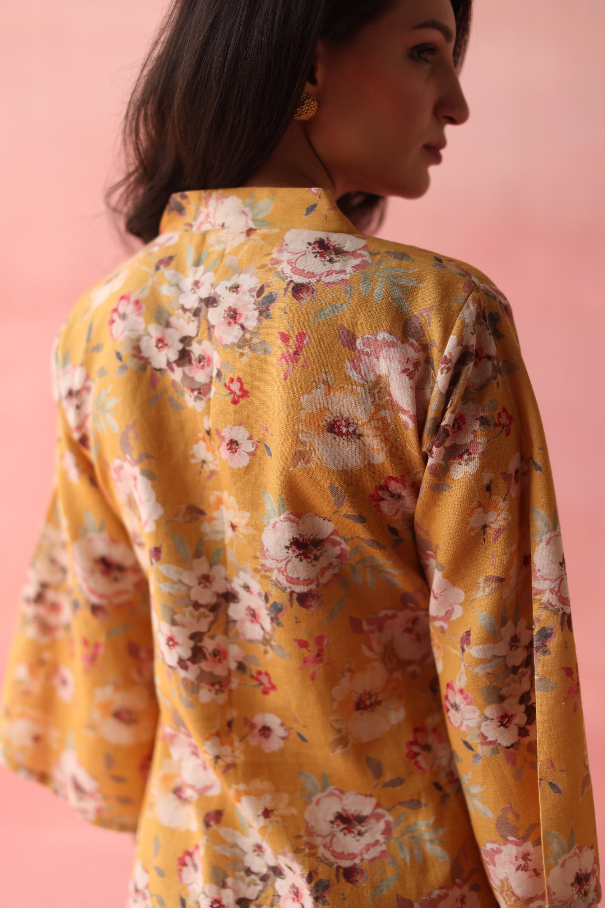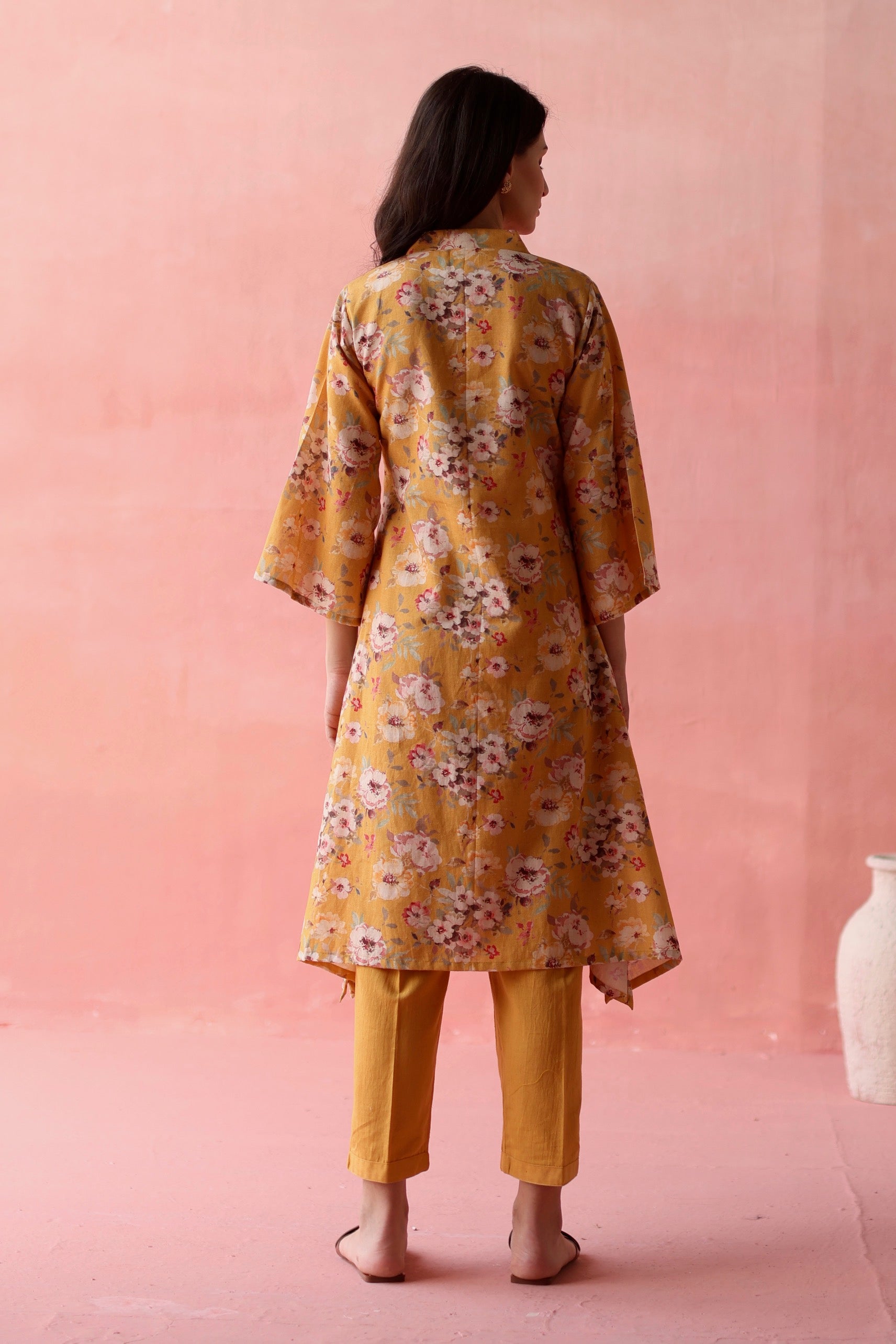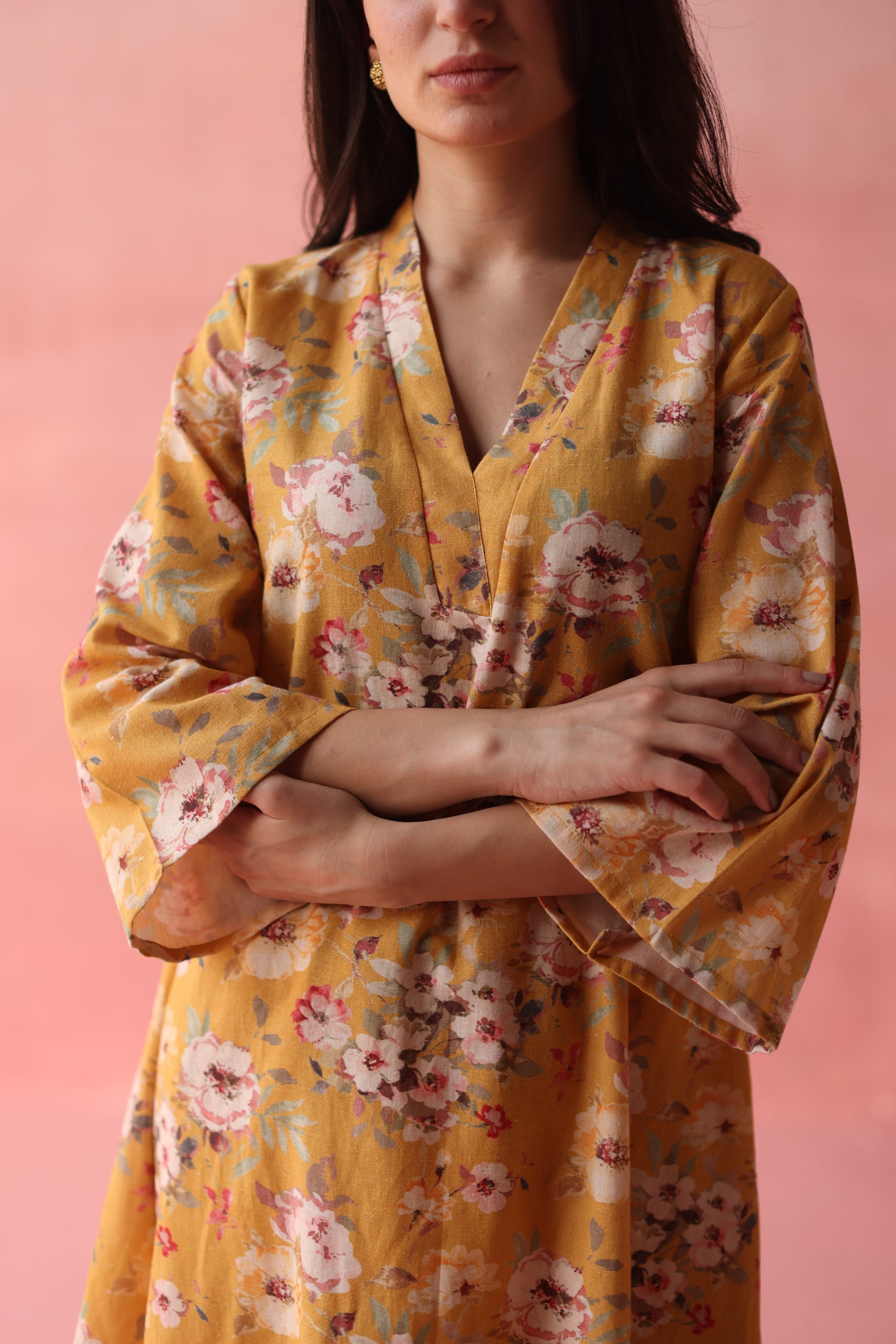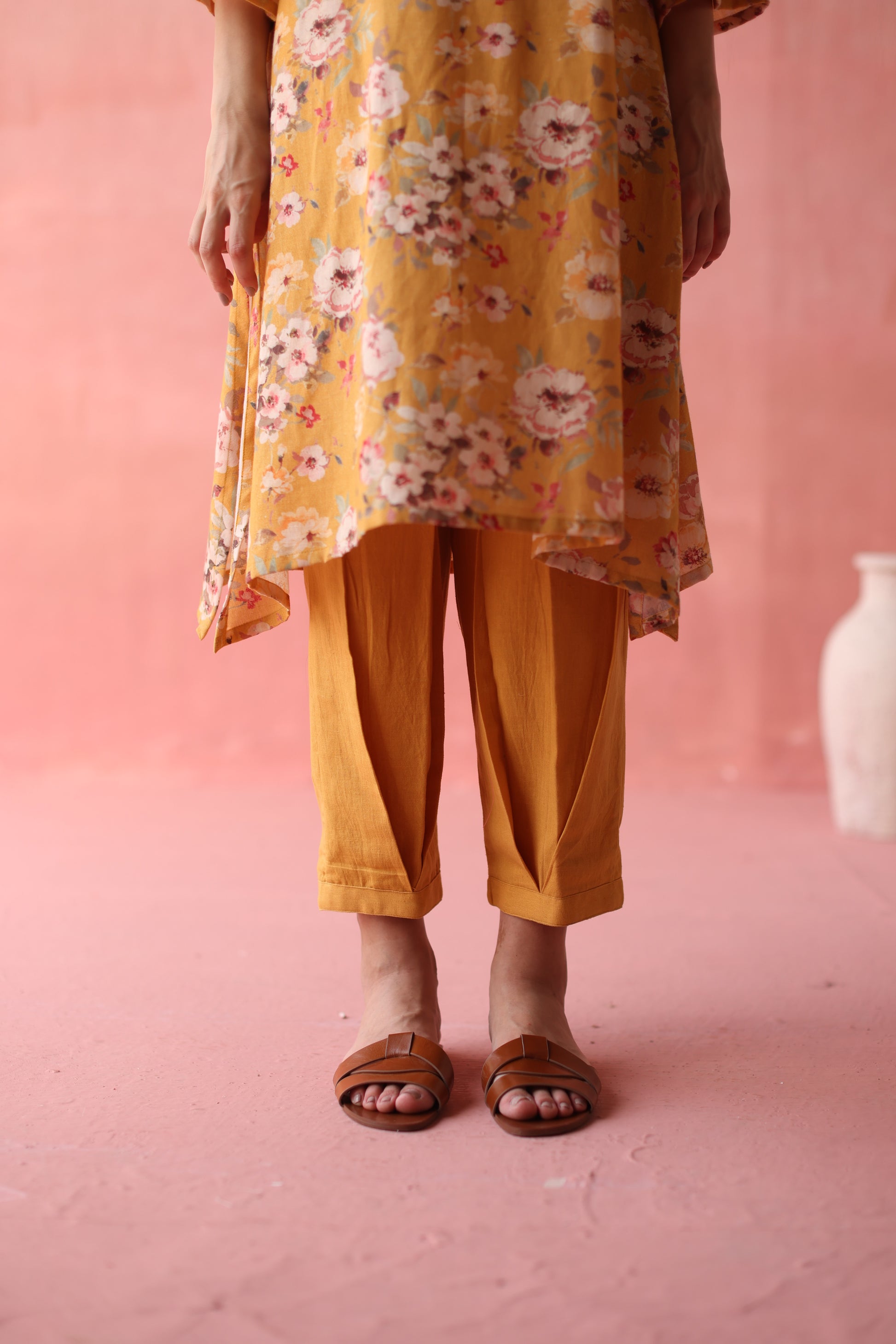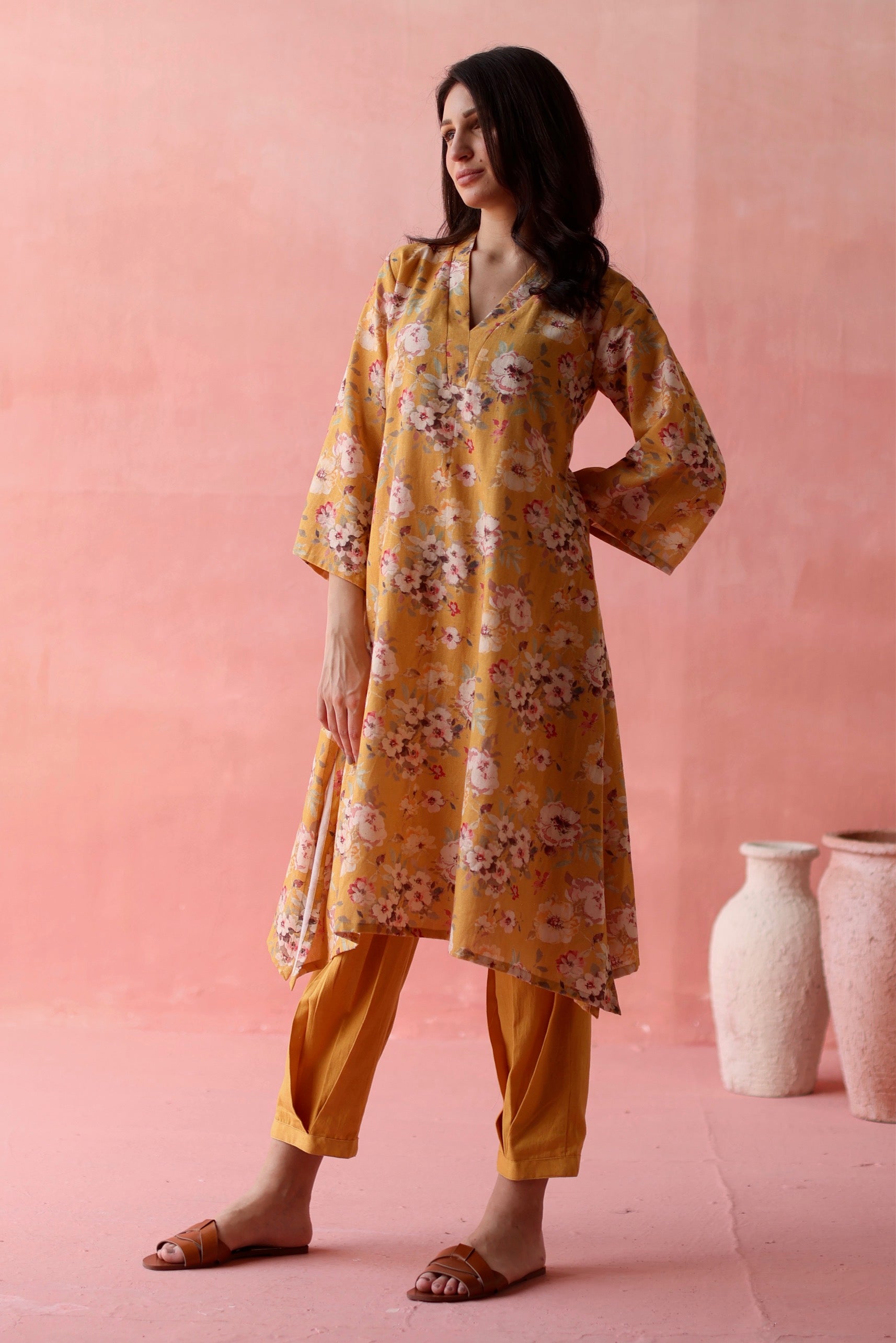 The evelyn kurta set combines contemporary design elements with traditional sensibilities. The kurta features a flattering v neckline with a broad border; the floral print is delicately spread across the kurta, adding a touch of femininity and grace to the garment. Complementing the kurta is a box pleated pair of pants.