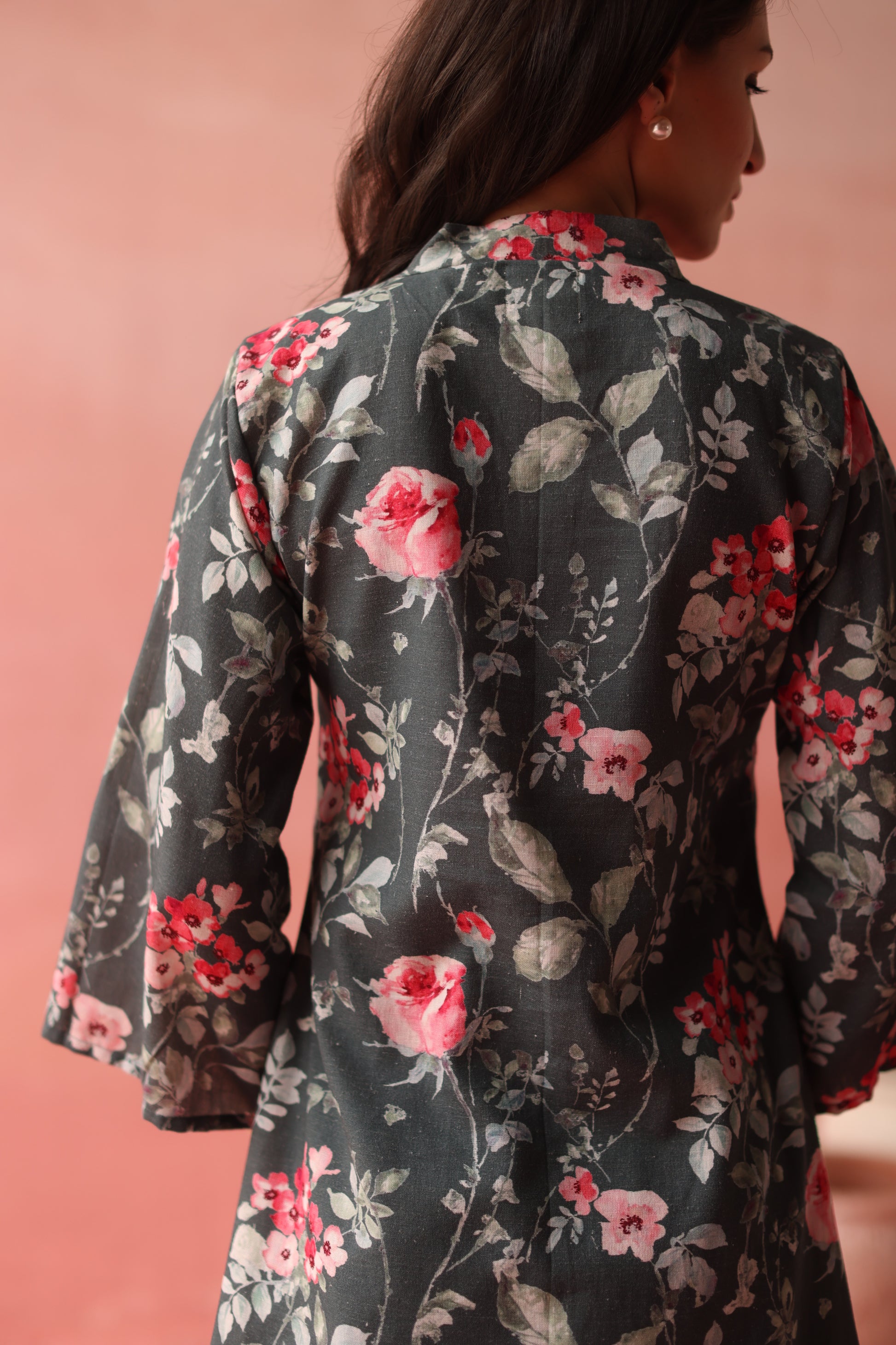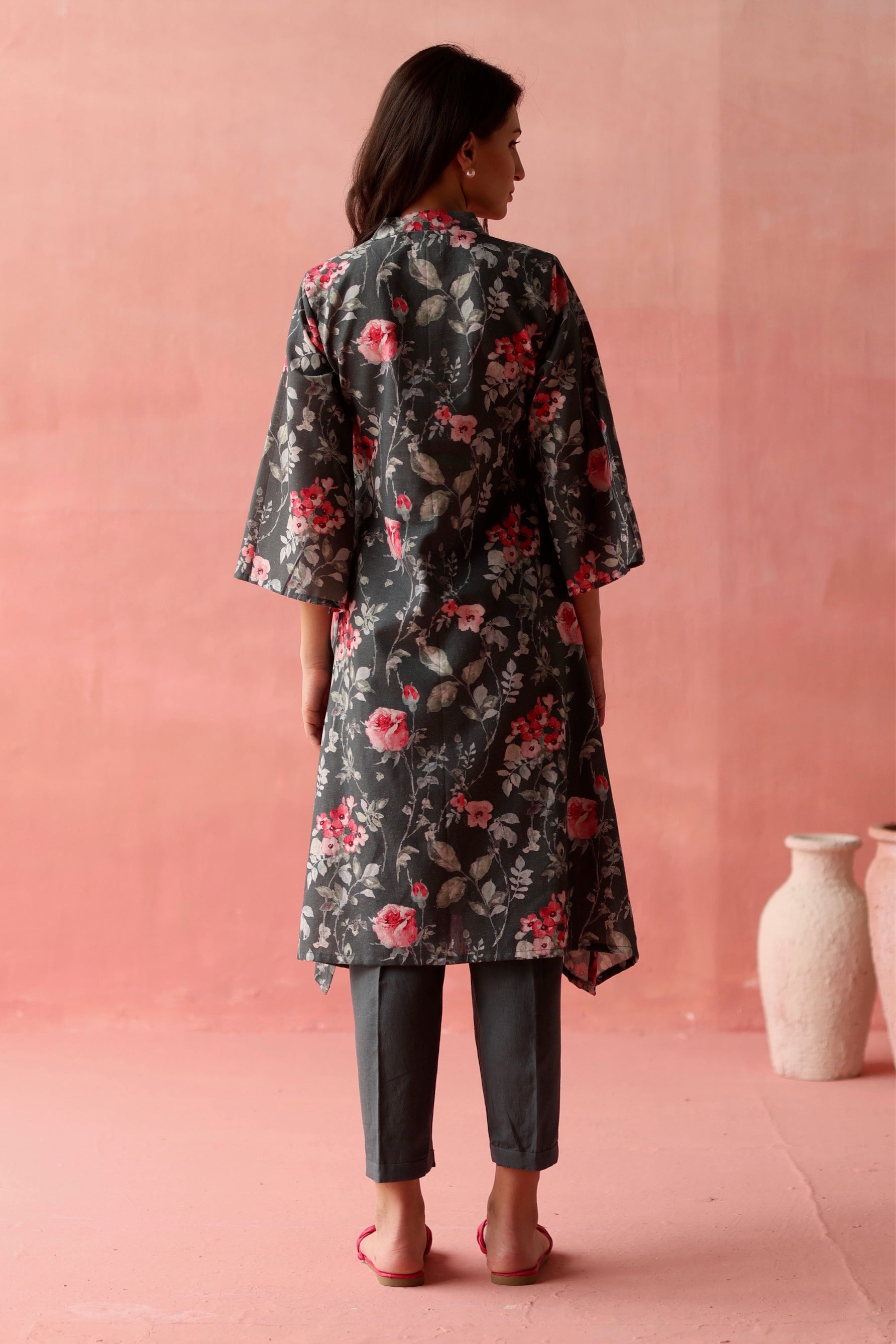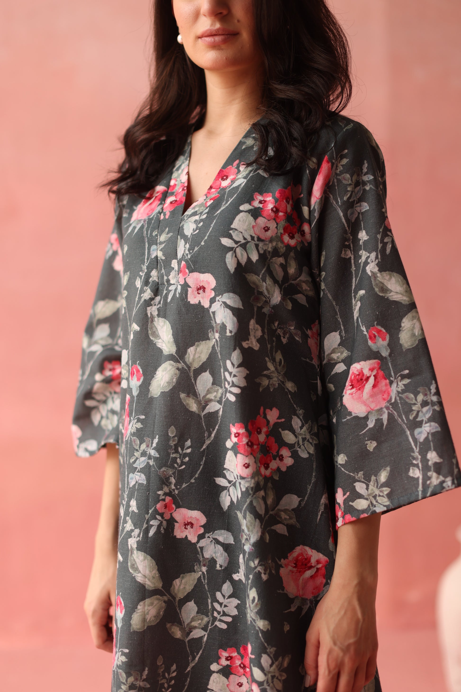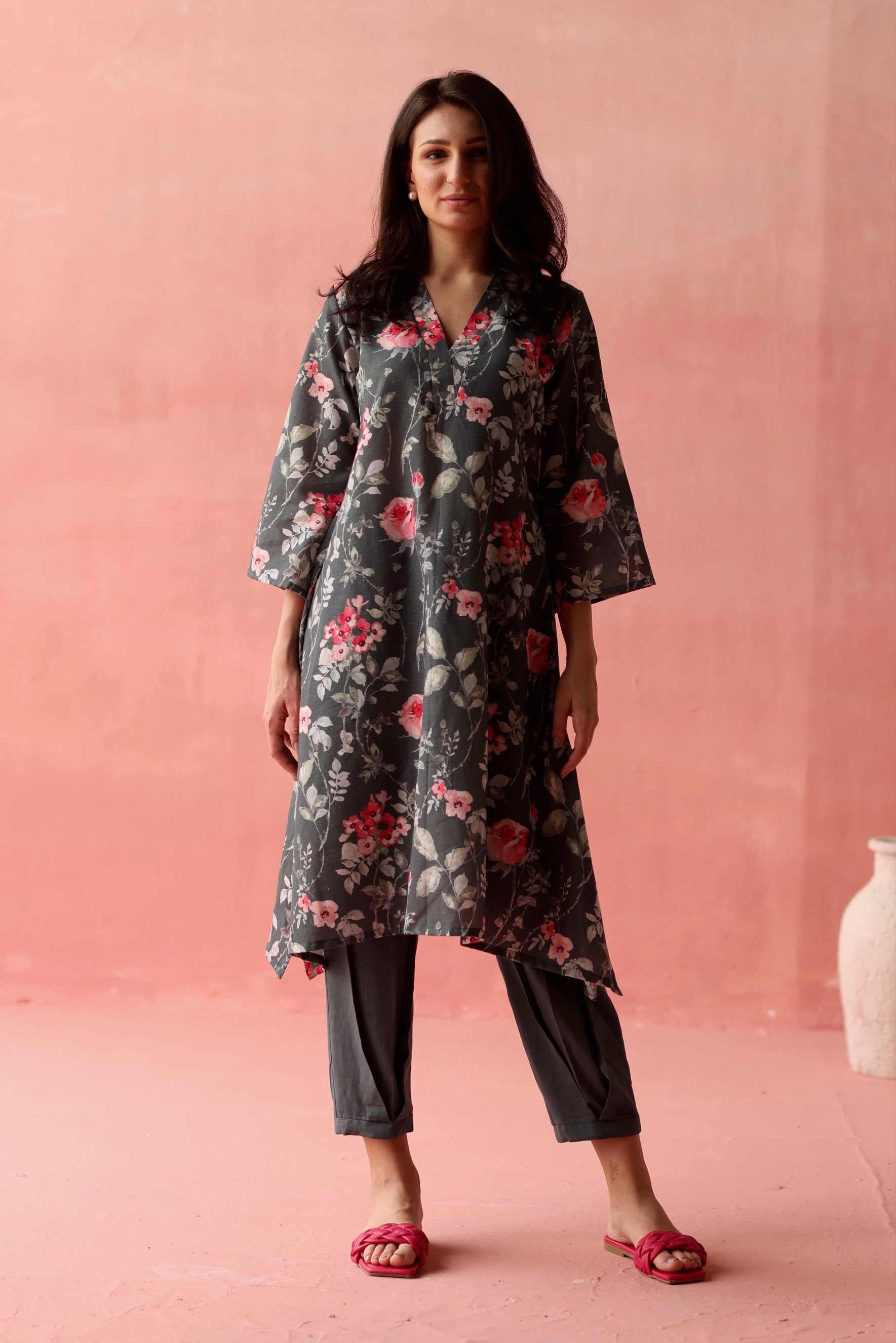 The evelyn kurta set combines contemporary design elements with traditional sensibilities. The kurta features a flattering v neckline with a broad border; the floral print is delicately spread across the kurta, adding a touch of femininity and grace to the garment. Complementing the kurta is a box pleated pair of pants.