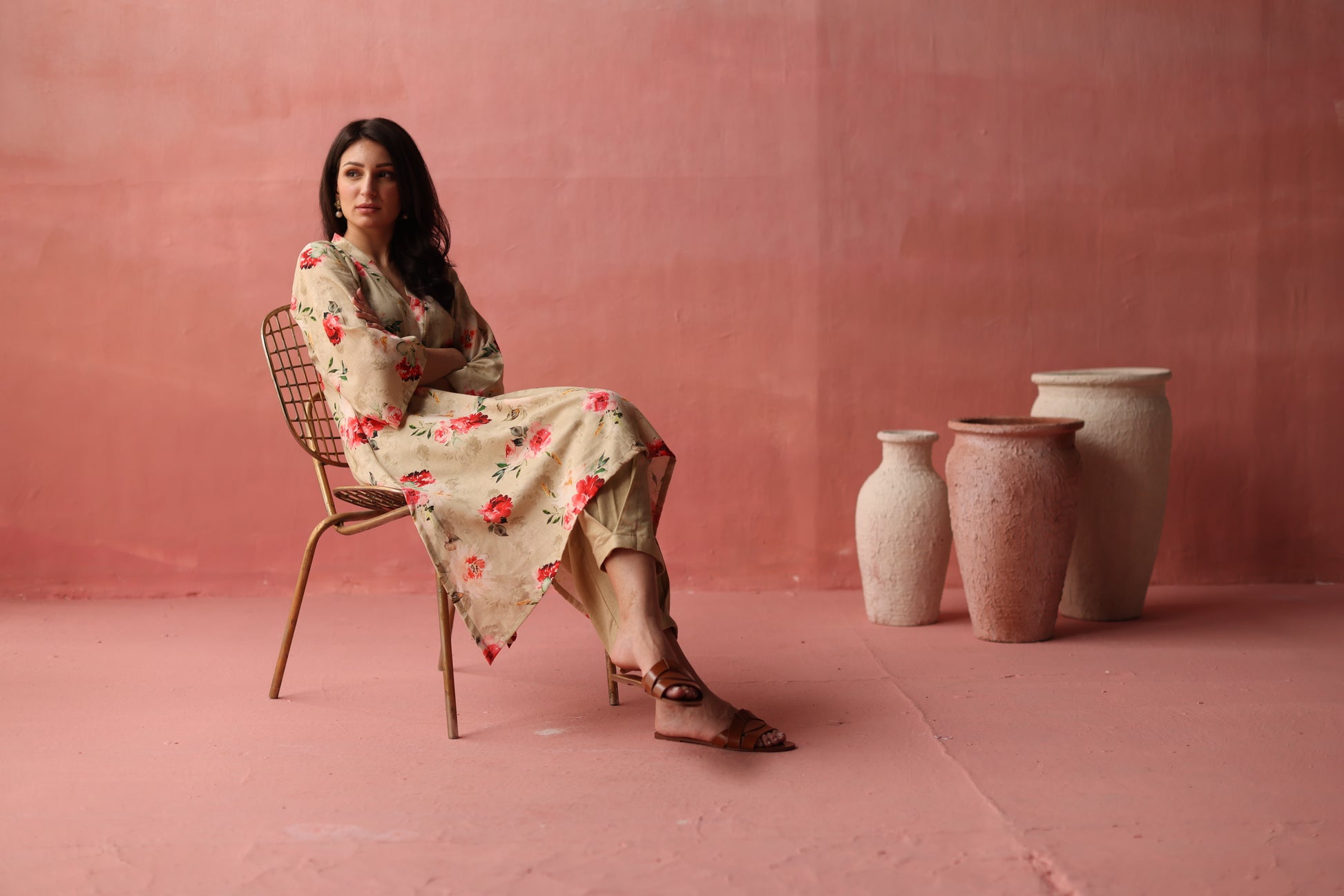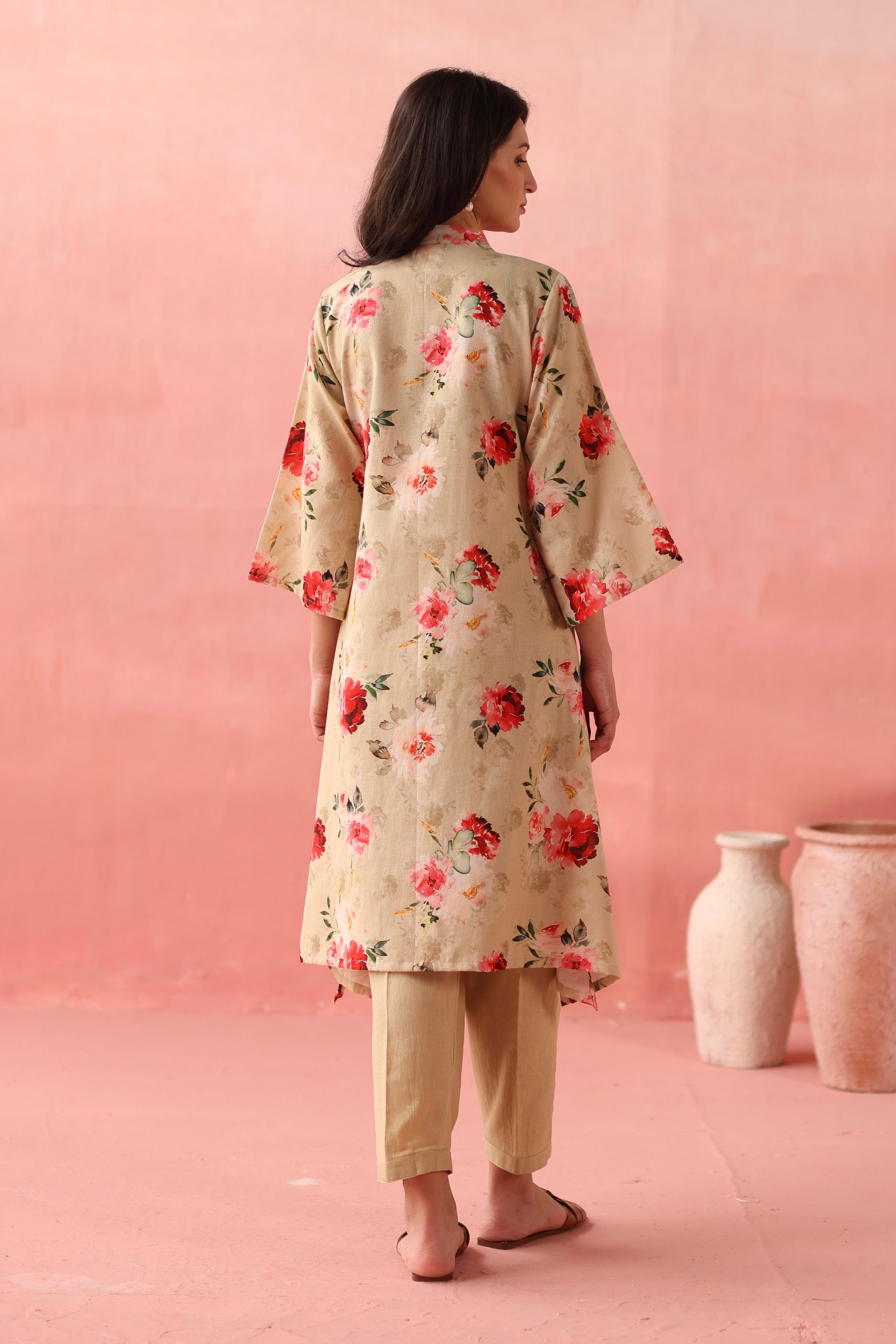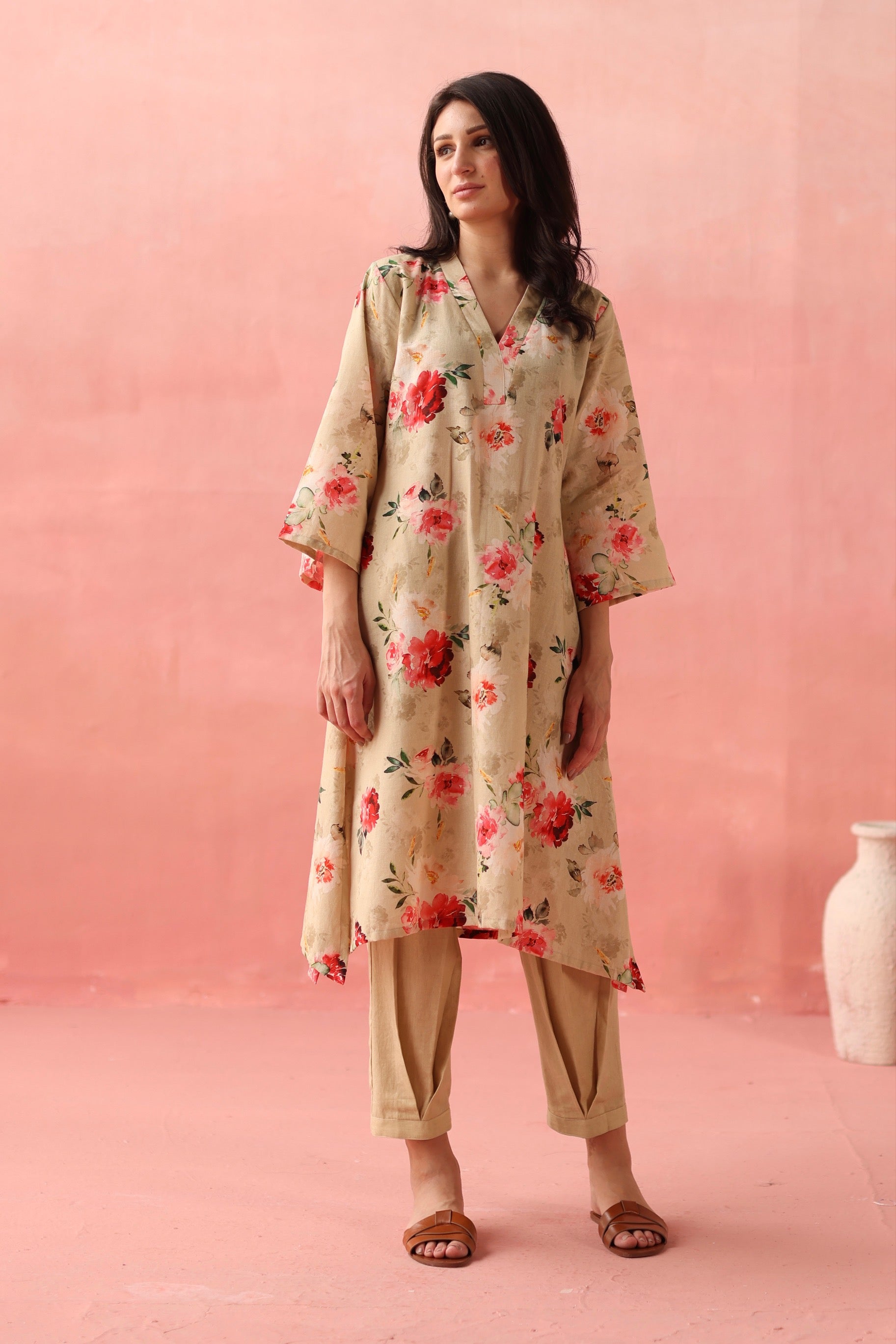 The evelyn kurta set combines contemporary design elements with traditional sensibilities. The kurta features a flattering v neckline with a broad border; the floral print is delicately spread across the kurta, adding a touch of femininity and grace to the garment. Complementing the kurta is a box pleated pair of pants.