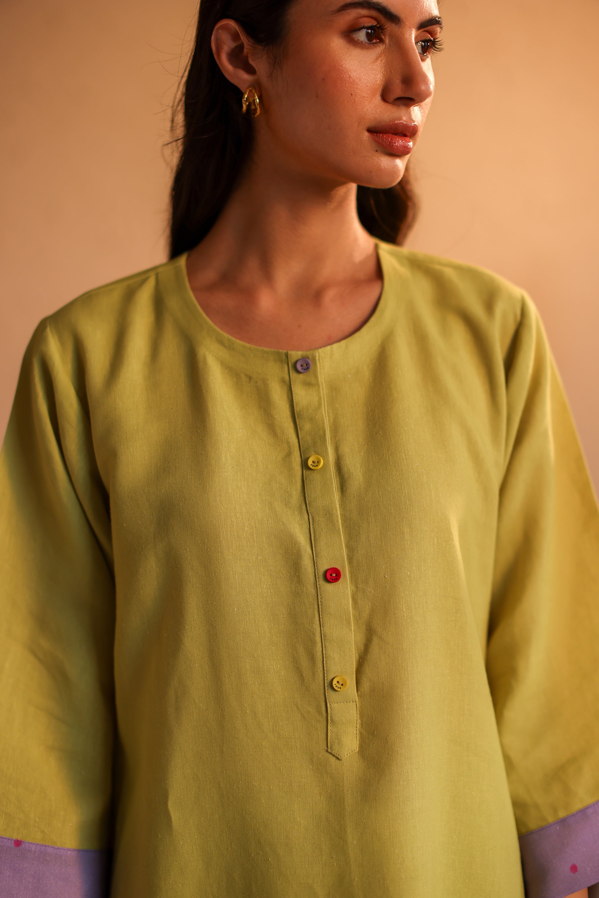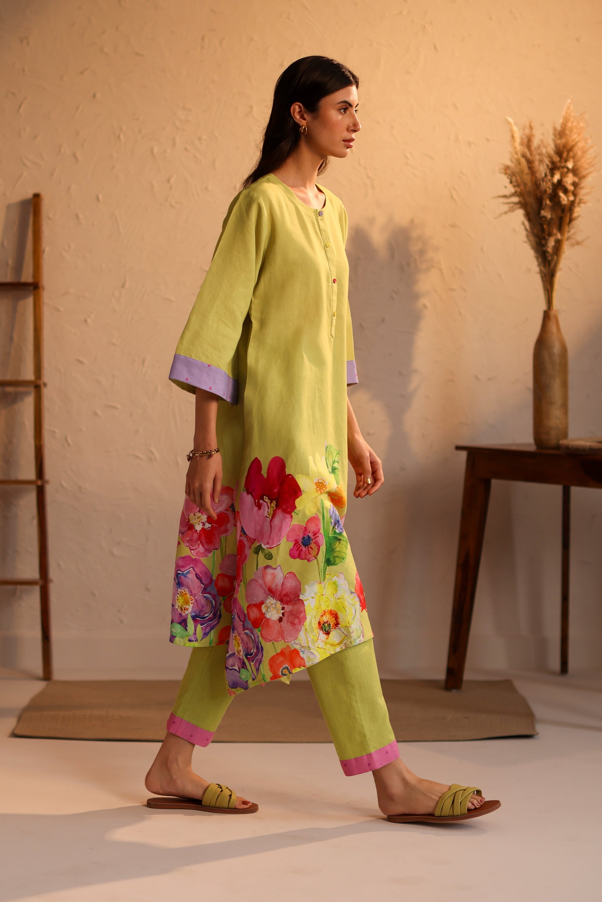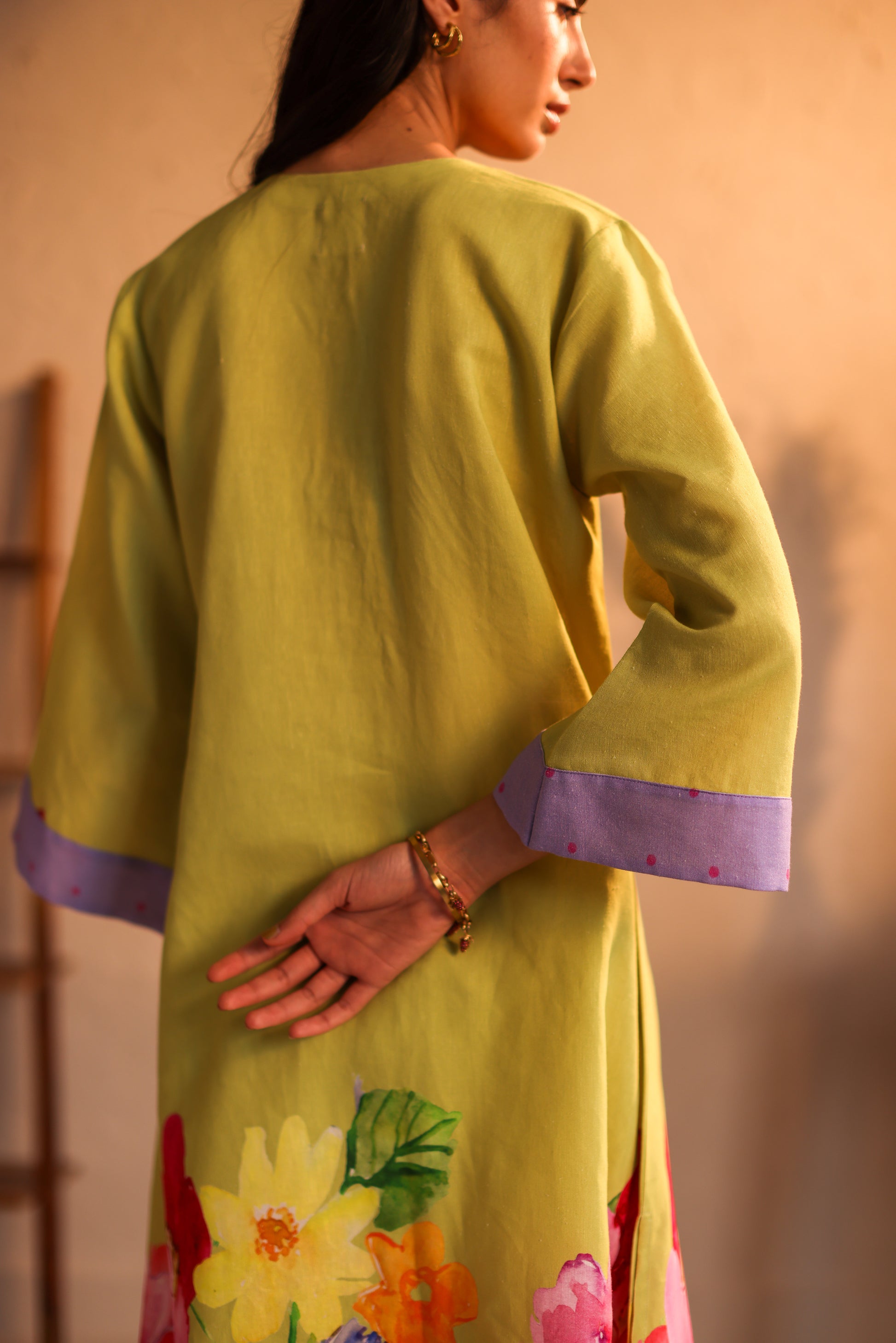 A-line kurta with a watercolour bunch of flowers at the flair. The relaxed silhouette features a pop of contrast on the sleeves along with roza's signature buttons. The kurta pairs well with the rasberry pants for a coordinated look.