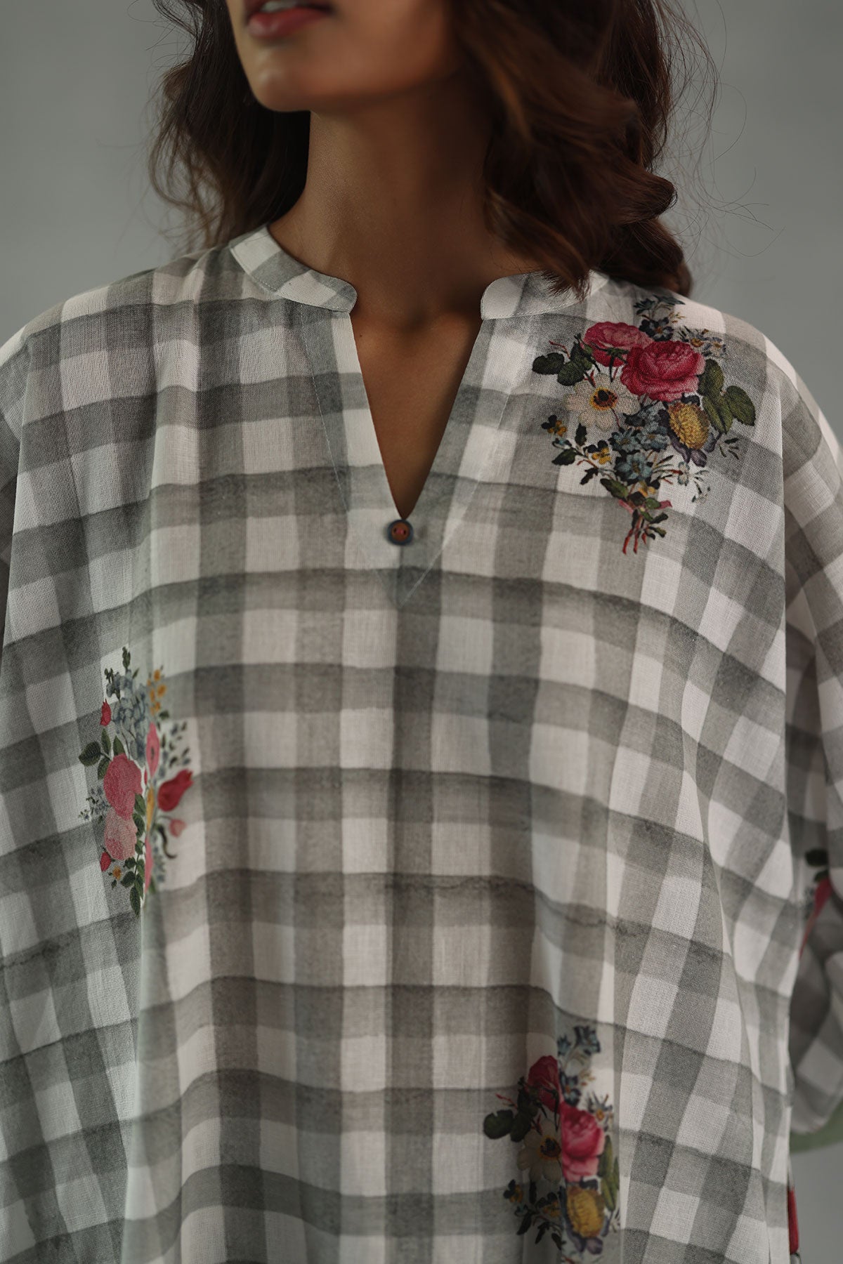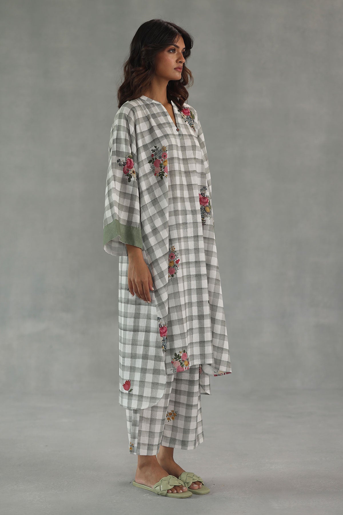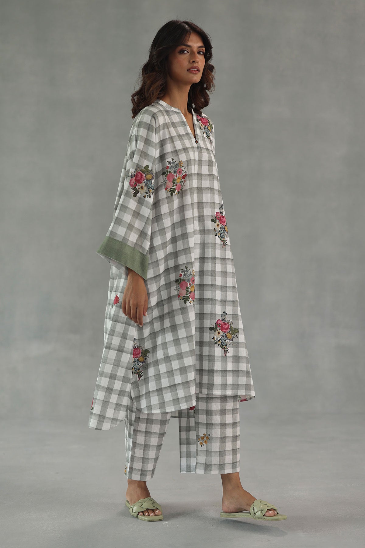 Artful and striking, the florentine kurta set features a kaftan-style kurta with an asymmetrical front and back, crafted in soft grey watercolor checks. Deep-hued floral motifs bloom across the silhouette, while contrasting sleeves add a playful edge to the design. Paired with matching grey check pants, this set blends bold prints with effortless comfort for a look that’s equal parts relaxed and statement-making.
