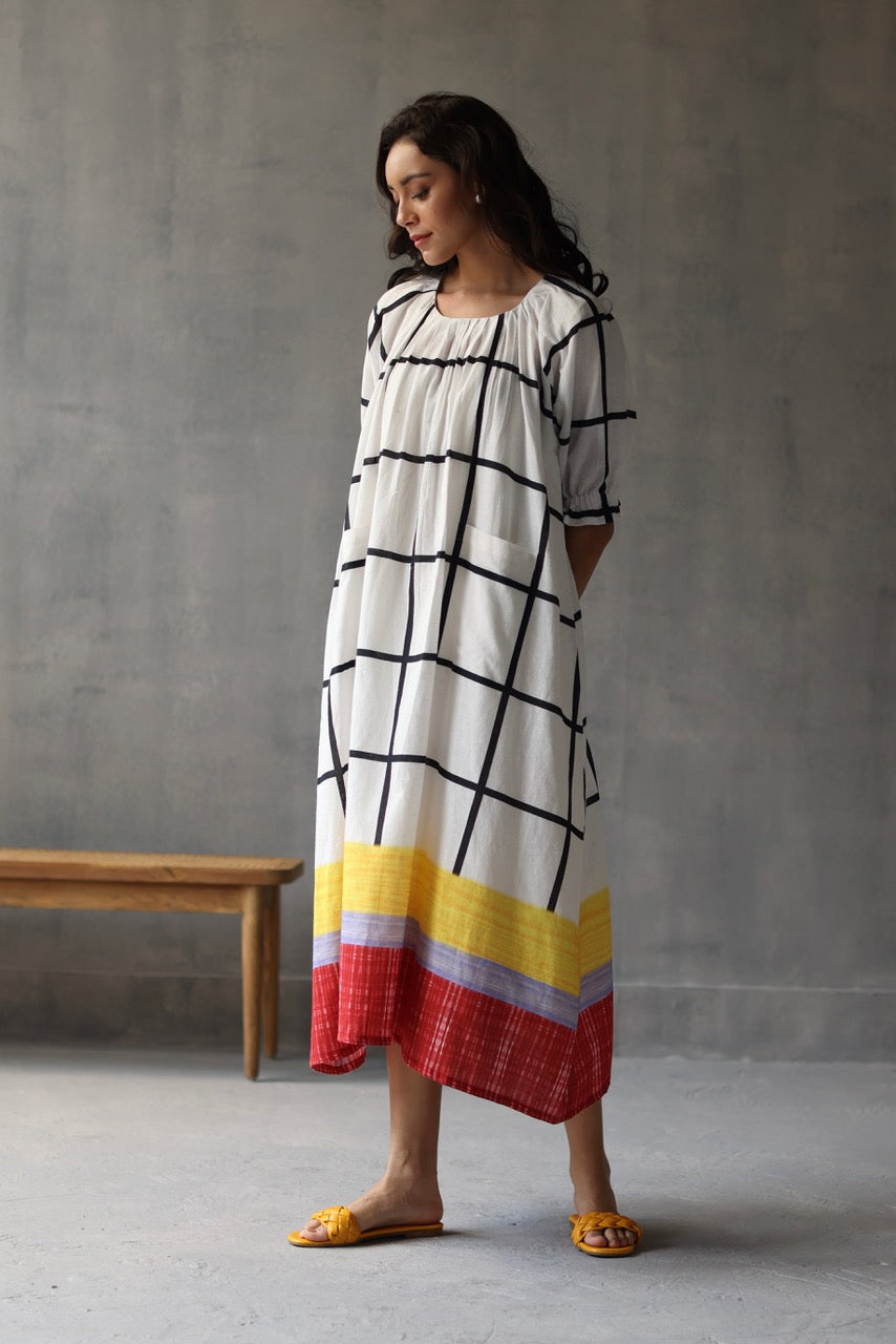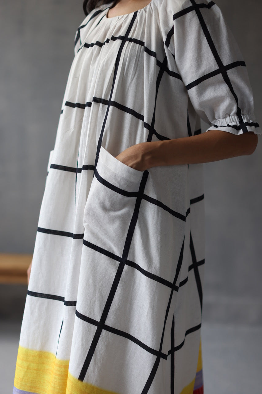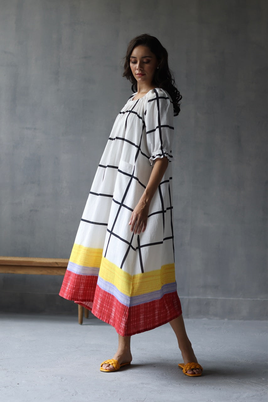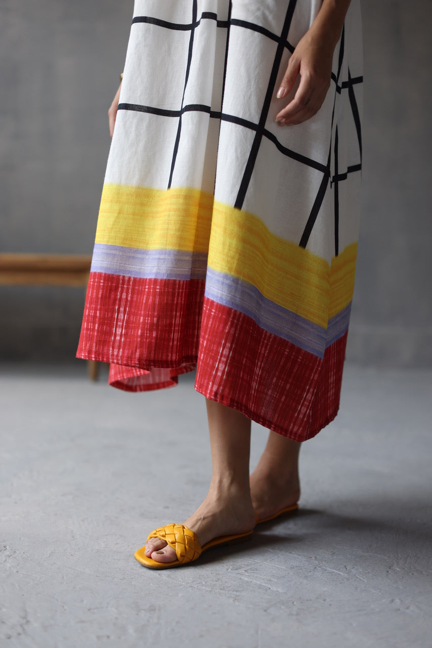 A medley of hand drawn prints, arranged together in a whimsical patch dress with nuances of the bright and sober to elevate a day to night ootd.