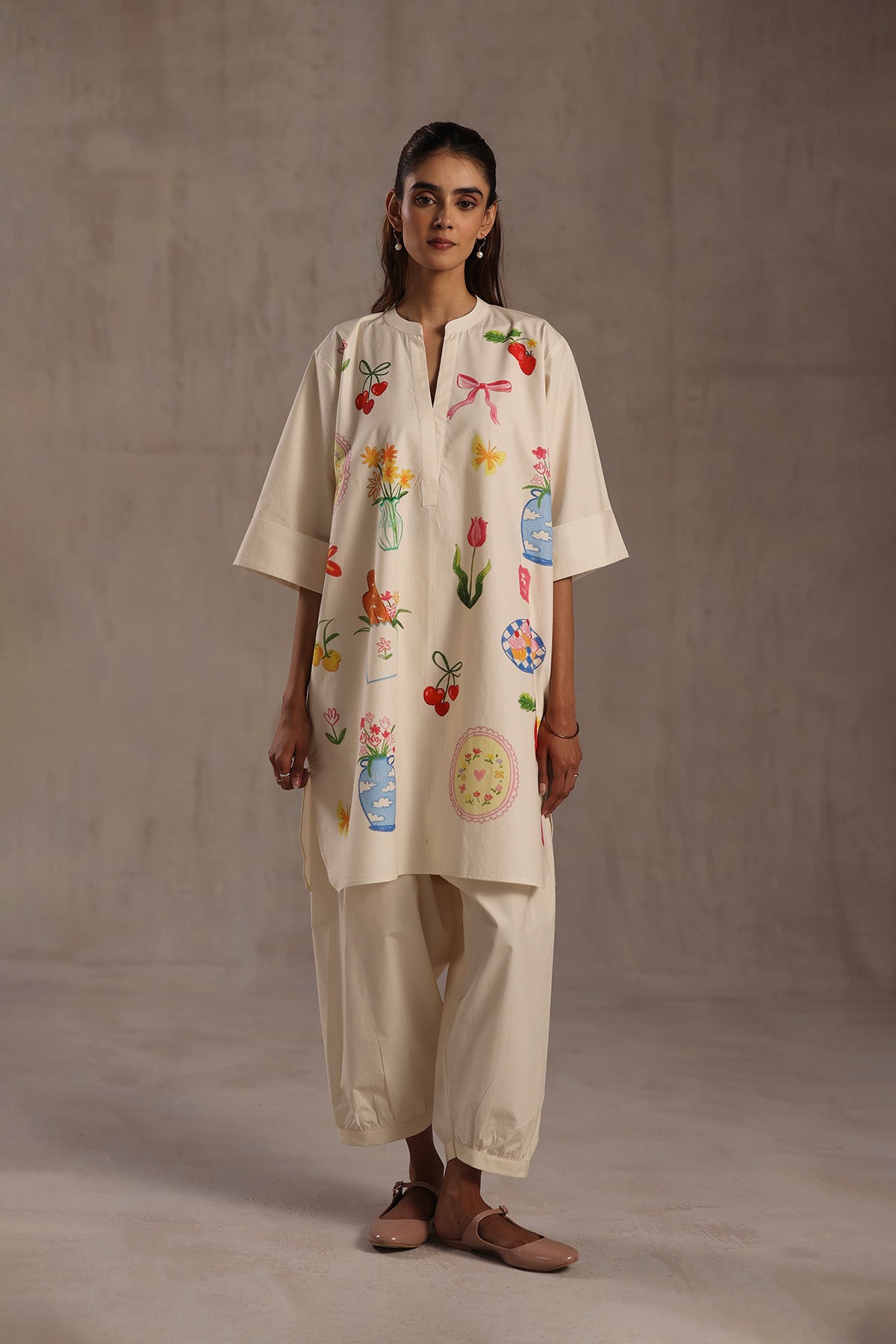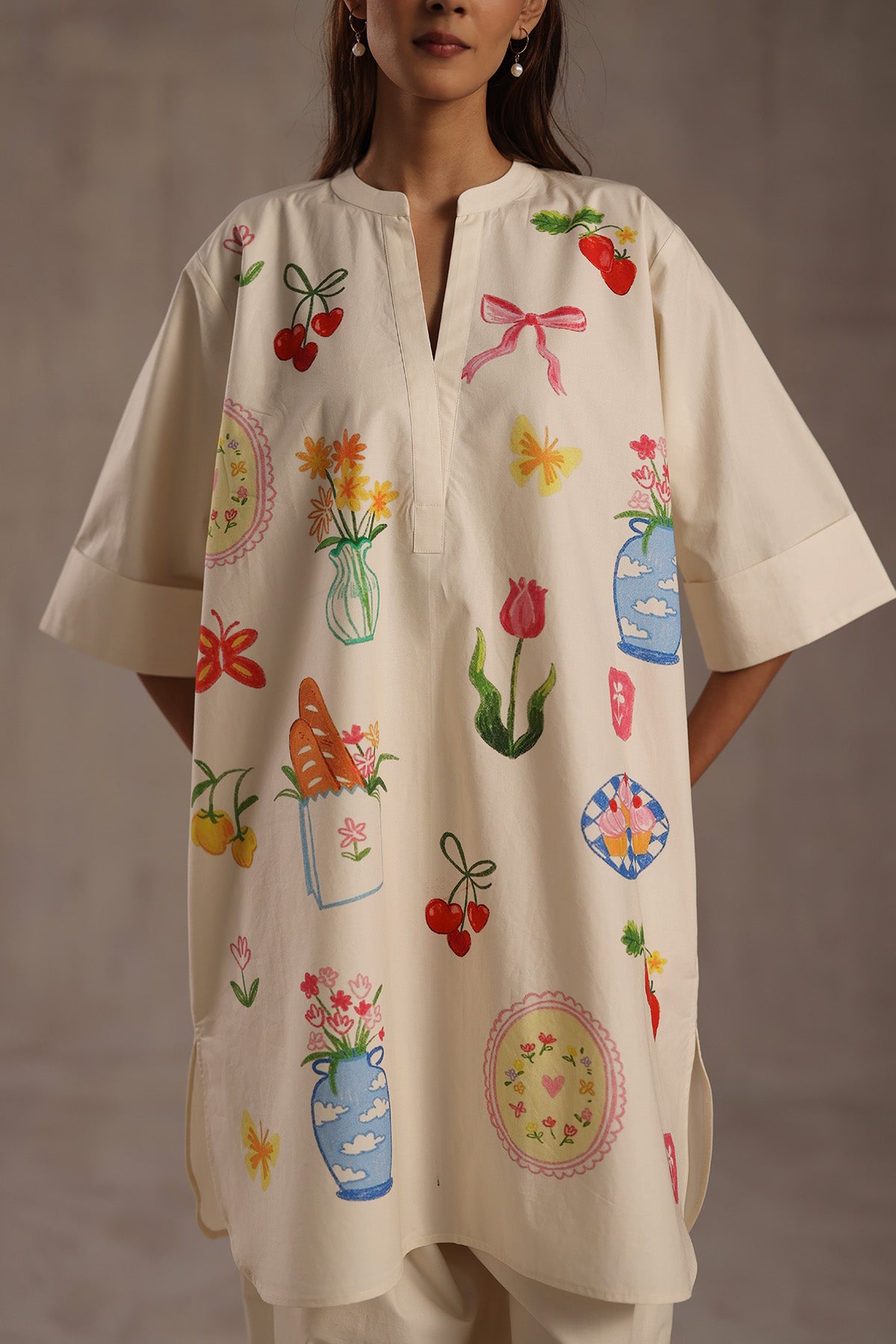 Rendered in a soft ivory hue, this tunic set is brought to life with playful, hand-drawn inspired motifs in vibrant pops of color. The relaxed silhouette features a clean neckline and wide sleeves for an easy, contemporary feel.