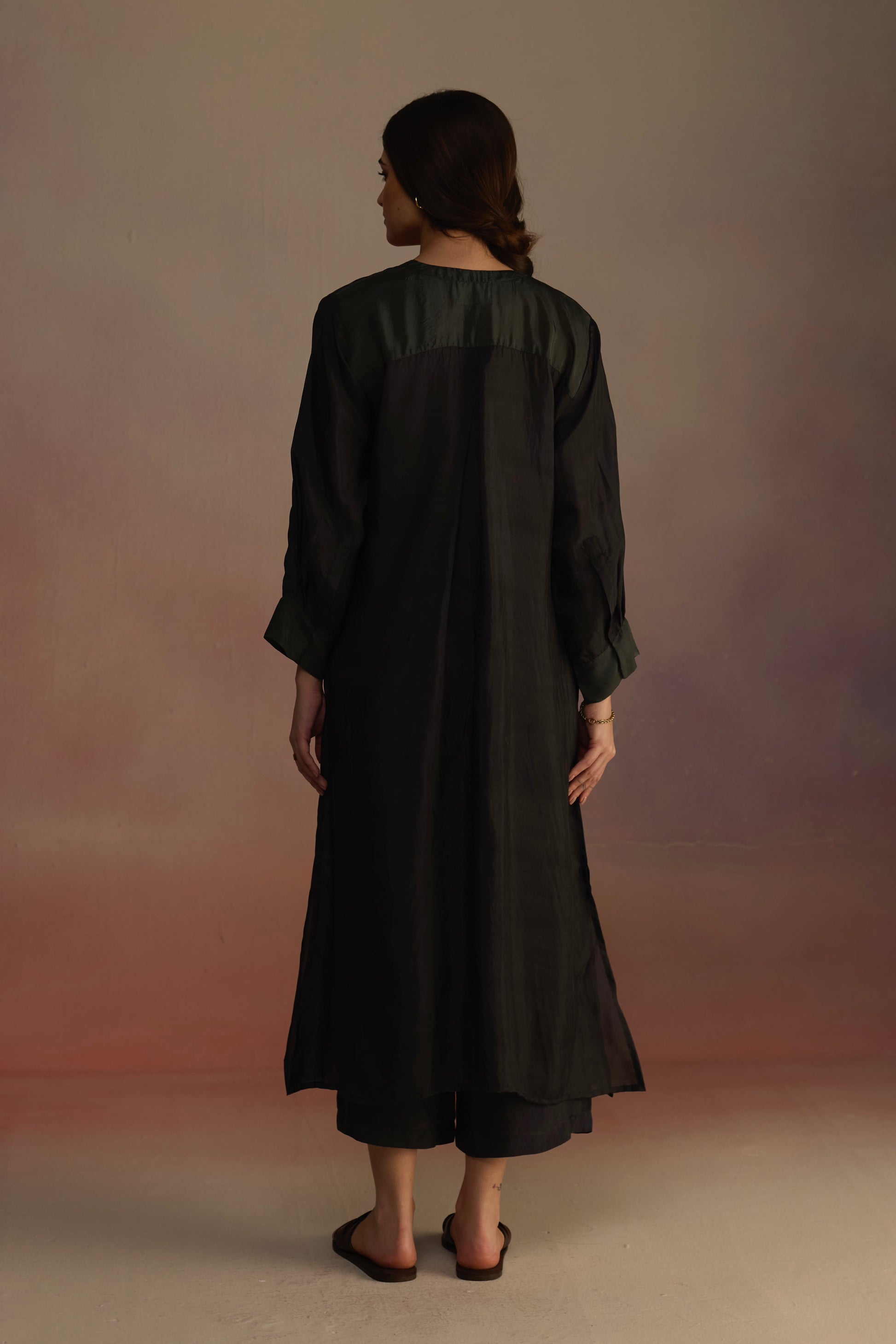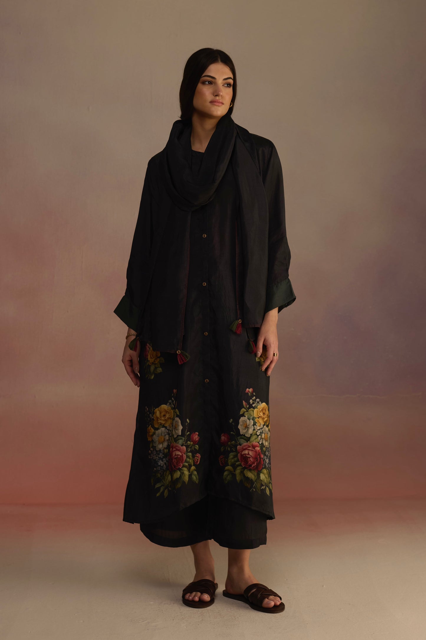 An open panel kurta set with a cascading floral print kurta featuring signature roza buttons and color-blocked cuffs. The set comes with a pair of wide legged pants.