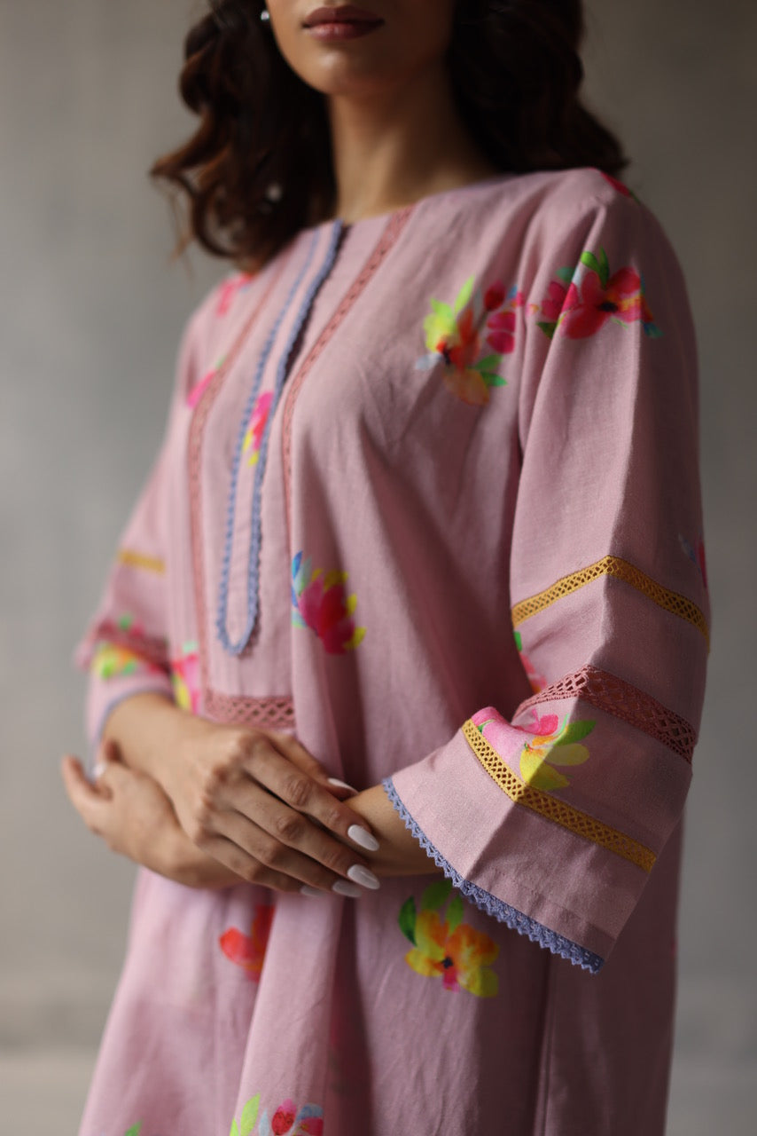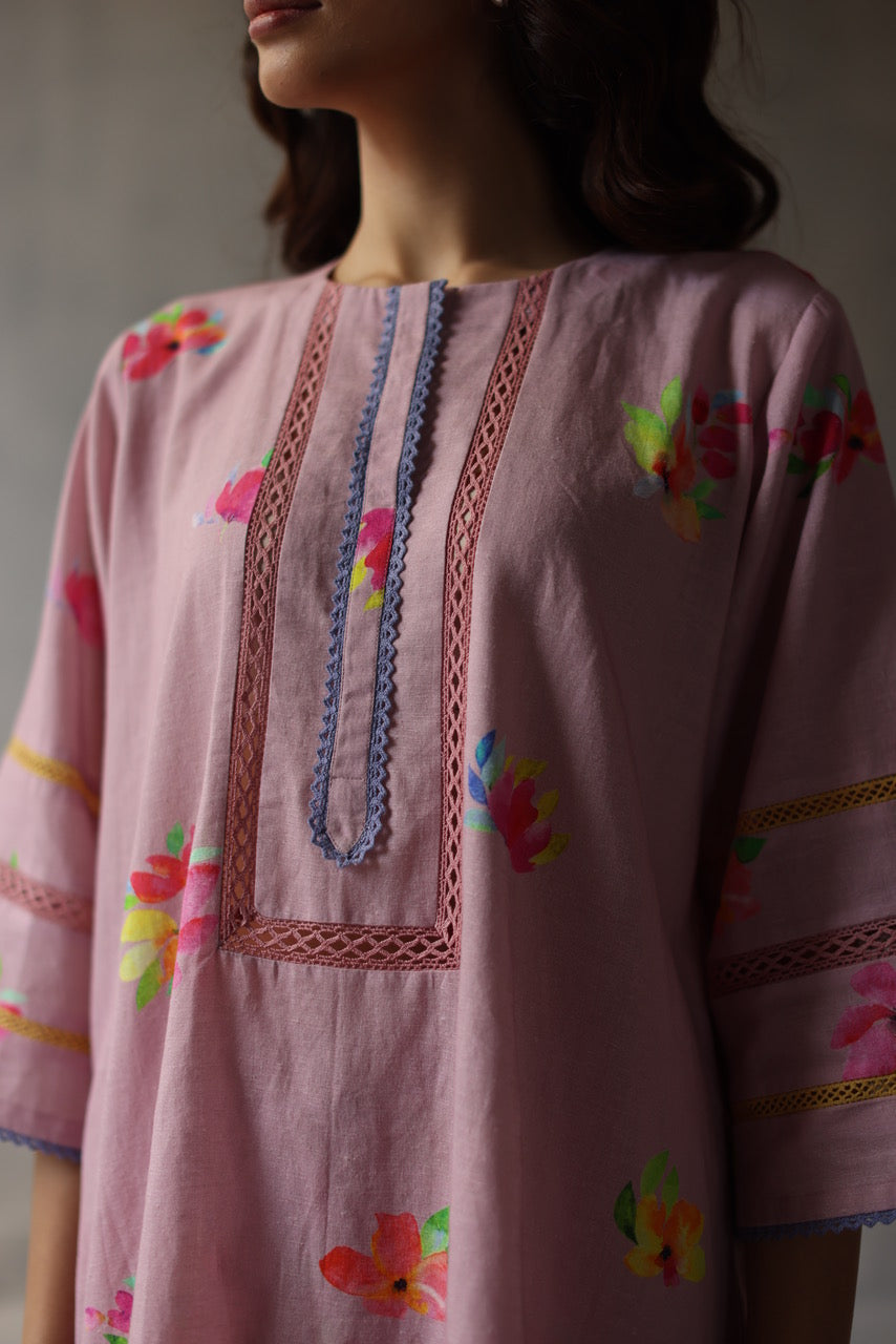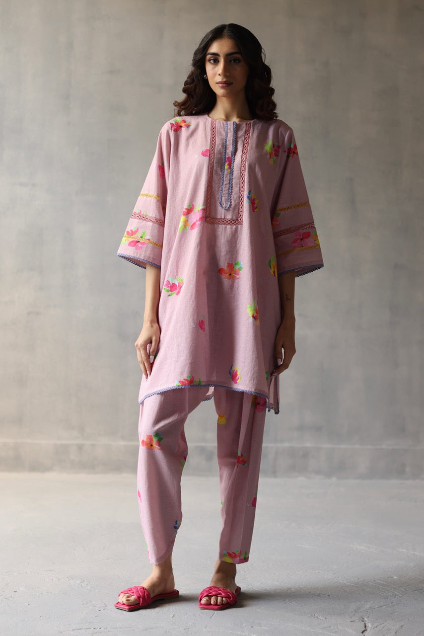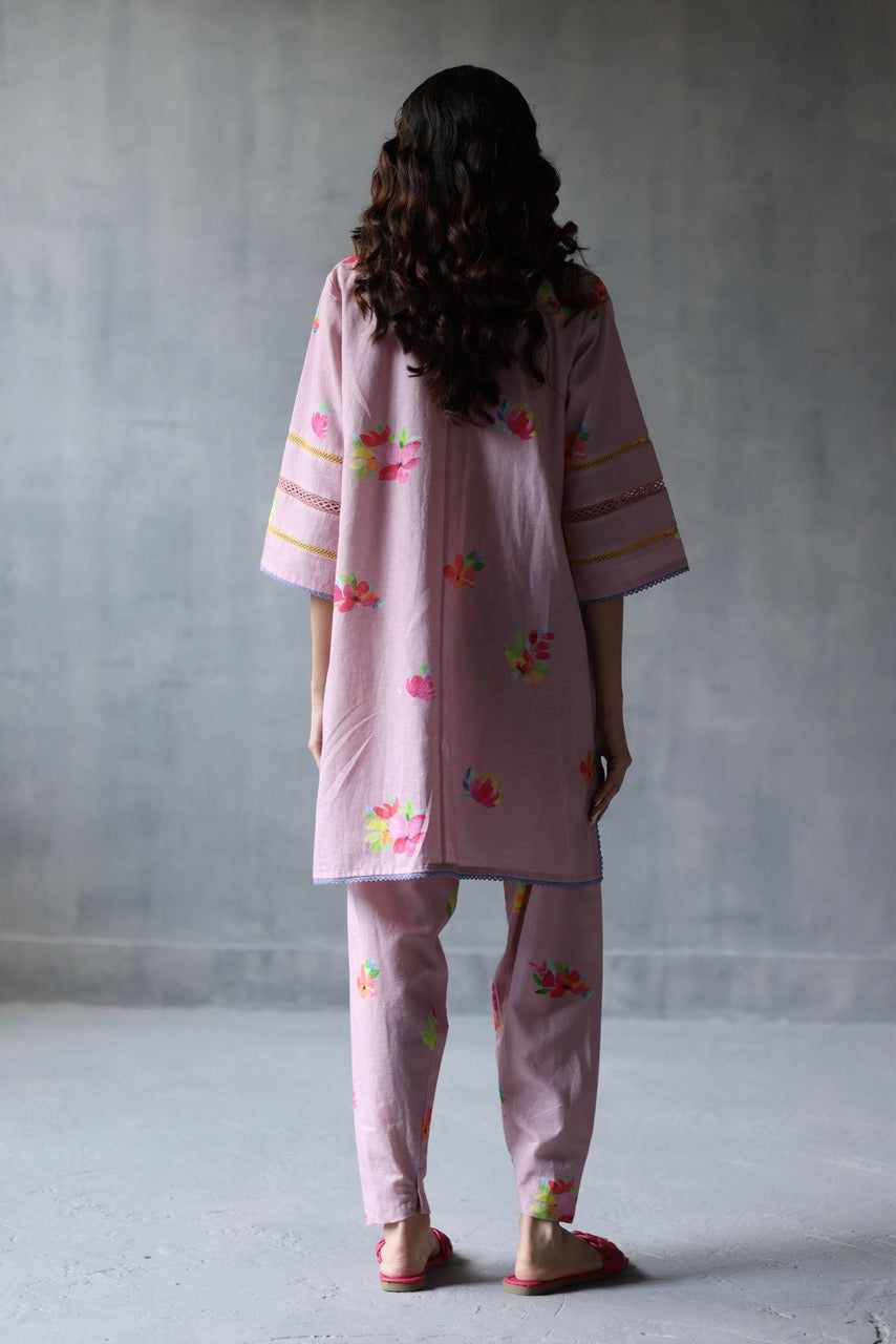 The heather kurta set comes in a set of a short linen kurta with lace trimmings and a pair of tapered pants. Both the kurta and the pants have dainty watercolour flowers accentuated with hand painted brush strokes.