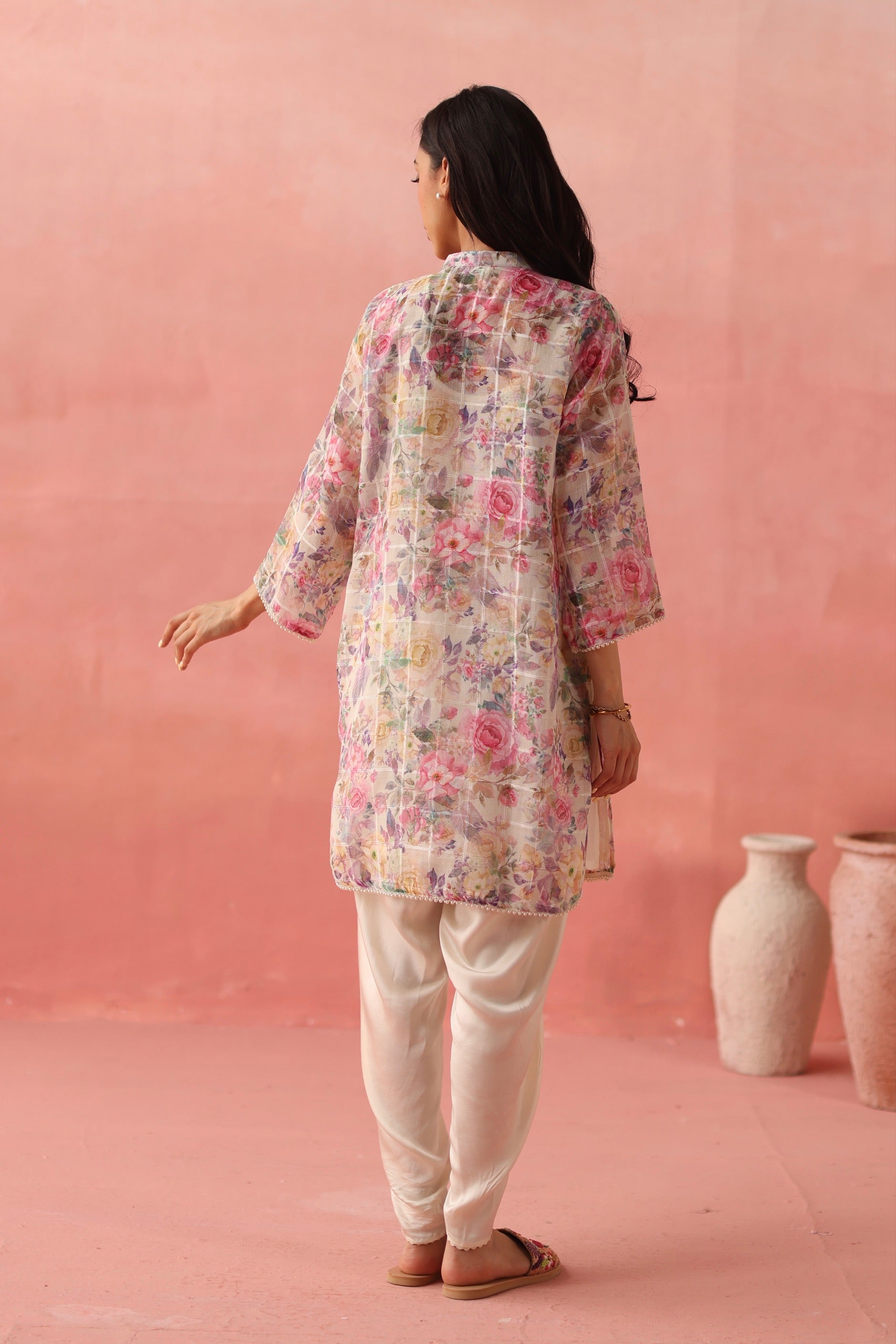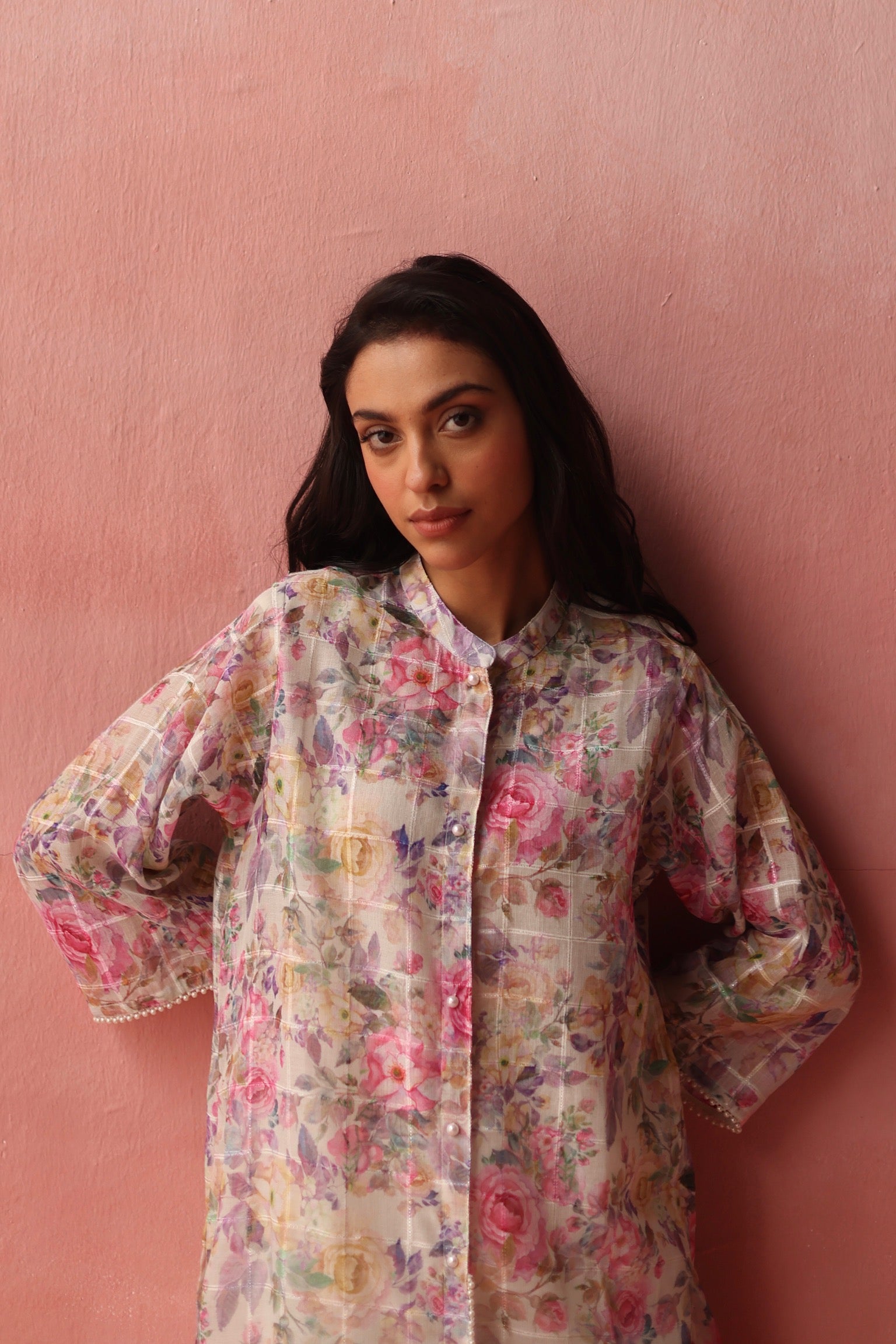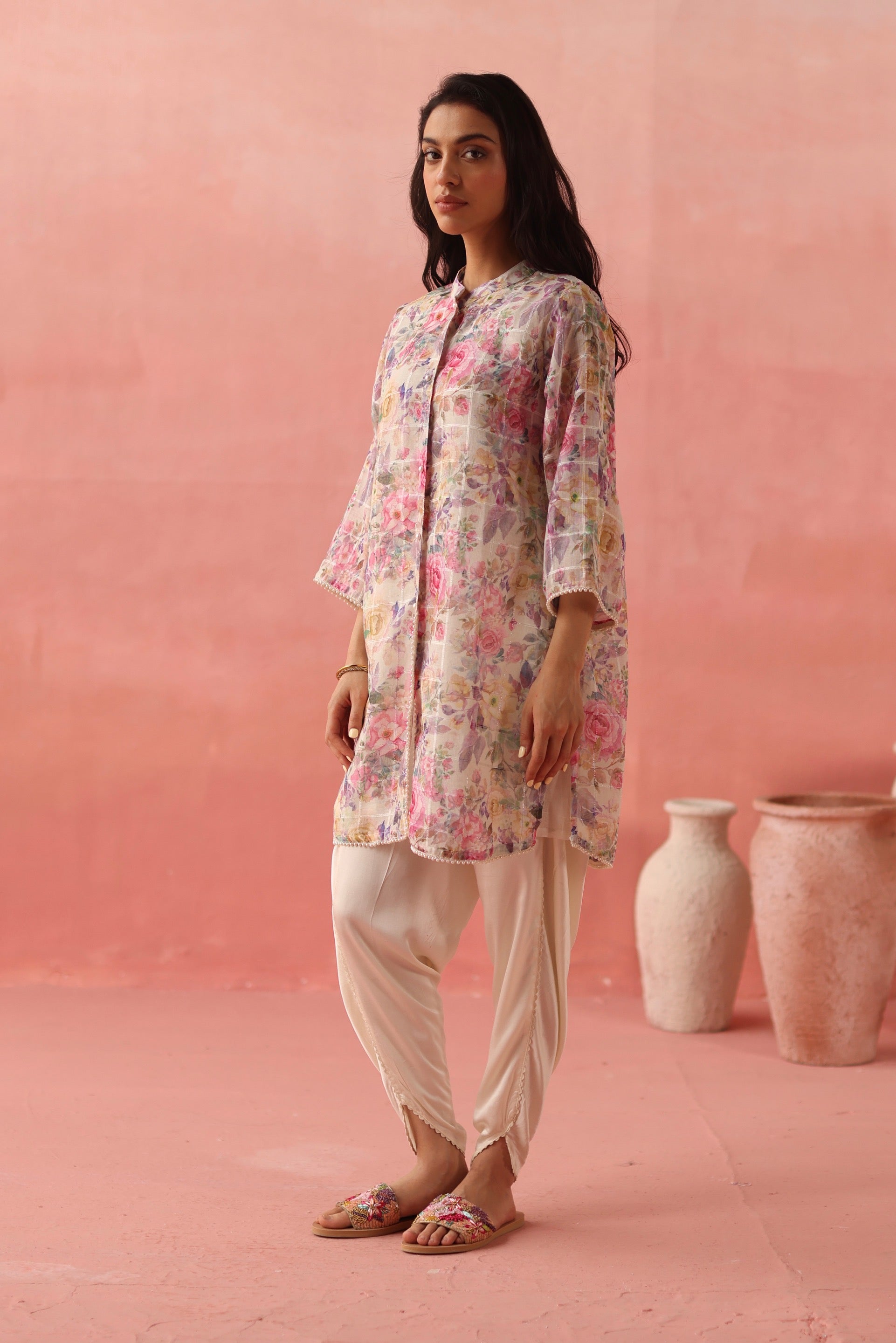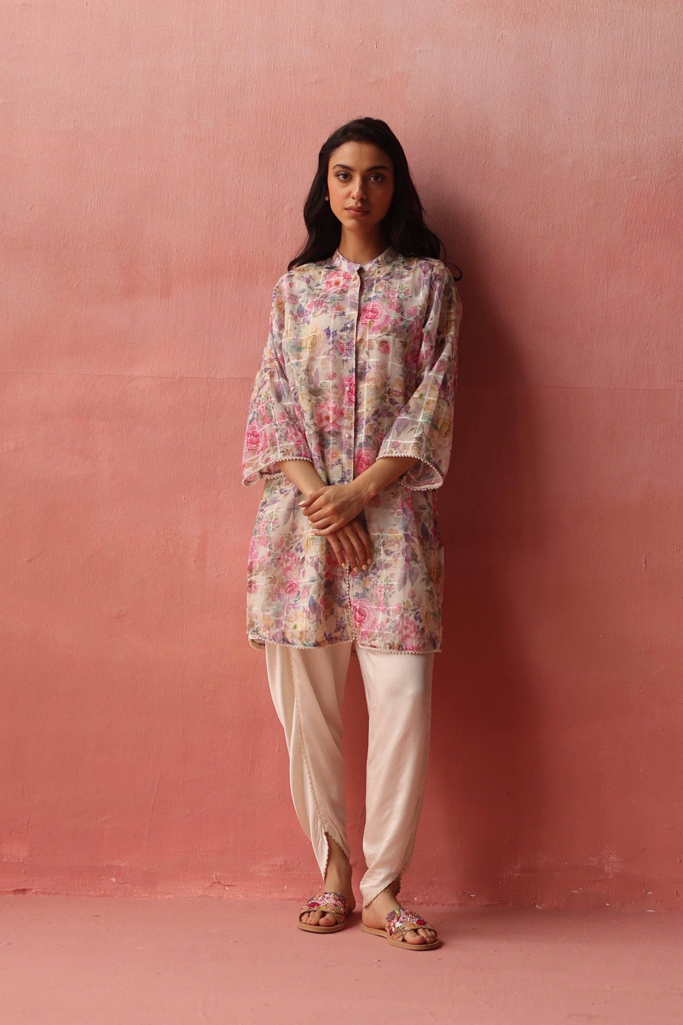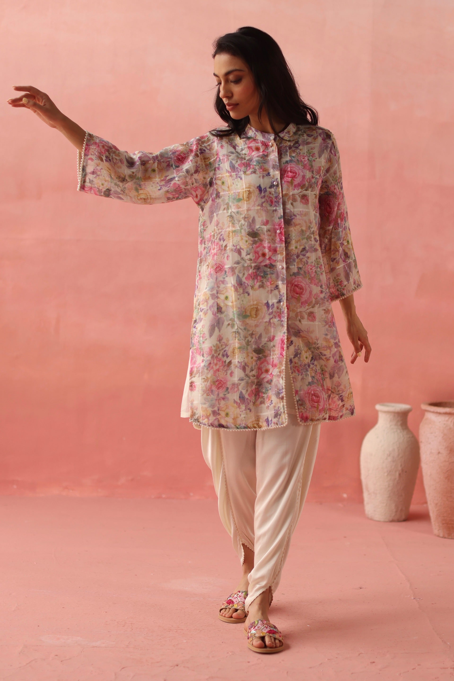 The chã©rie co-ord set is made with the finest and most lightweight linen fabric. The co-ord set includes a short-length a-line kurta and laced dhoti pants. The kurta has floral prints with flared sleeves, is adorned with pearl buttons, and has pearl lace outlining on the front, making it a perfect festive pick-me-up.