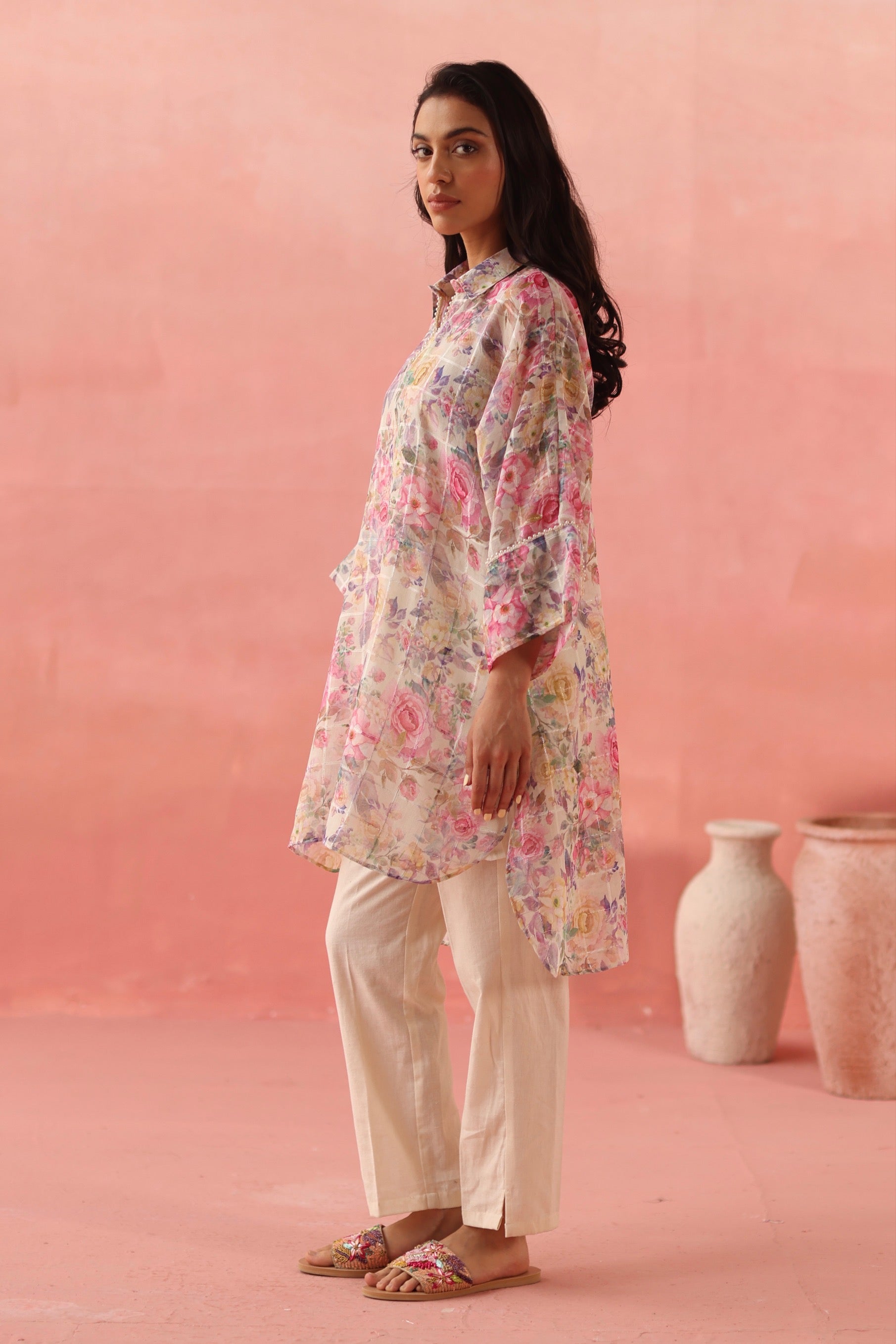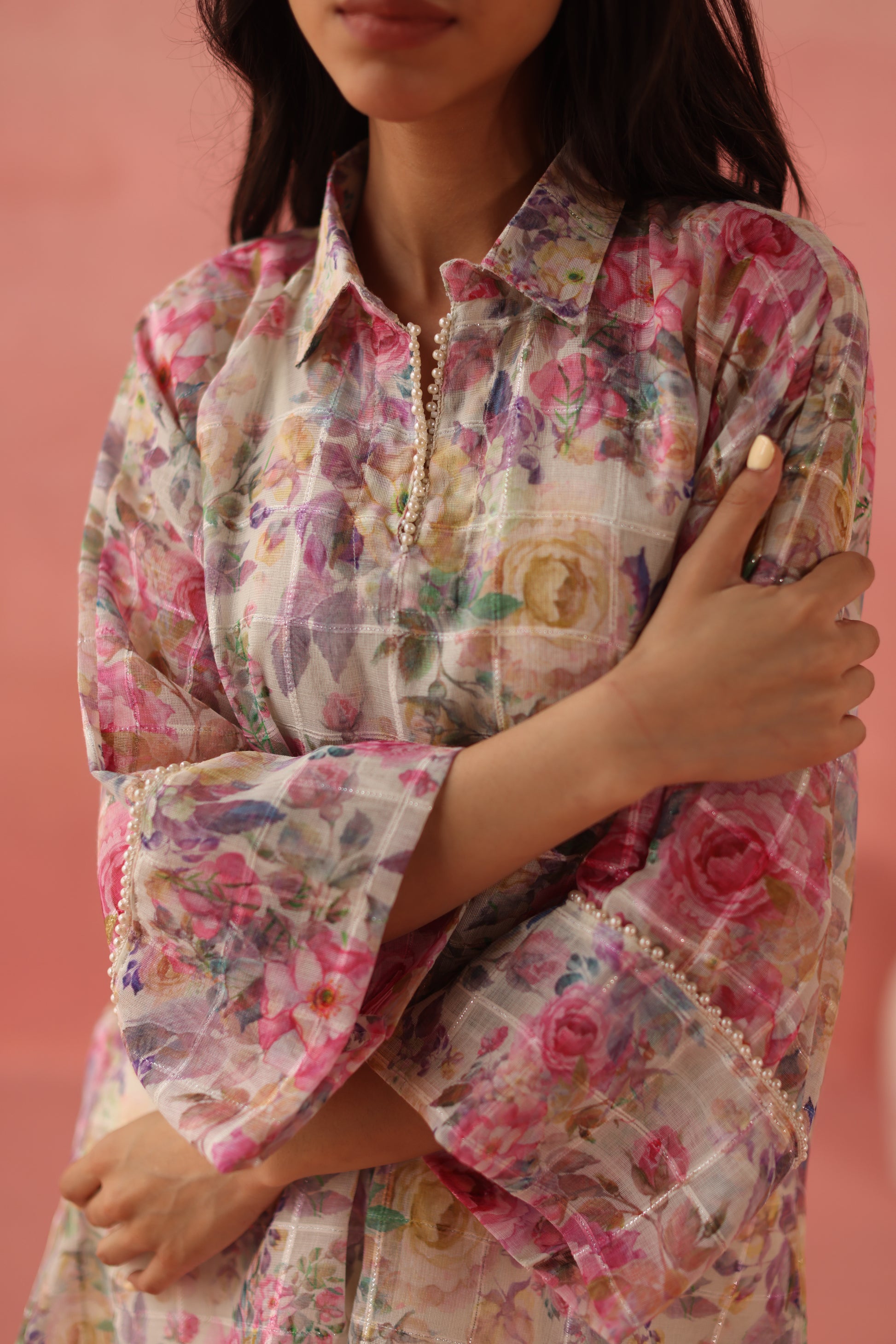 The hera kaftan comes in a beautifully designed print. It has a 3-quarter sleeve with an additional slip. It has a collared v-neckline with pearl lace work on the collar and sleeves. Its flowy texture and beautiful pearls on the floral prints are perfect for any type of occasions.