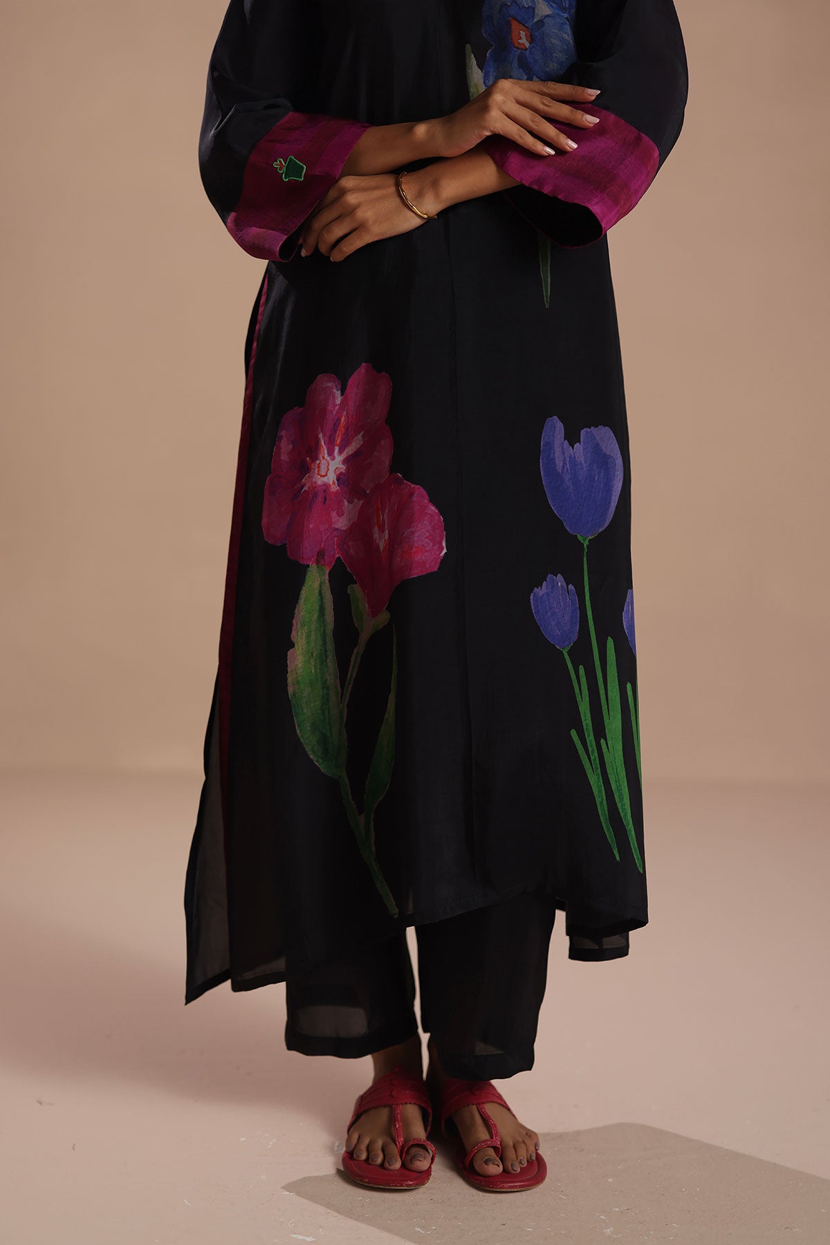 A black kurta set with a V-neck and contrasting Magenta cuffs finished with bold handsketched watercolor floral motifs. Paired with solid black straight fit pants, it’s a perfect mix of timeless black and a touch of color.