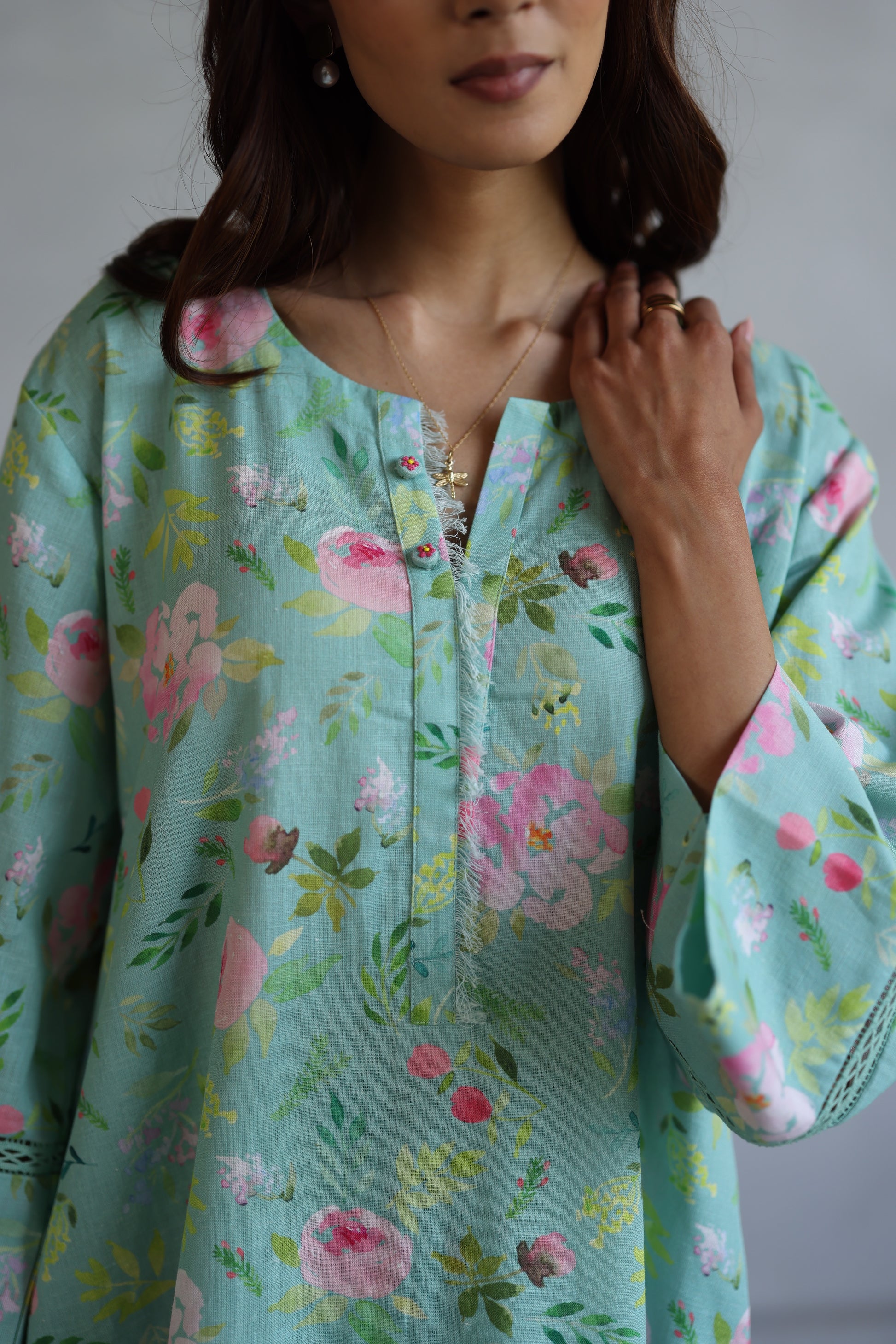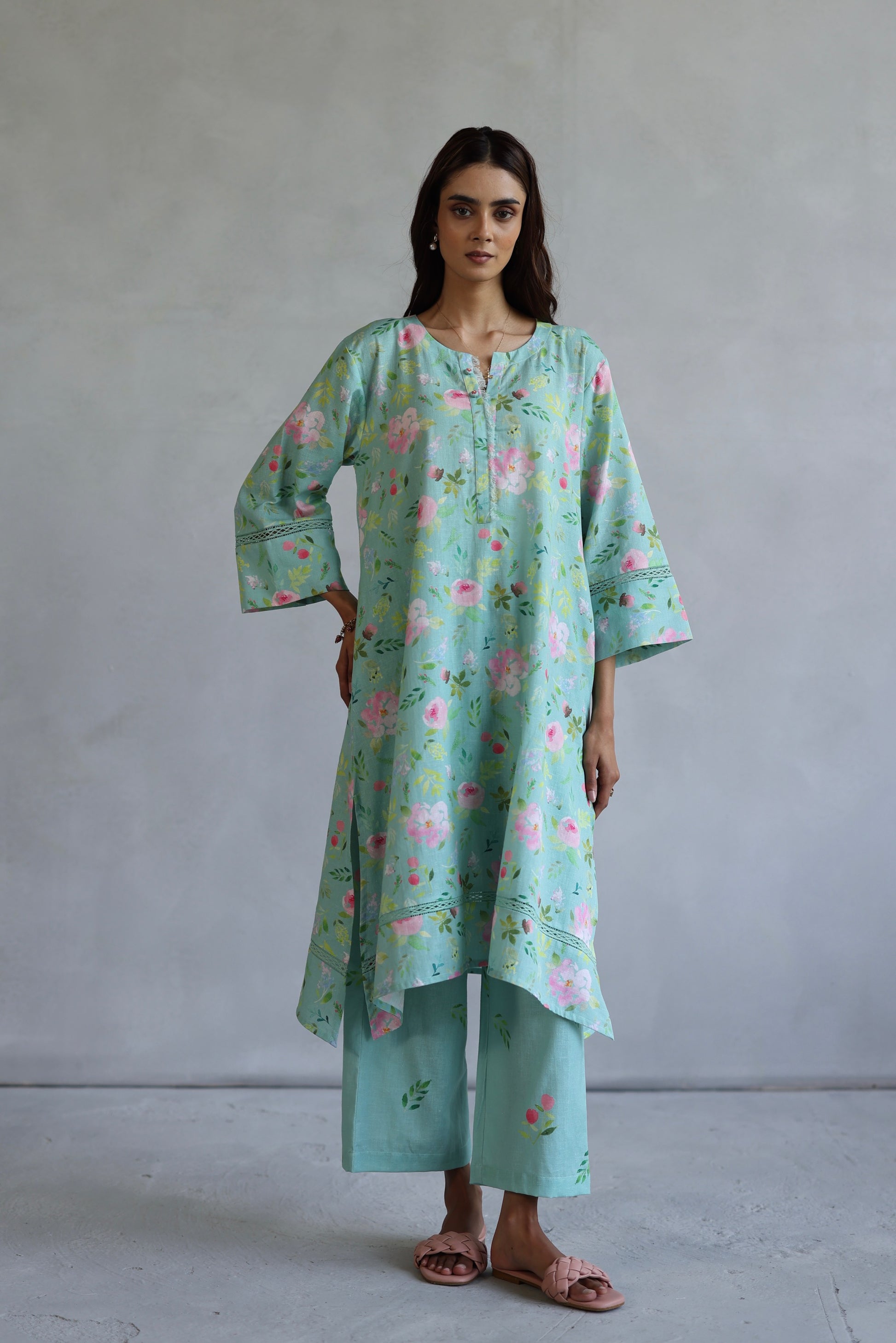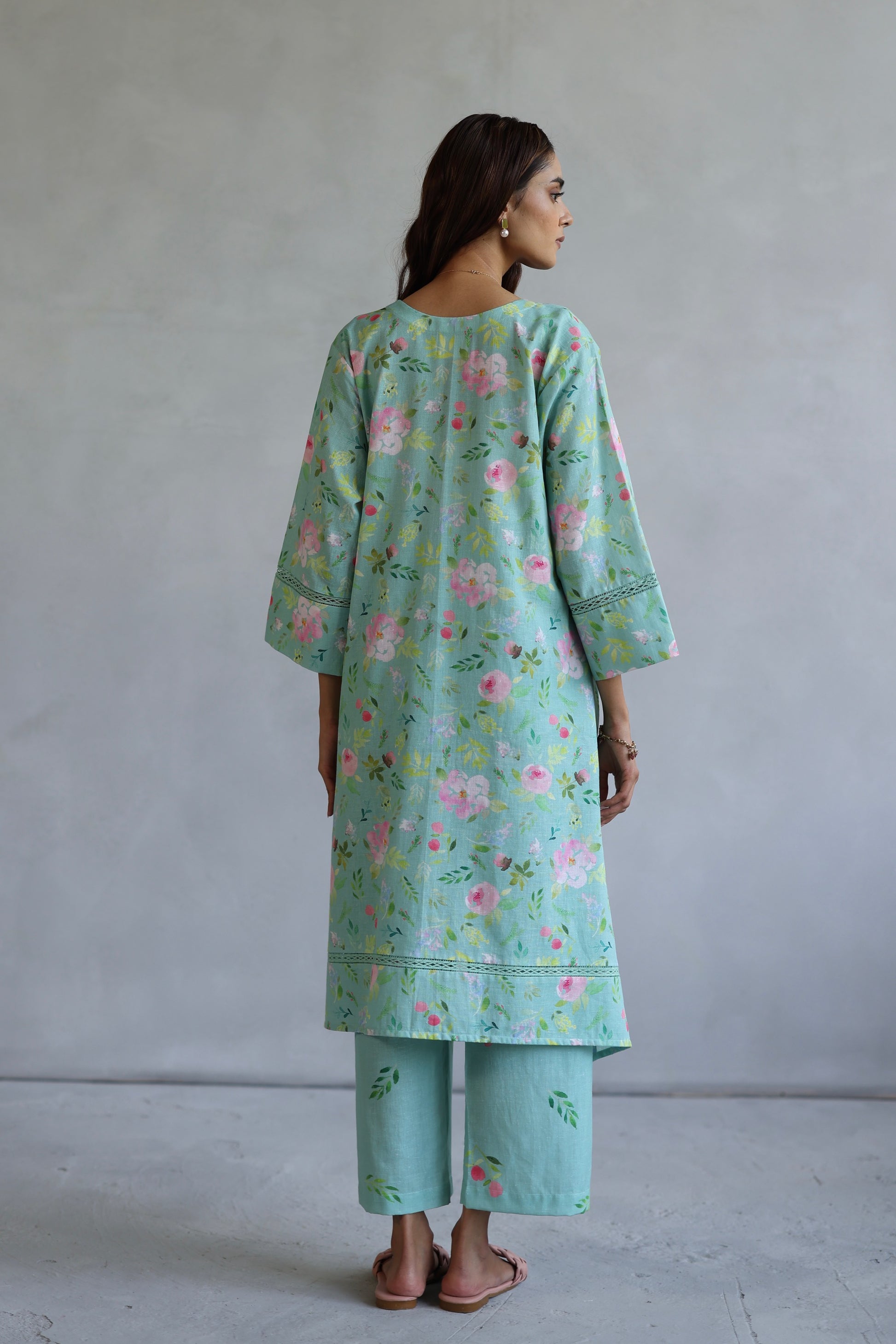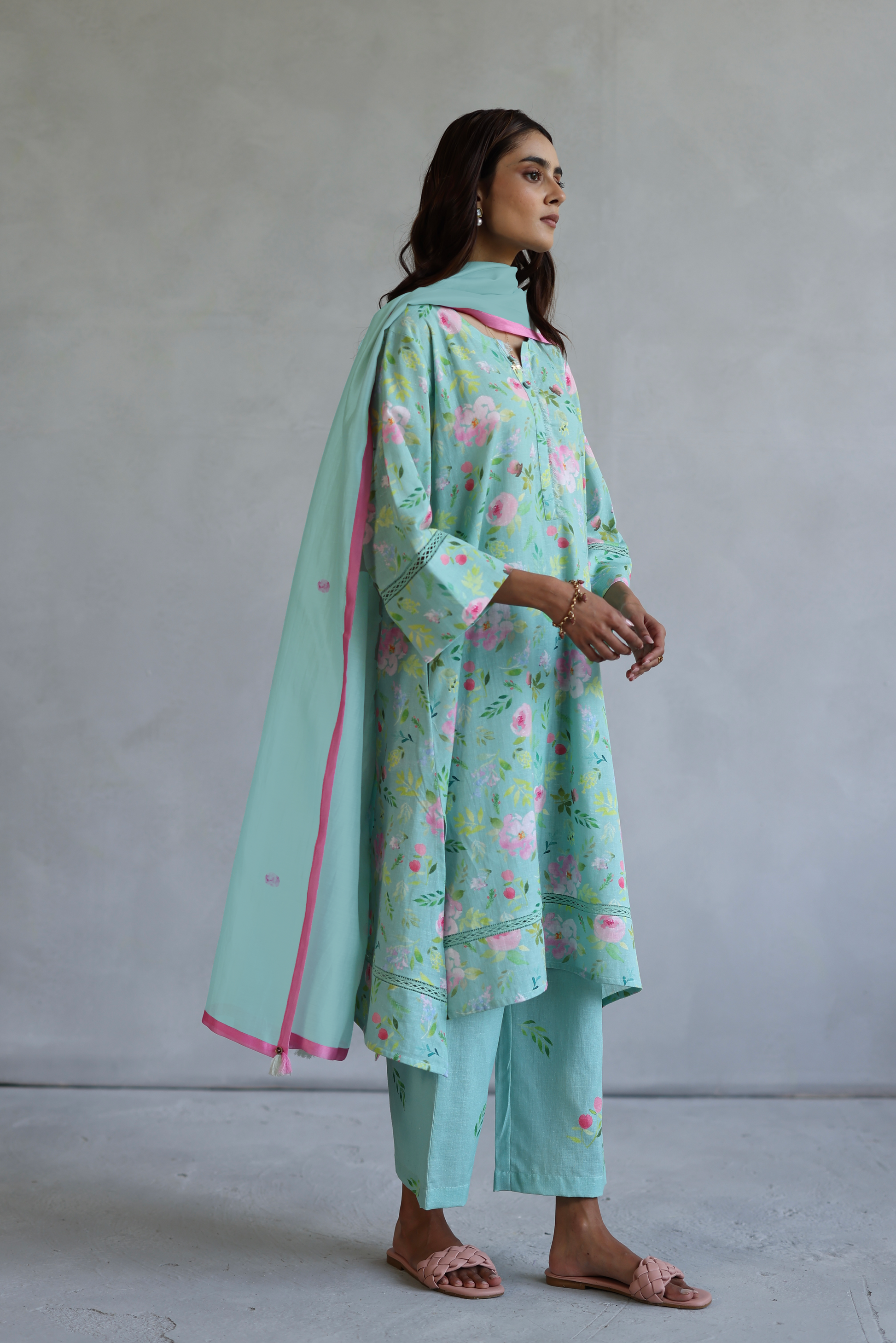 In a soft aqua hue, the hyacinth kurta set is adorned with delicate hand-painted florals, evoking the charm of a blooming meadow. A fine lace detail graces the sleeves and hem, adding a subtle touch of elegance. Paired with minimally floral-accented straight pants, the kurta set can be paired with the hyacinth stole.