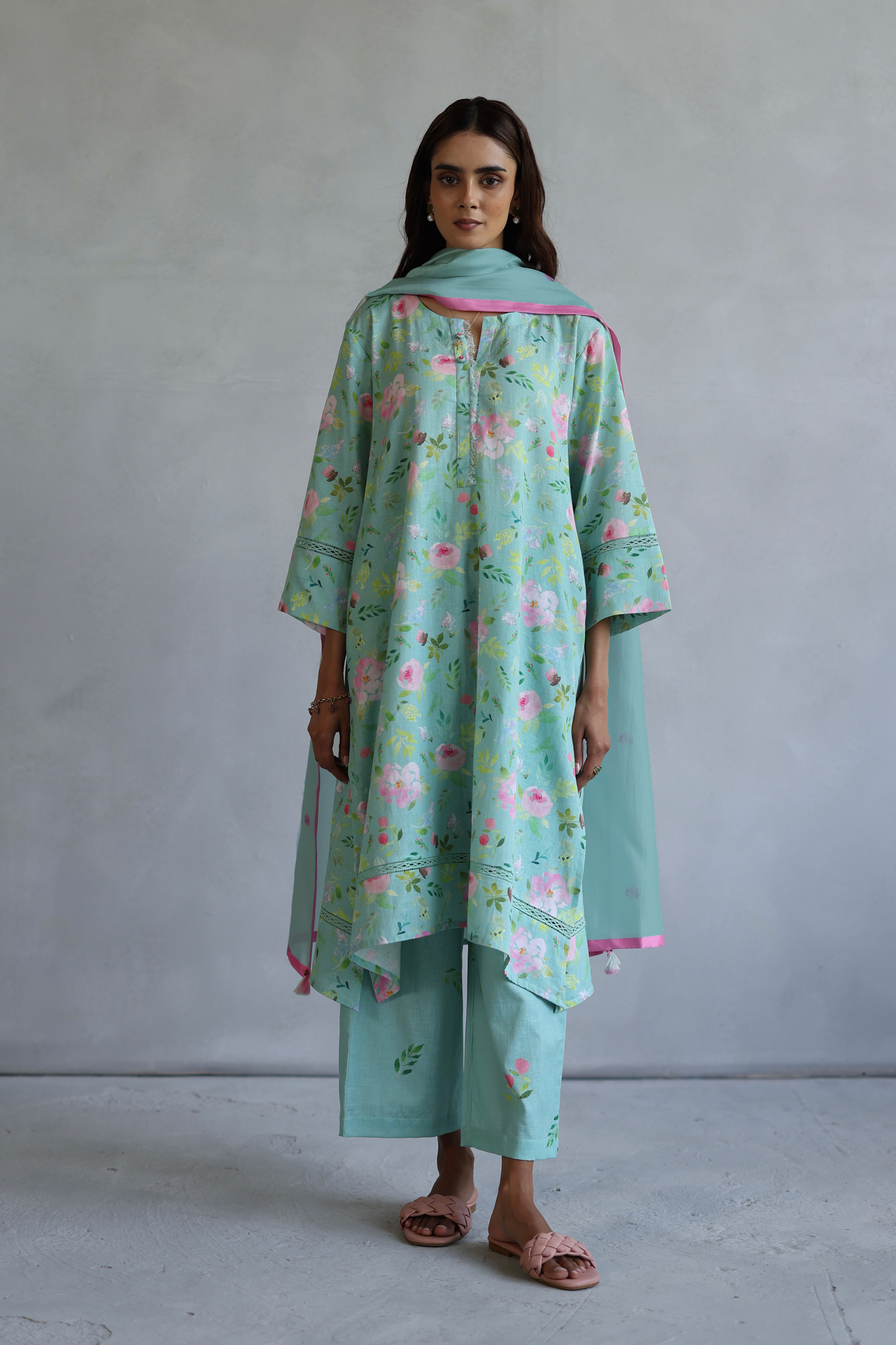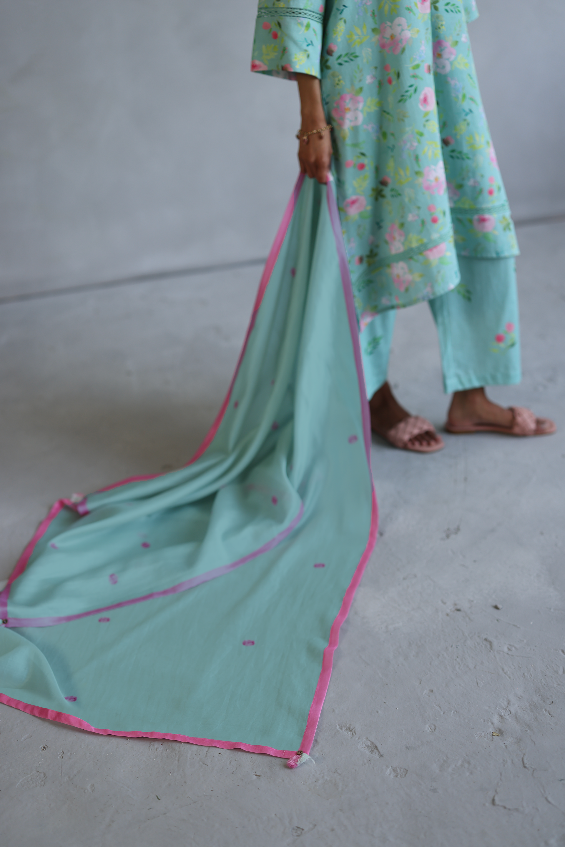 A lightweight chanderi stole with hand sketched flowers and a contrast border to pair with the hyacinth kurta set.
