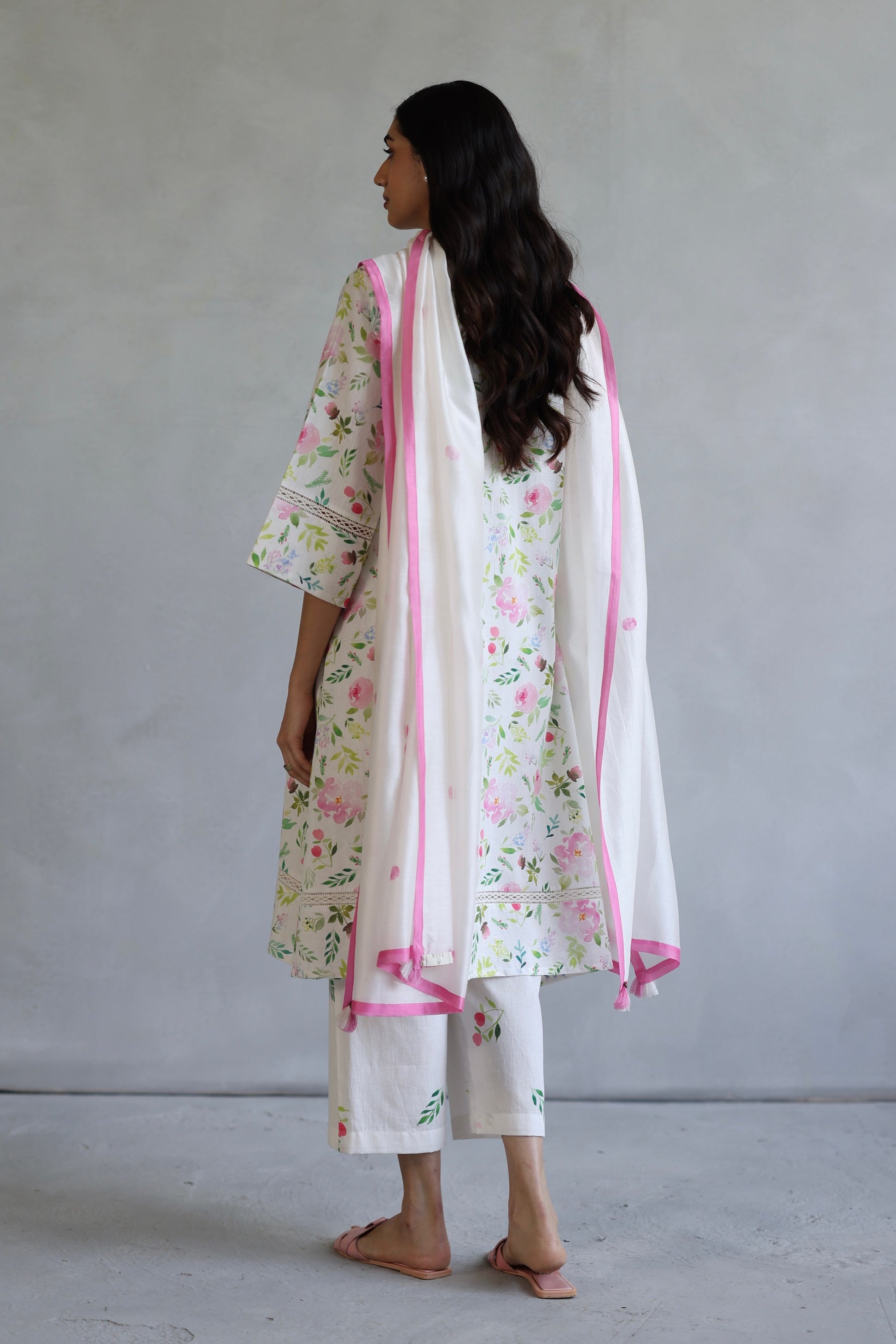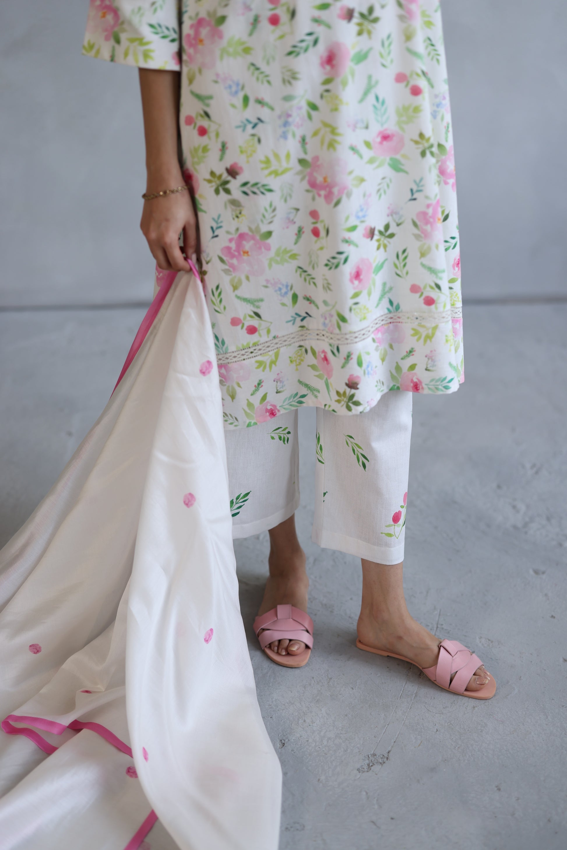 A lightweight chanderi stole with hand sketched flowers and a contrast border to pair with the hyacinth kurta set.