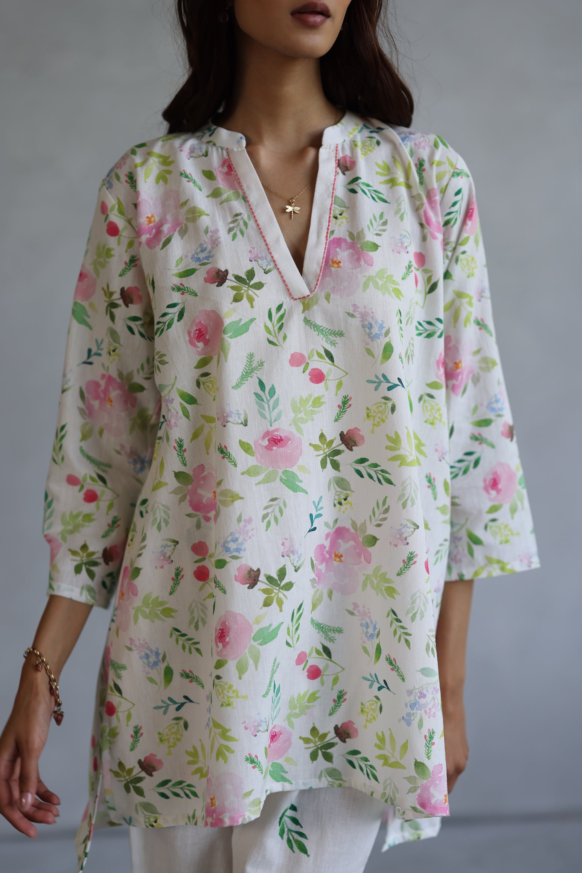 In versatile ivory, this breathable linen tunic set is adorned with delicate floral motifs, and contrast stitches. Paired with straight pants featuring subtle floral accents, this set is a perfect blend of charm and comfort.