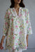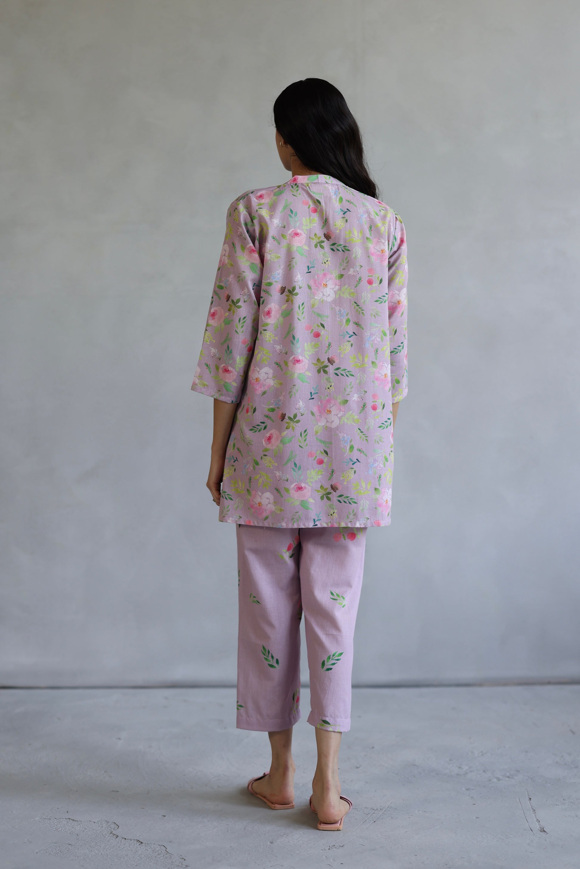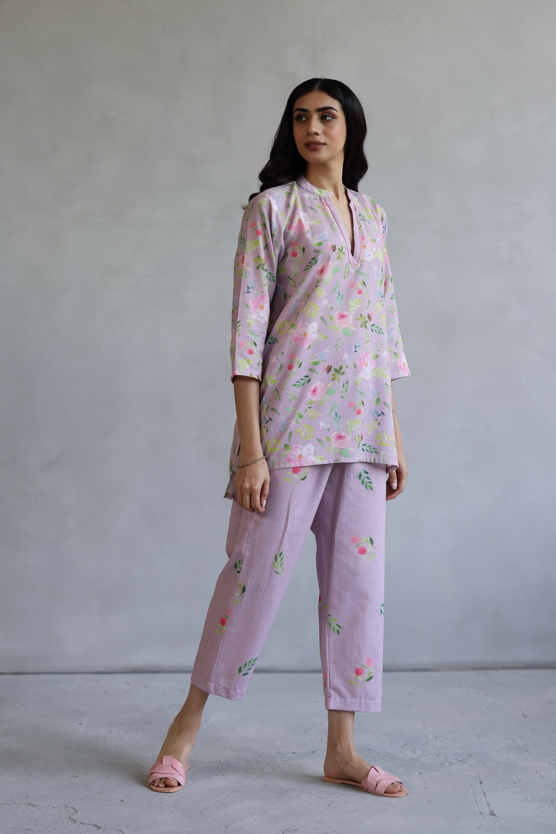 In a soft pink hue, this breathable linen tunic set is adorned with delicate floral motifs, and contrast stitches. Paired with straight pants featuring subtle floral accents, this set is a perfect blend of charm and comfort.