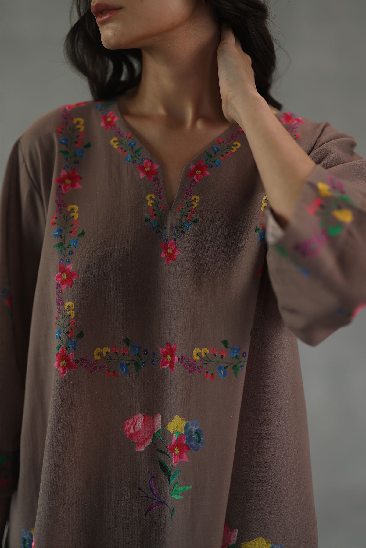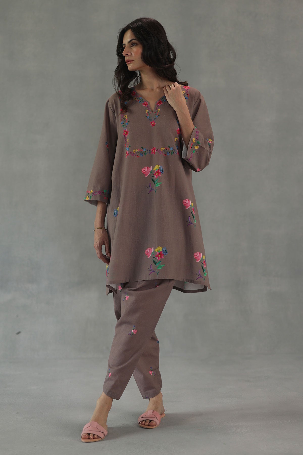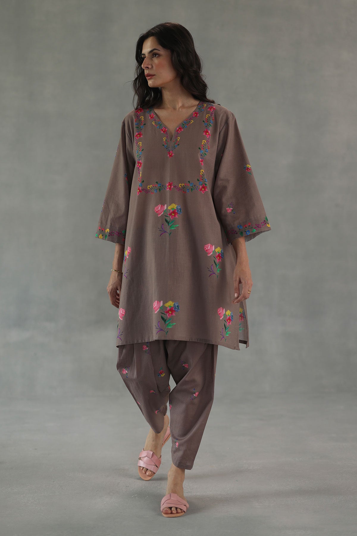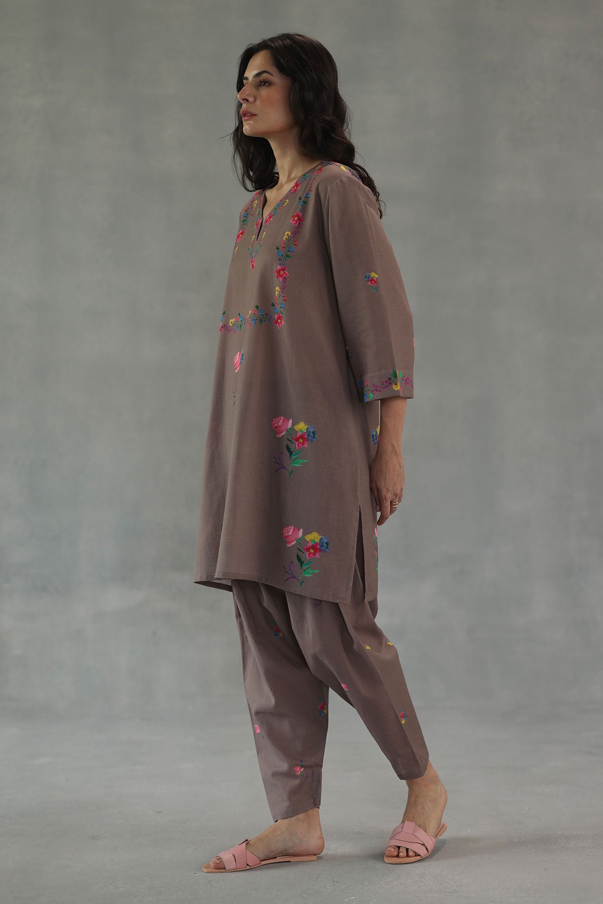 Easy, effortless, and uplifting, the jardin tunic set is crafted in breathable featherlinen and features soft watercolor florals scattered across the yoke and body of the short a-line tunic. Paired with relaxed dhoti-style tapered pants, this set brings together comfort and a touch of whimsy perfect for casual gatherings, garden soirees, or weekend getaways