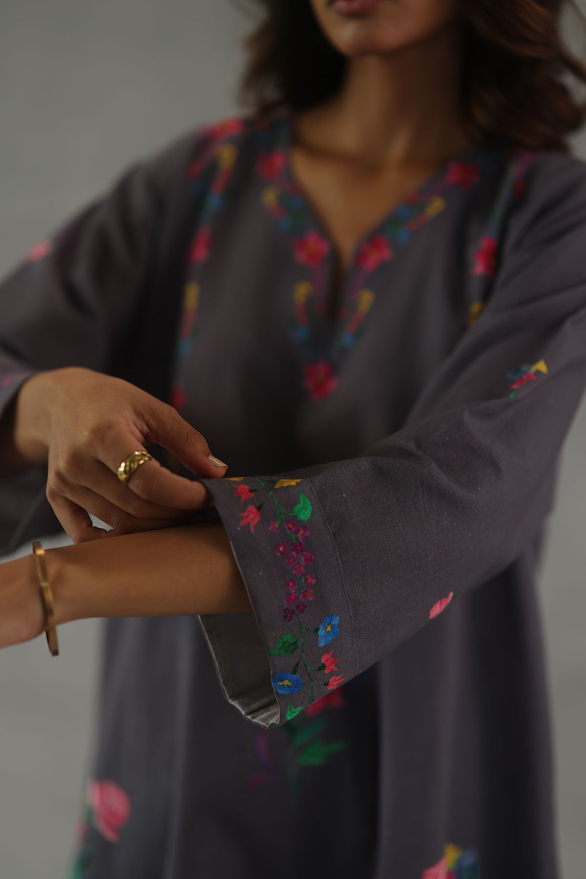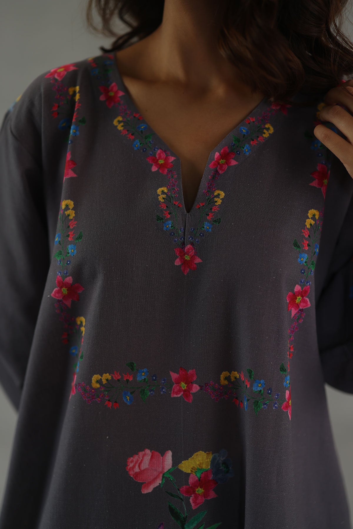 Easy, effortless, and uplifting, the jardin tunic set is crafted in breathable featherlinen and features soft watercolor florals scattered across the yoke and body of the short a-line tunic. Paired with relaxed dhoti-style tapered pants, this set brings together comfort and a touch of whimsy perfect for casual gatherings, garden soirees, or weekend getaways