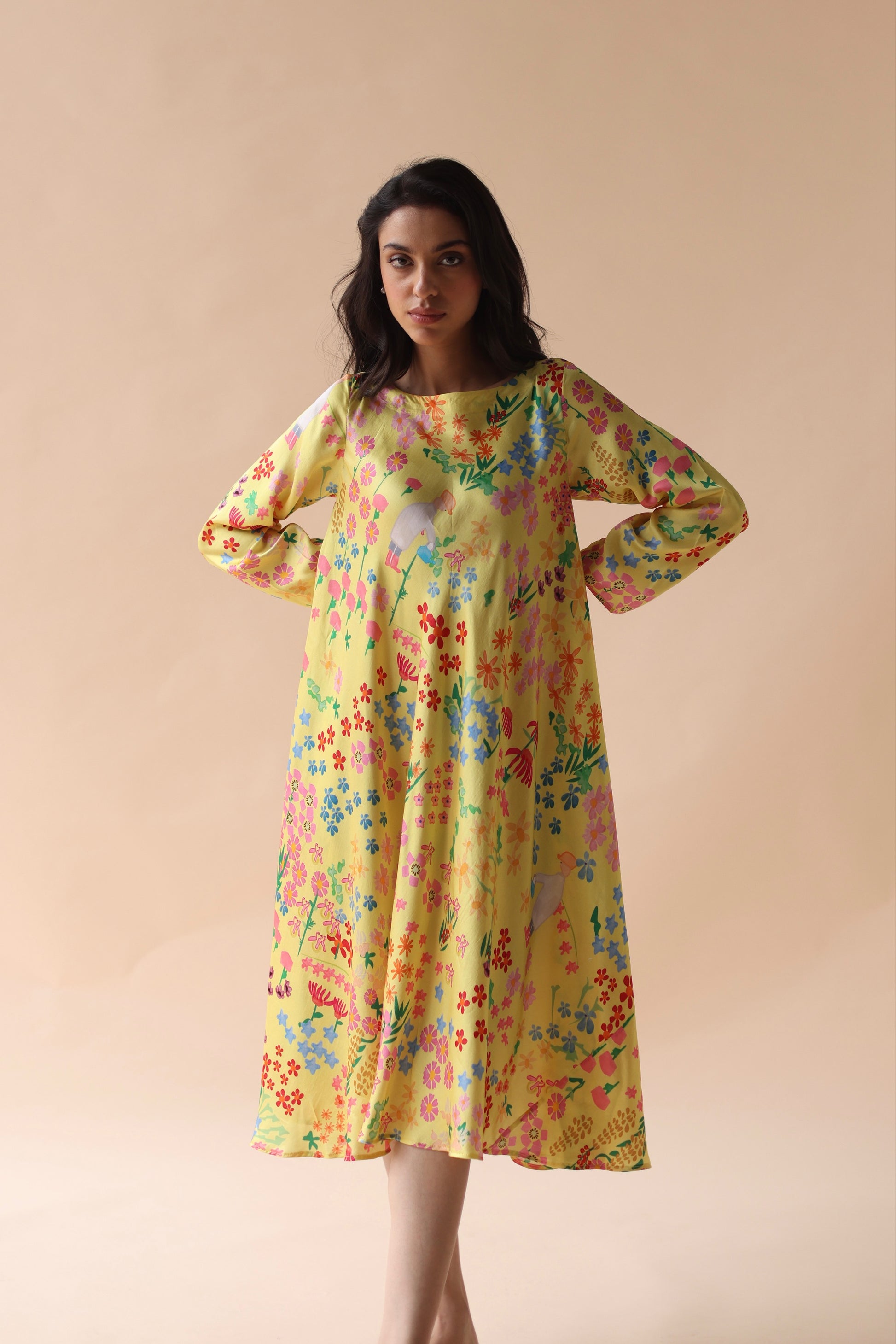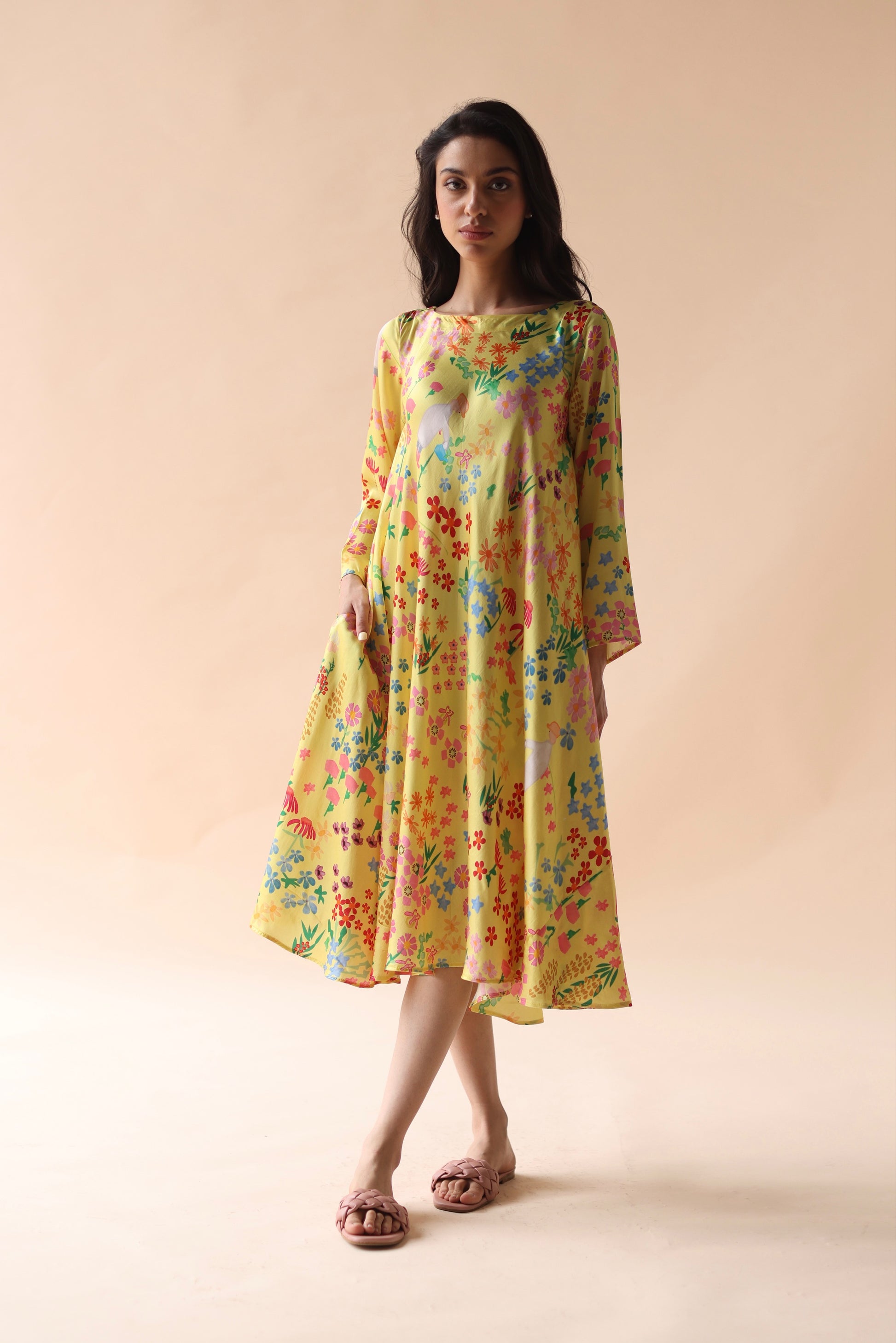 With the detailing of biota print on satin silk fabric, this kefi dress is complemented with pockets on the sides. It has a calf-length, umbrella-shaped freel with a broad, round neckline.