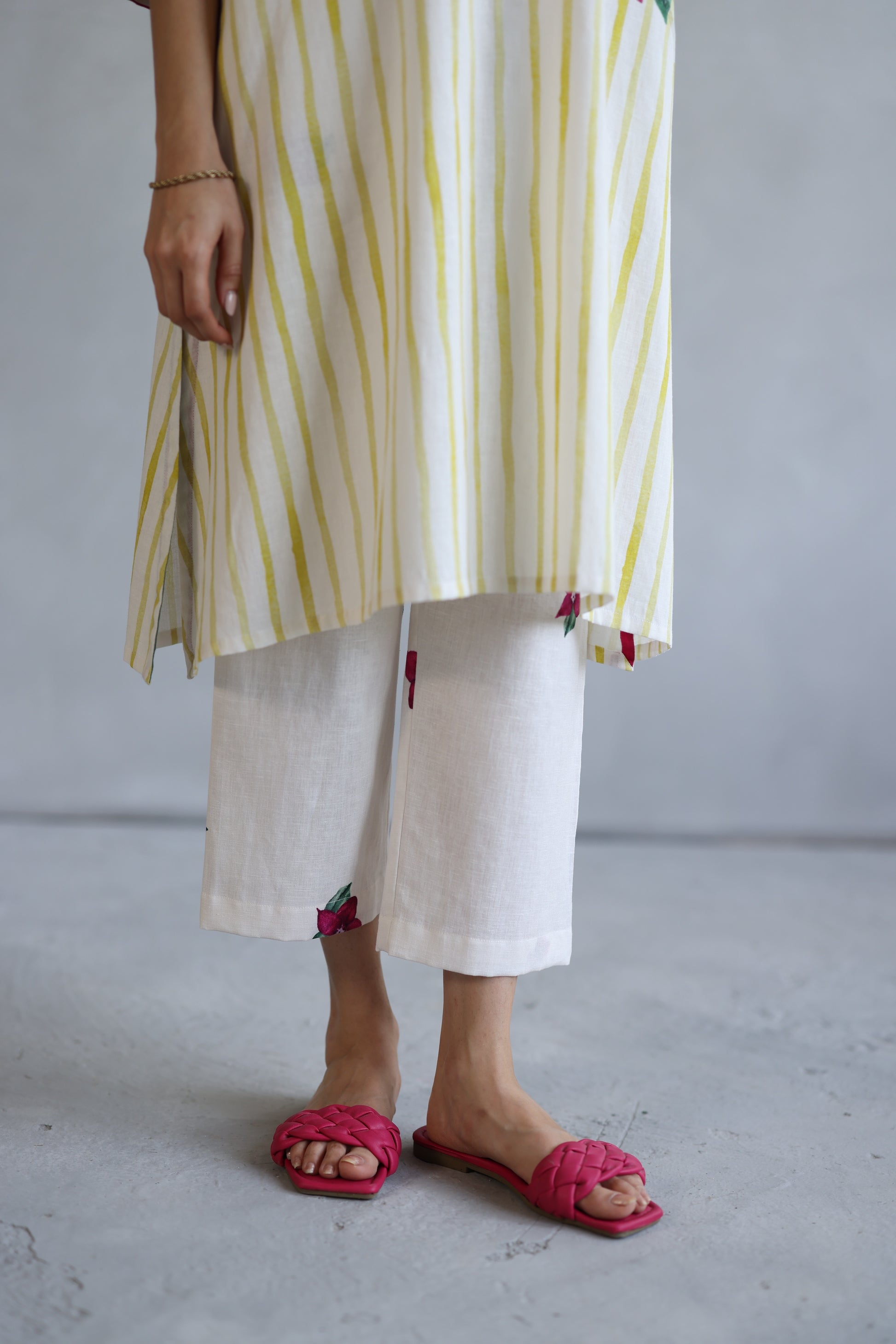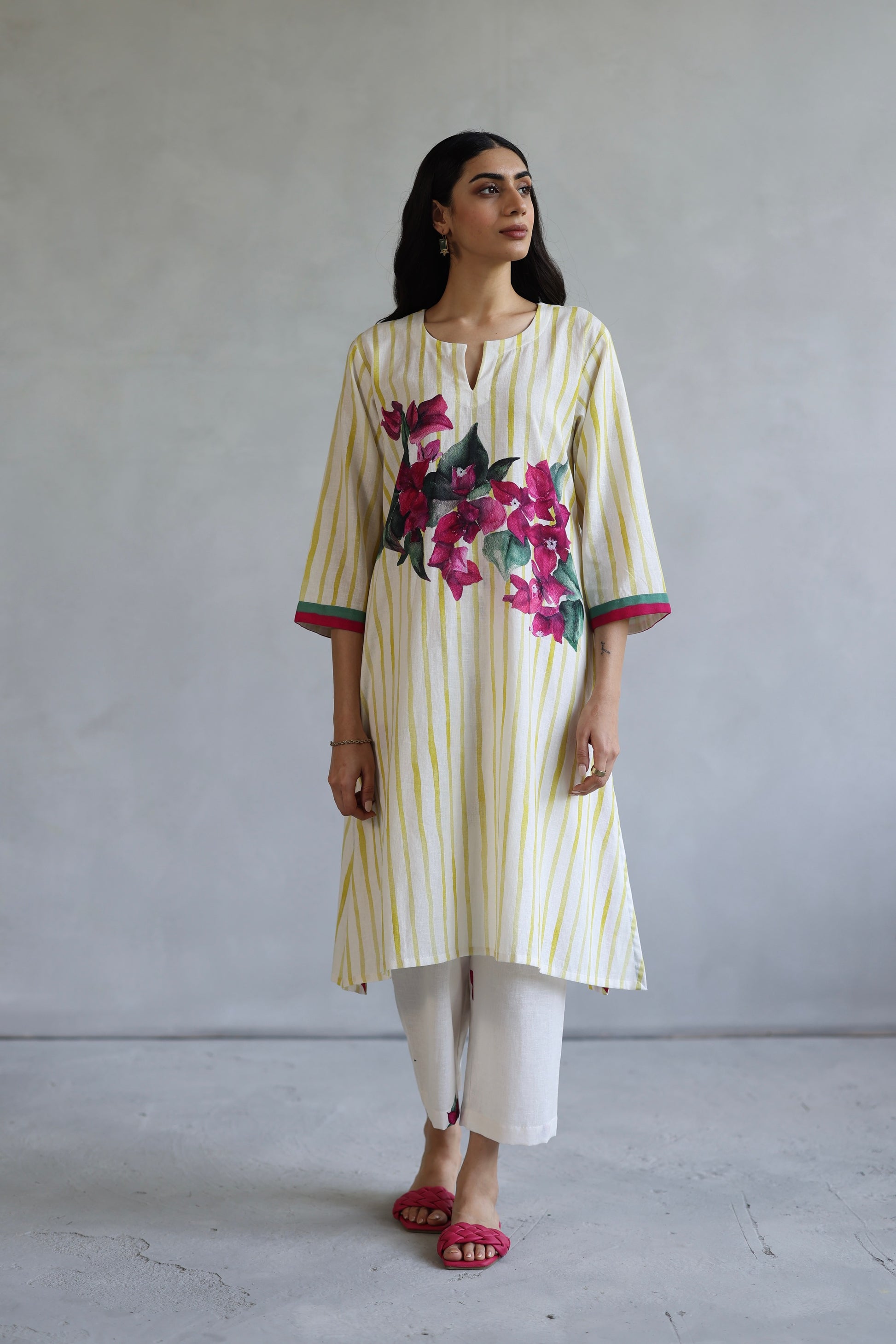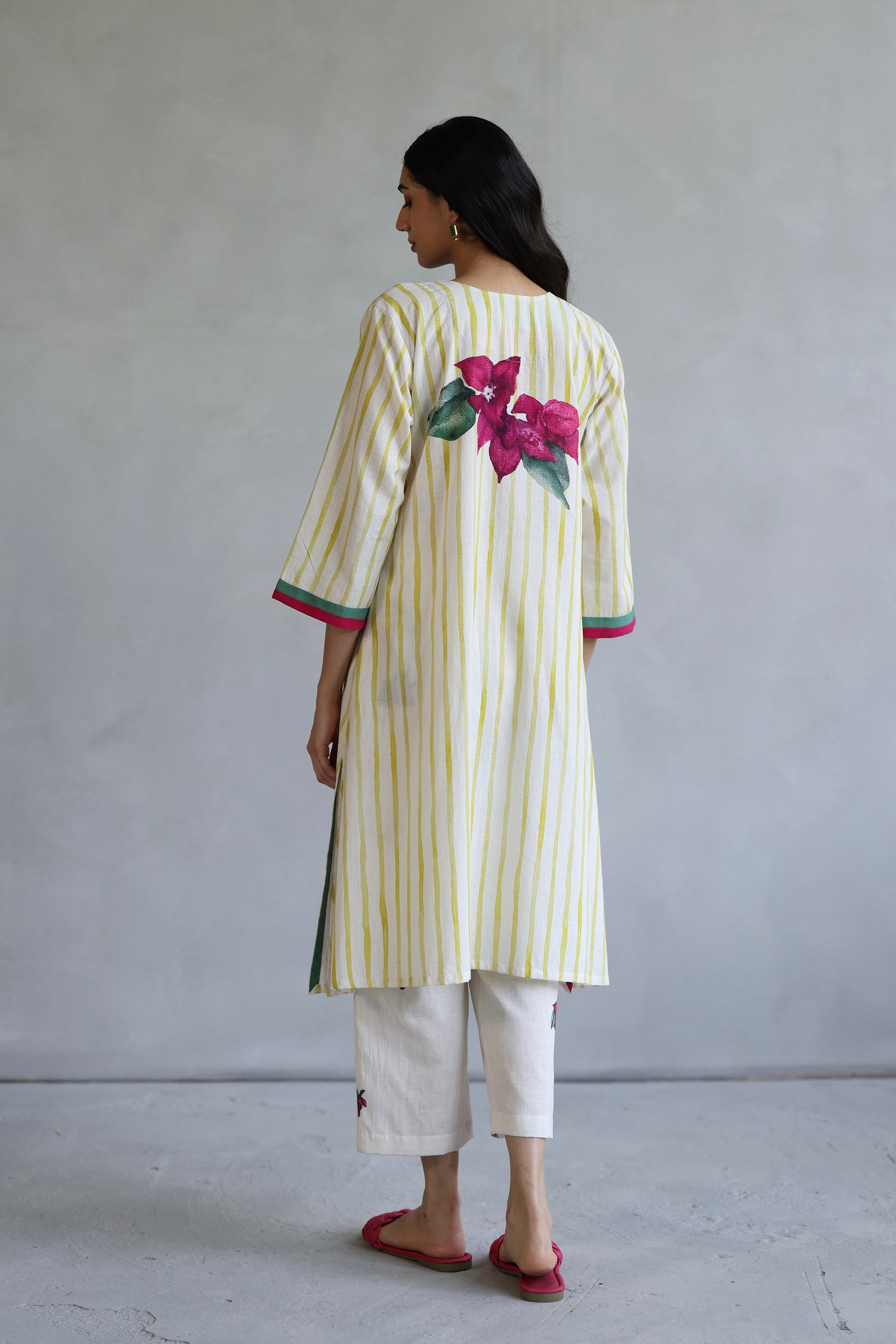 Effortlessly elegant, this white kaftan-style kurta is adorned with a delicate floral motif at the center, while minimal scattered blooms add a touch of understated charm. The contrast-colored v-neckline enhances its refined appeal, complementing the breezy silhouette. Paired with softly pleated pants, this set is a perfect blend of comfort and sophistication.