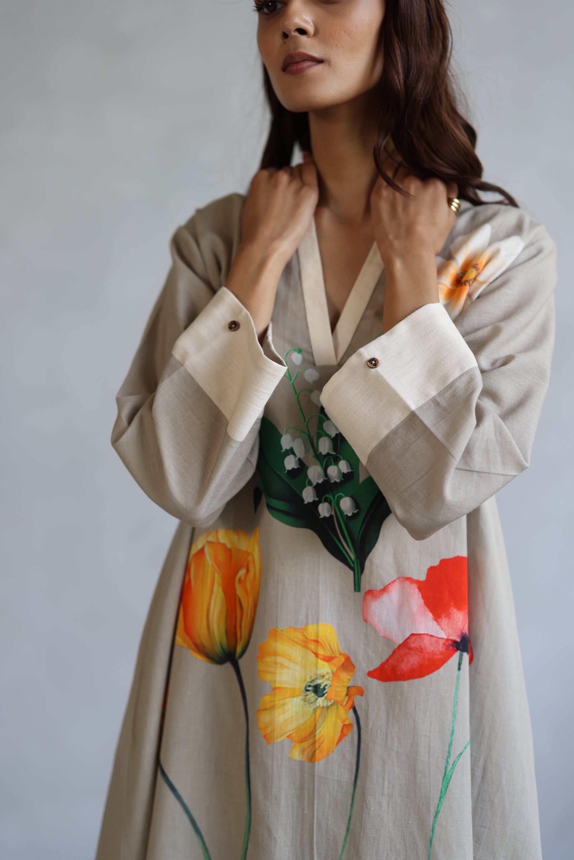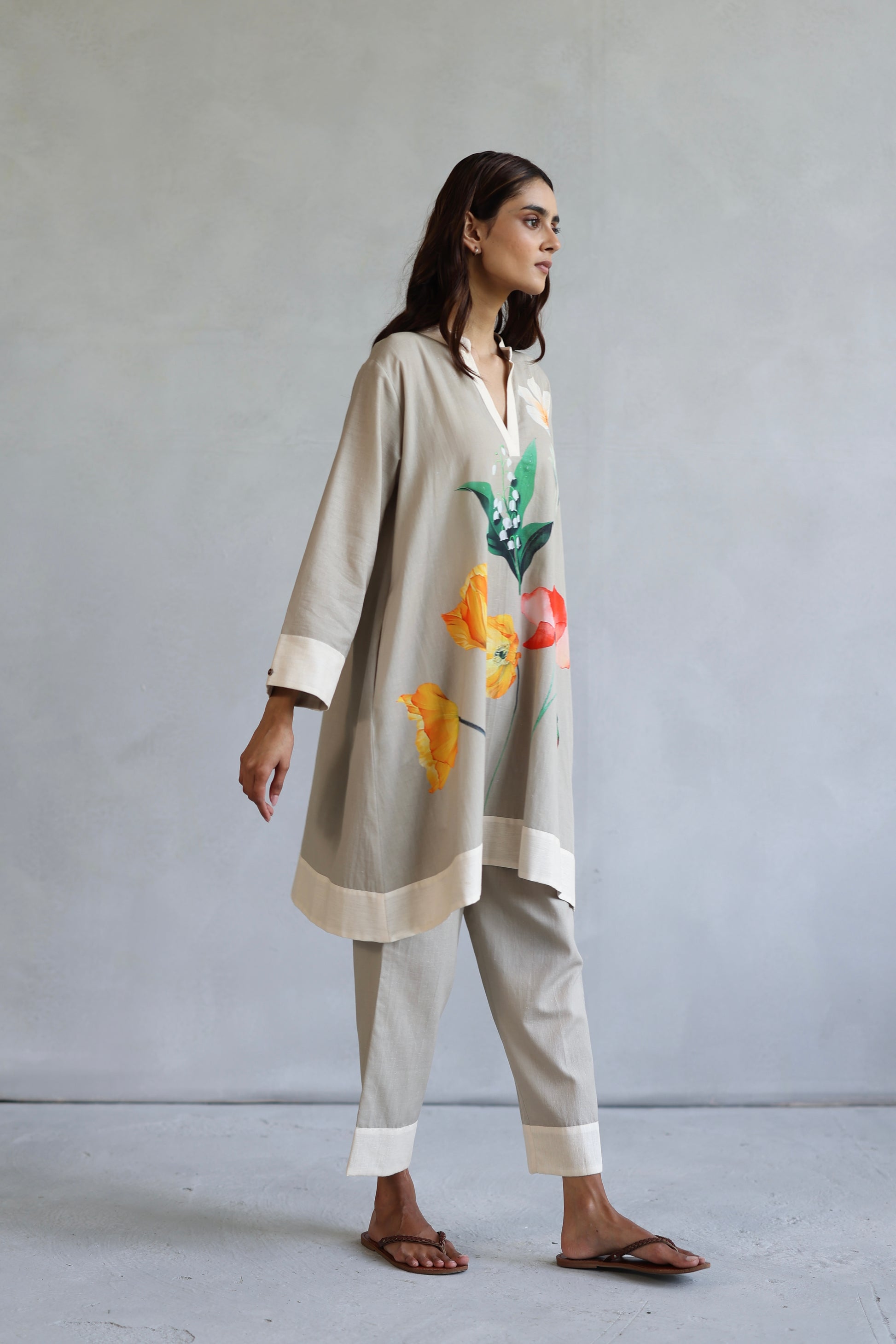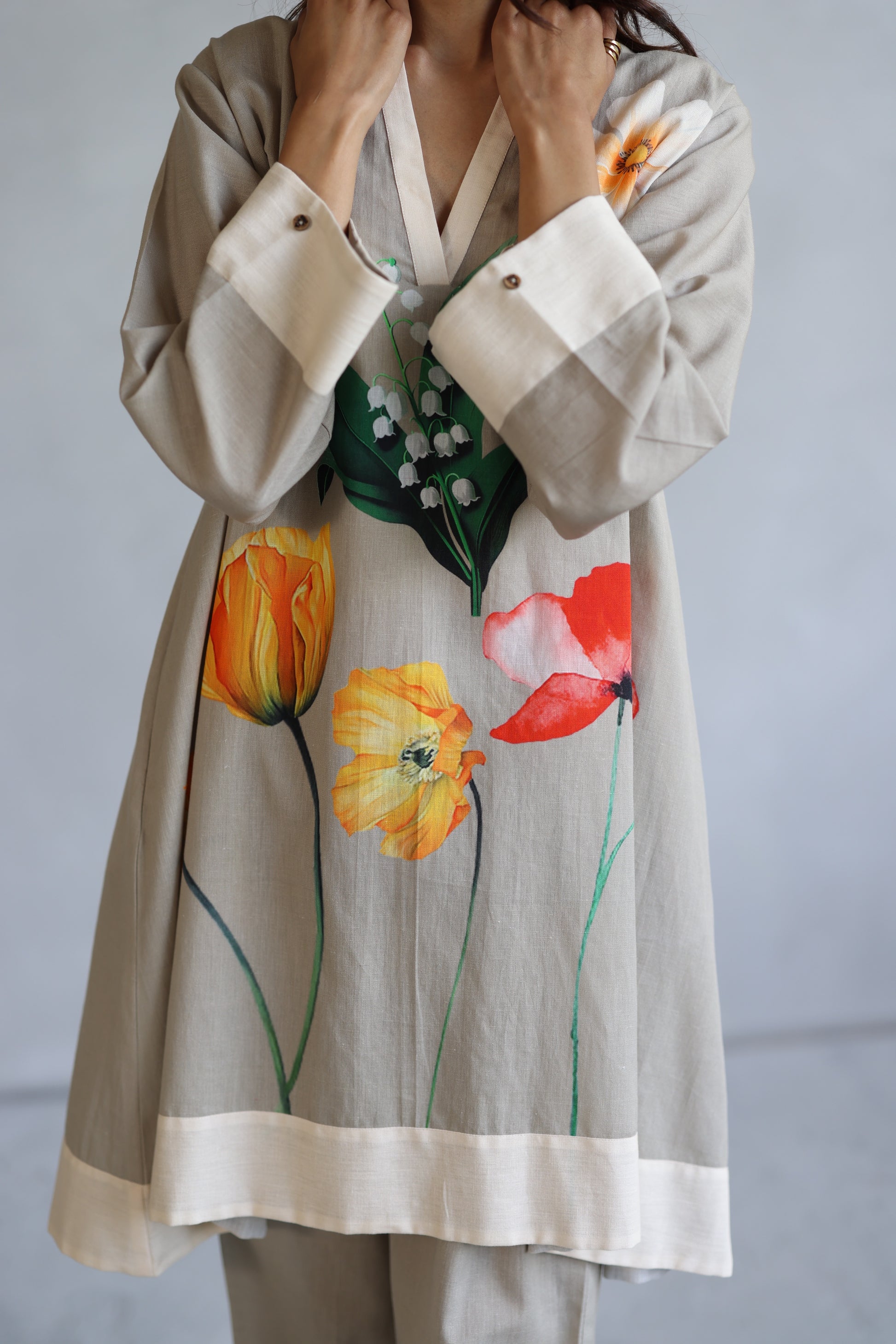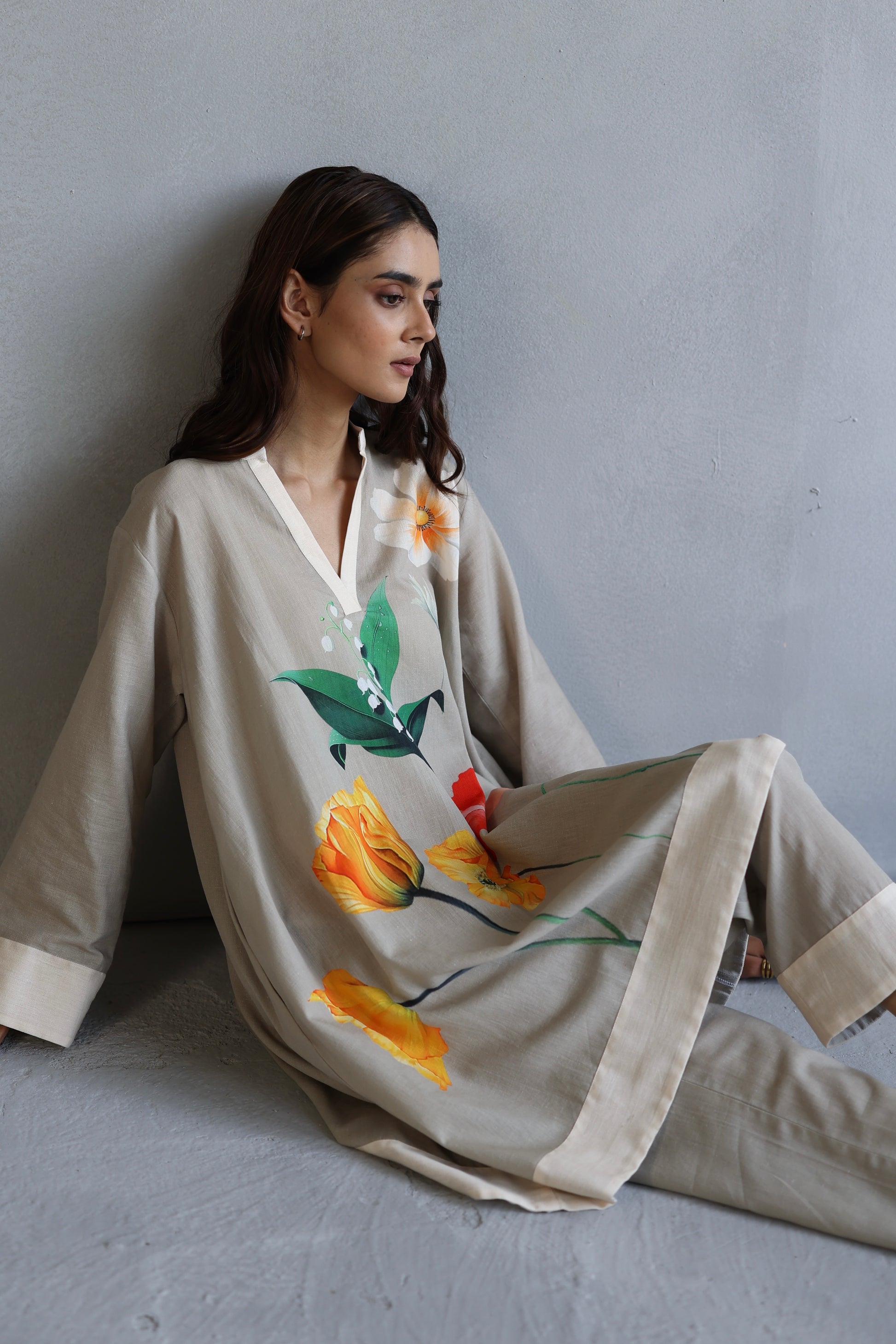 Crafted in breathable linen, this beige kaftan-style kurta is adorned with a bold floral motif, adding a touch of effortless charm. The contrast sleeves enhance its refined appeal, while the airy pants feature a complementing contrast border for a balanced look. Light, airy, and elegant, this set is perfect for all-day comfort and sophistication.