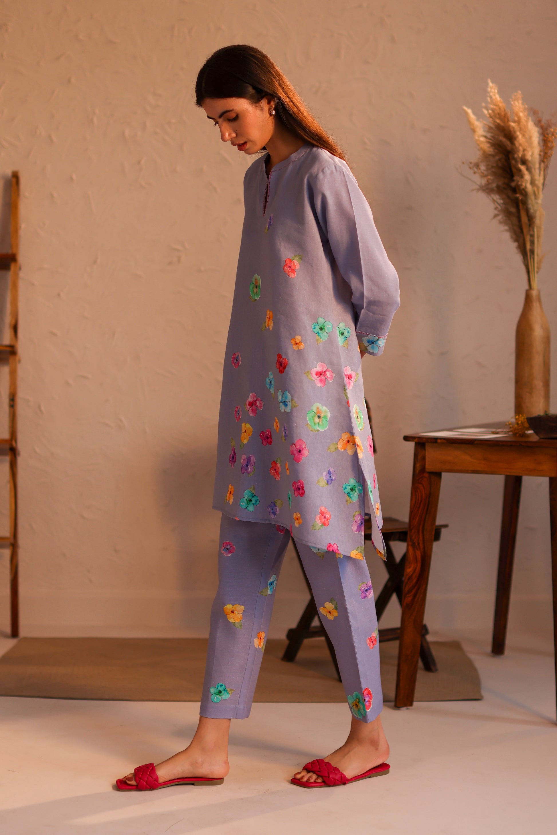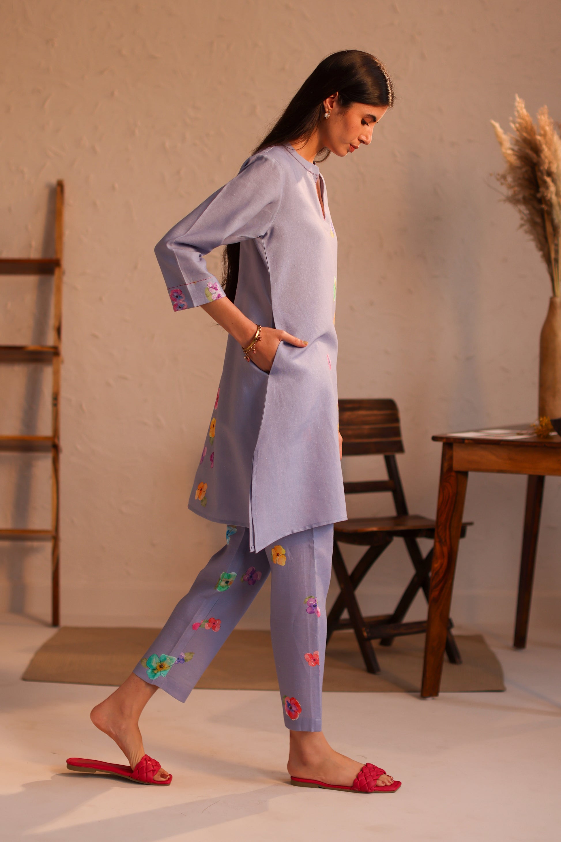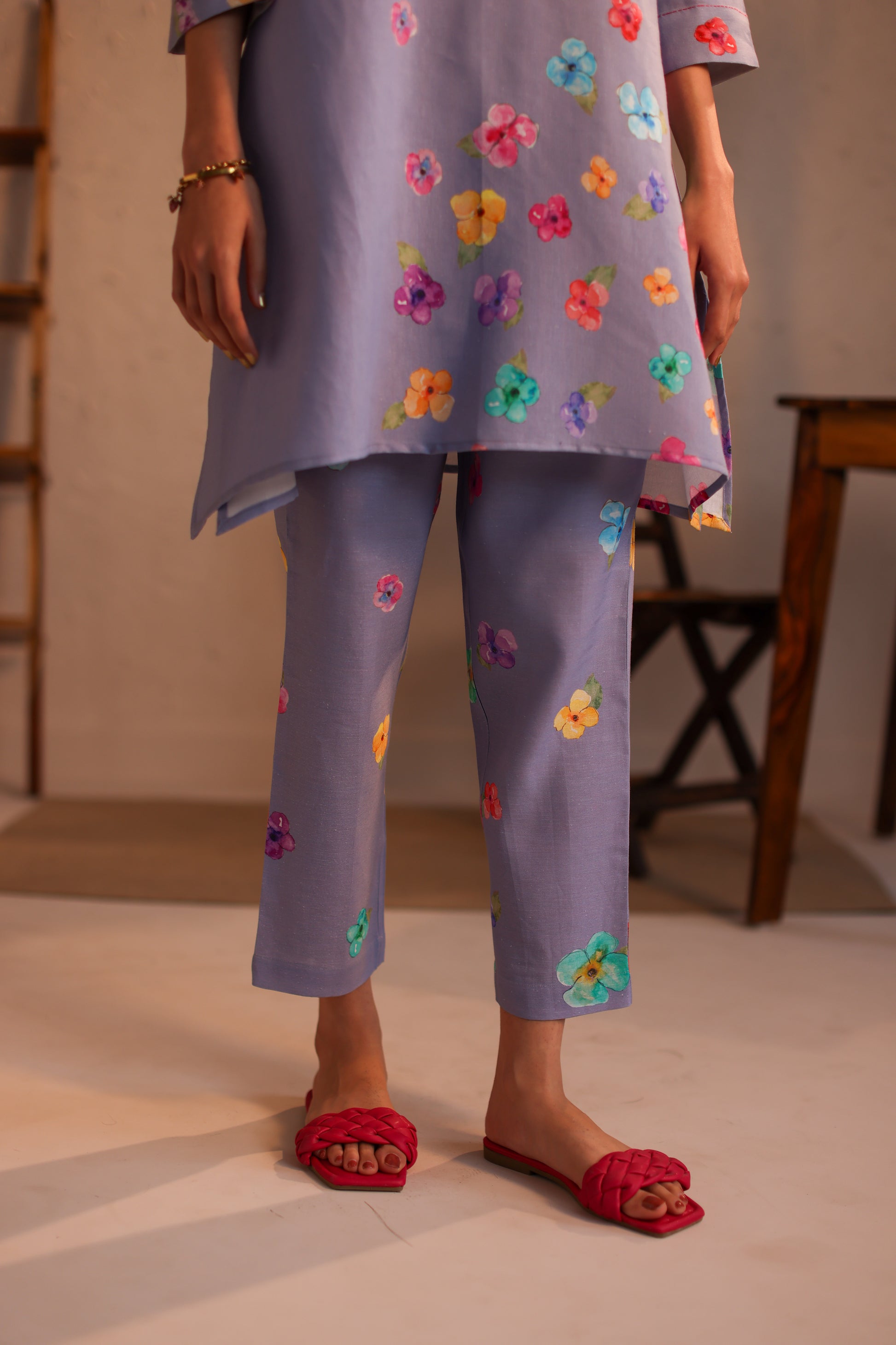 The limoncello pants have watercolour dainty pansies and can be combined with the limoncello kurta or the limoncello top.