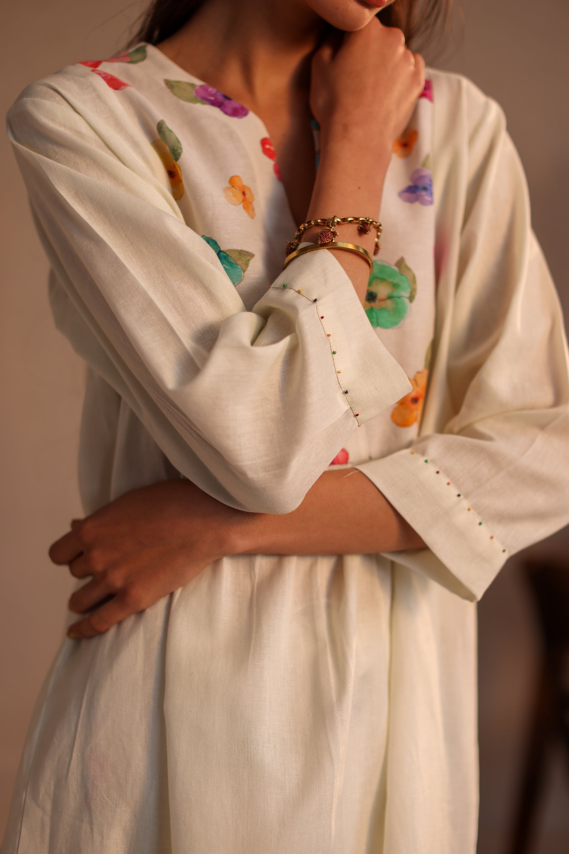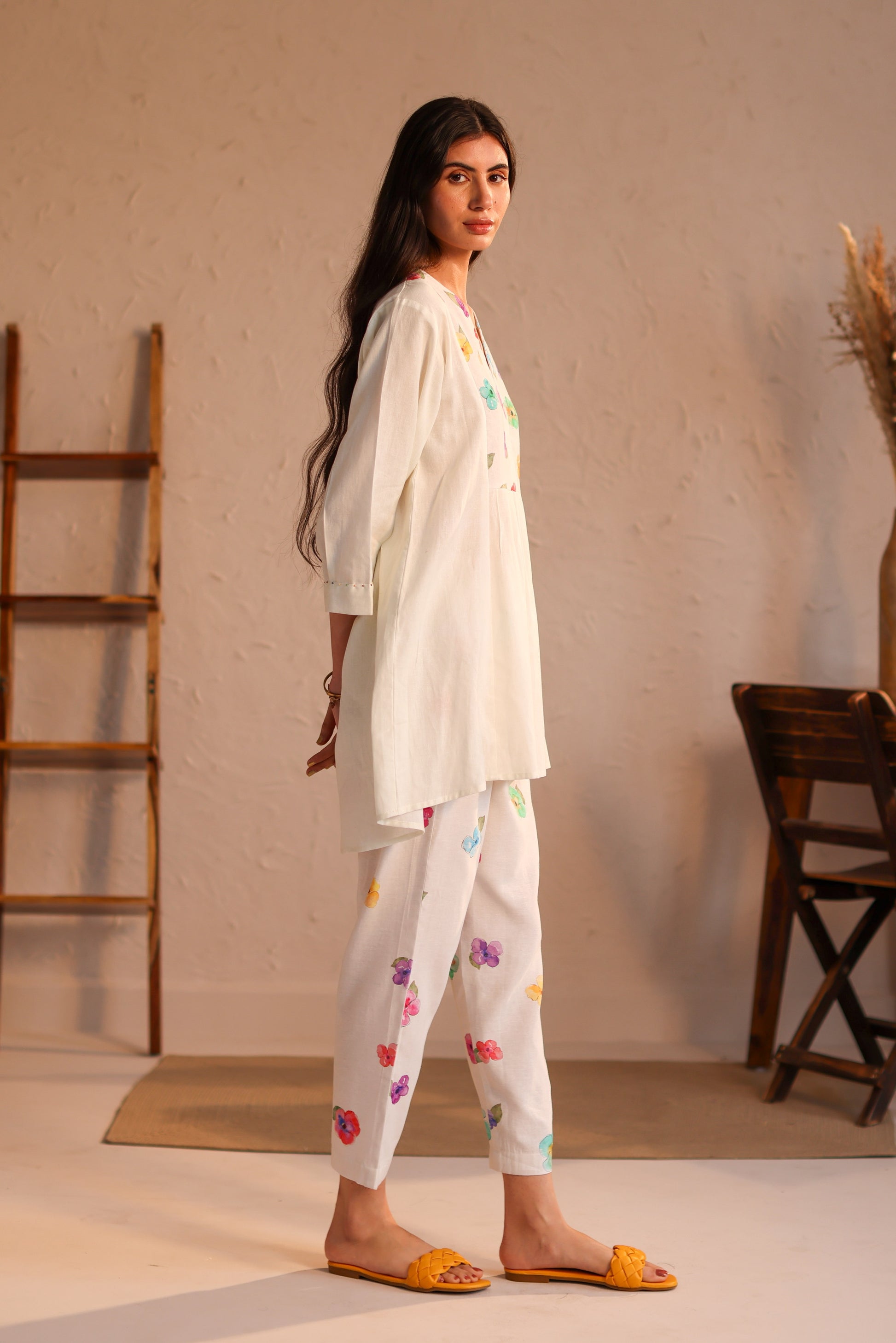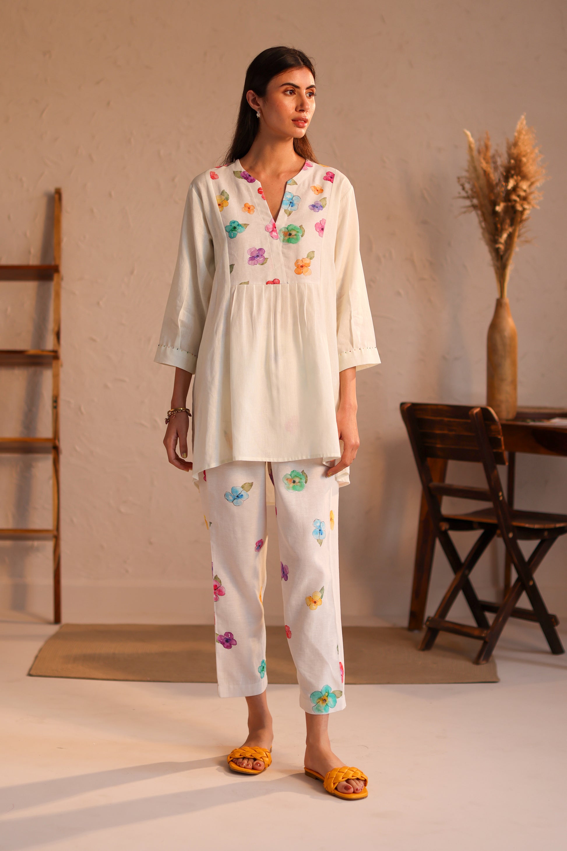 The limoncello top is a short length top in an a-line with watercolor pansies across the yoke. The sleeves are finished off with hand embroidered accents and can be paired wit the limoncello pants.